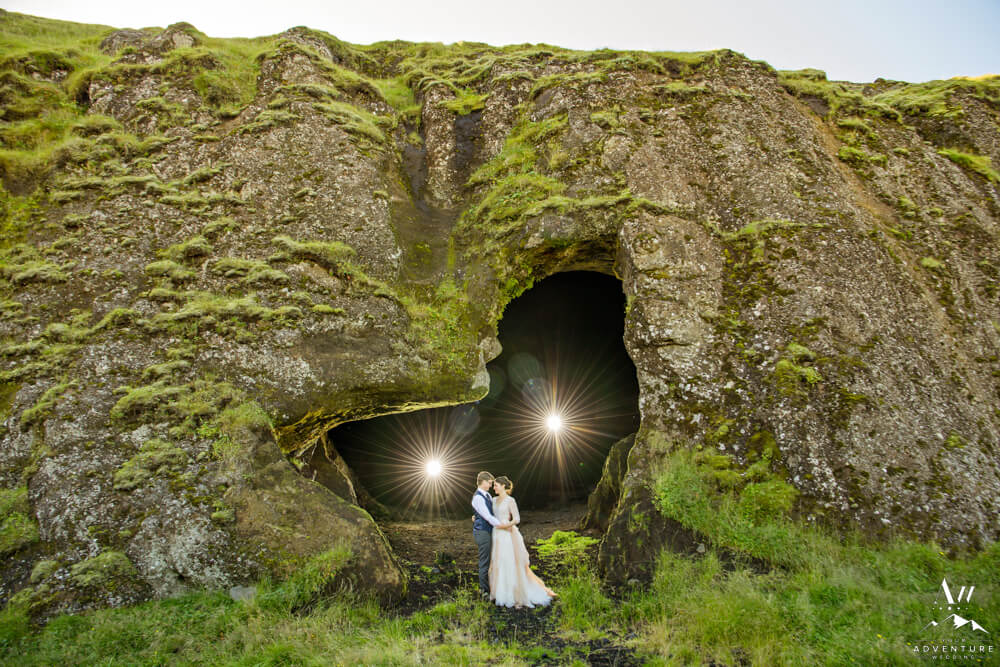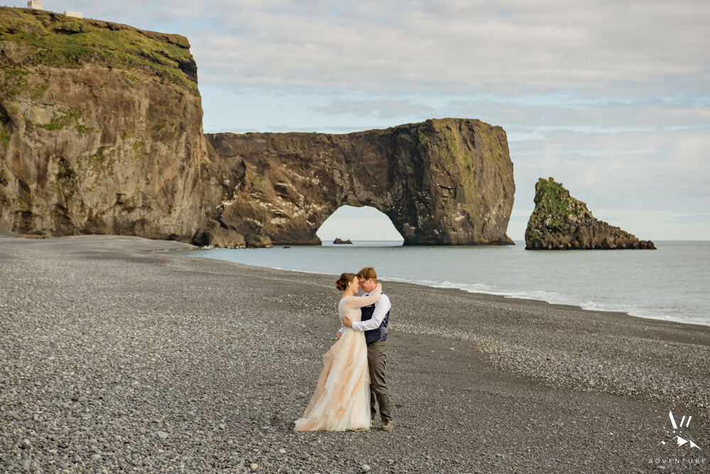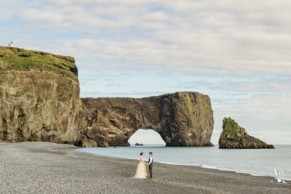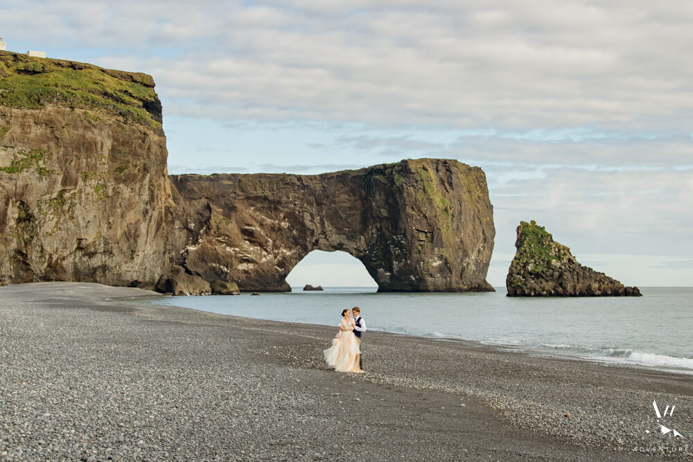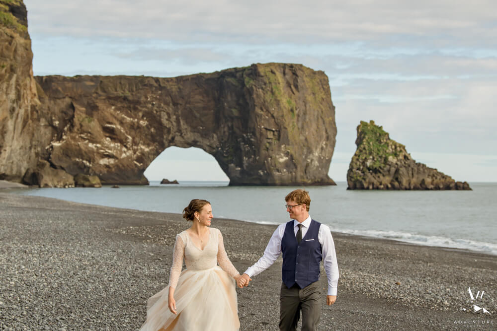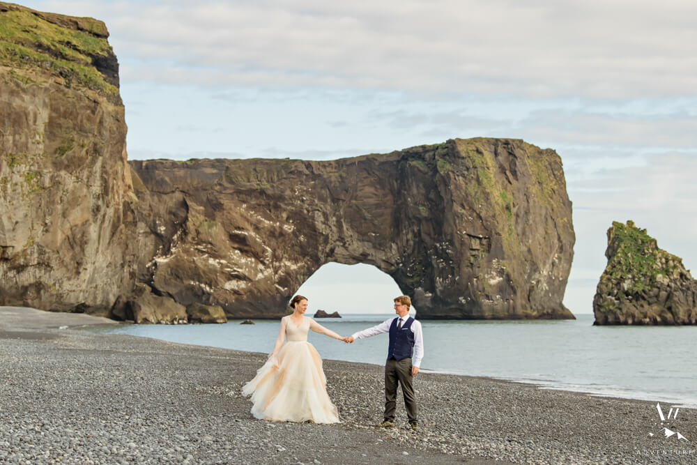 Frolicking around on a black sand beach on your hiking wedding day just makes freaking sense! In fact, there is something about this private side of Dyrhólaey that centers you with nature. I don’t know if it’s a calmness of the beach, crashing waves, or massiveness of the arch. But there, you will be in the moment and if you’re lucky time will stop.