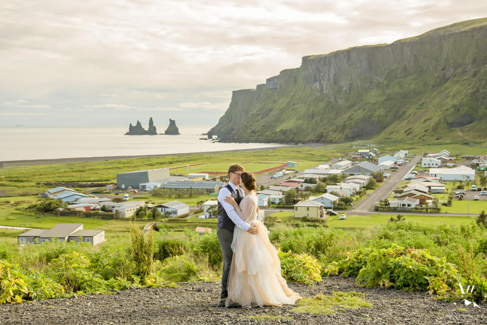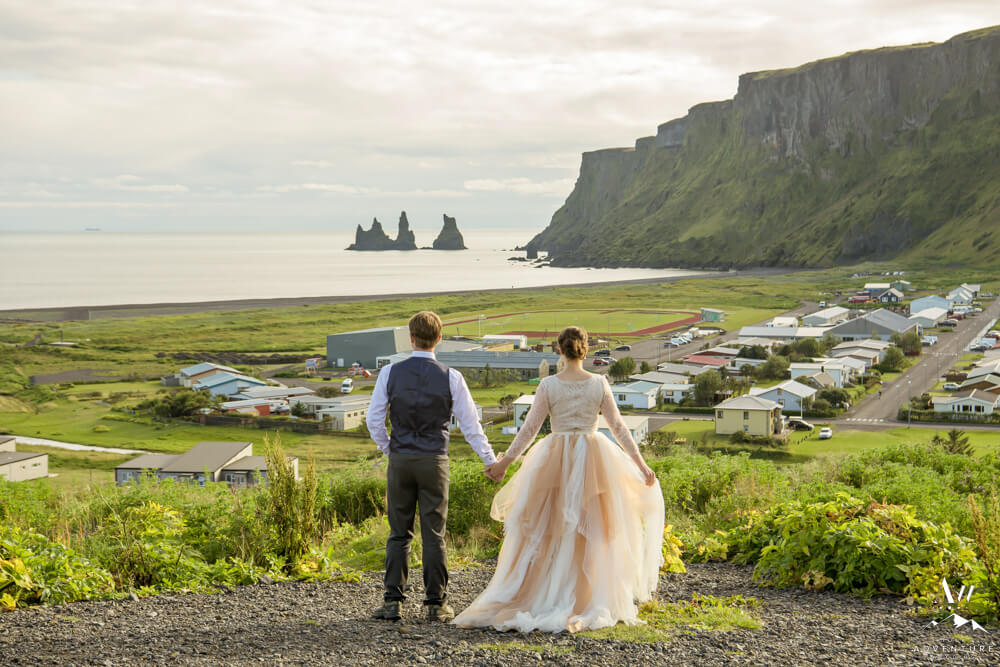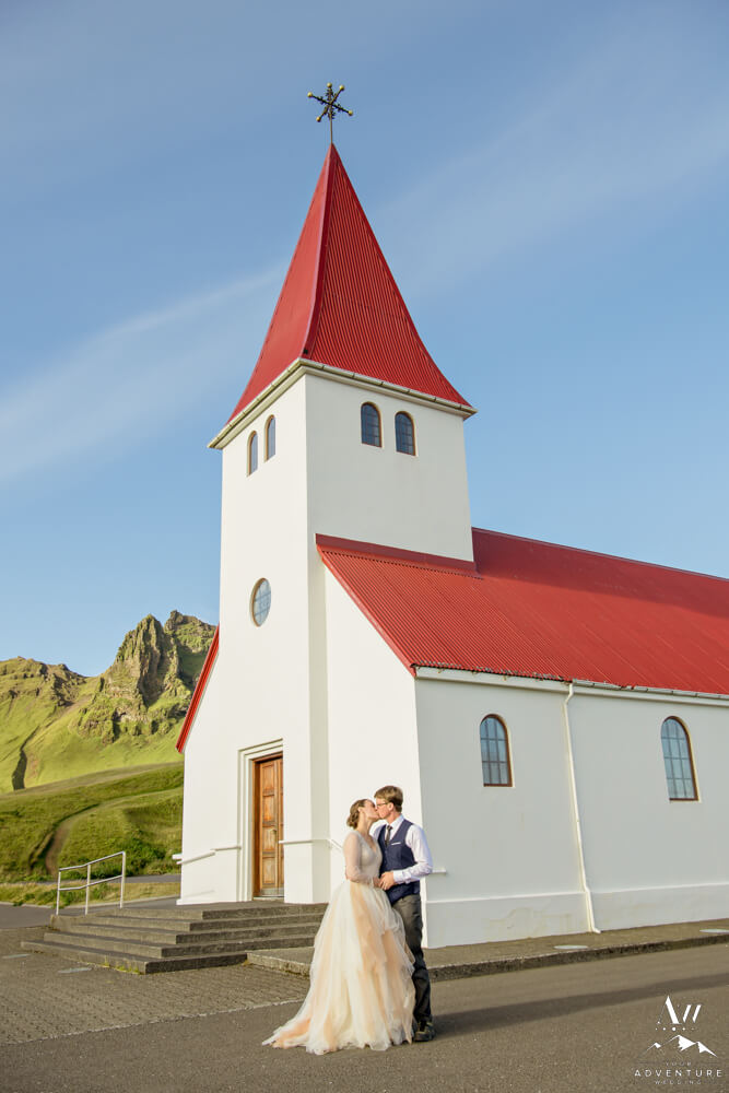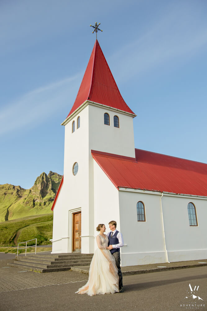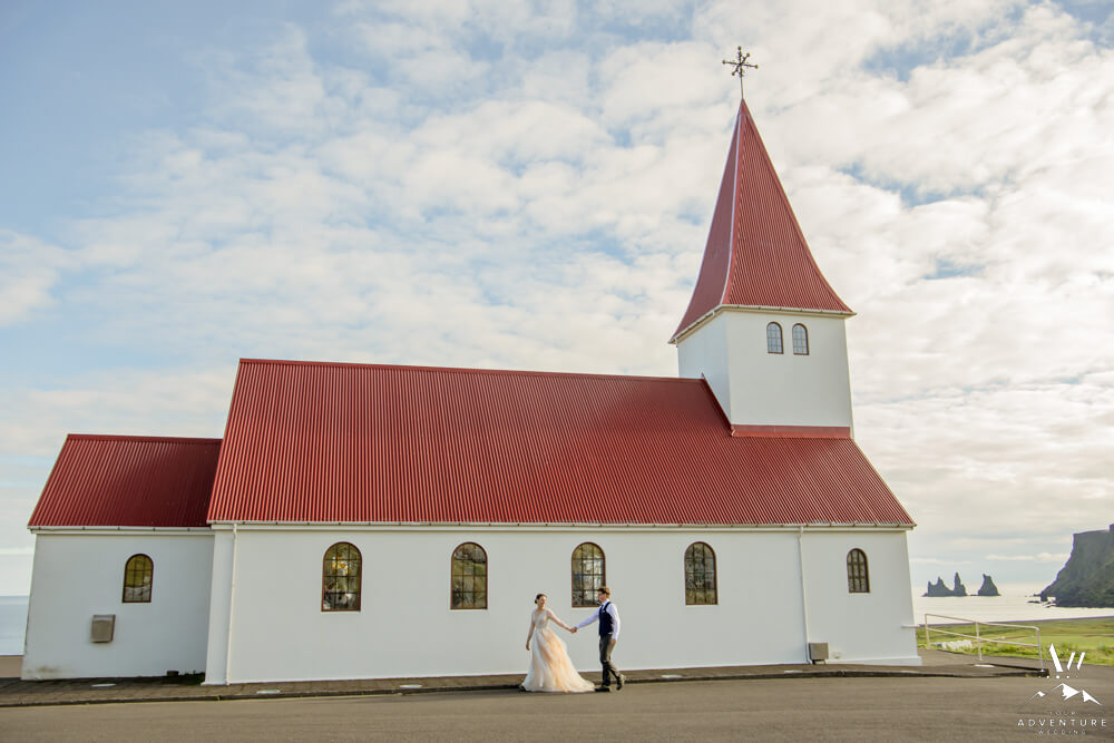 There is the most adorable church that sits high above the town of Vik. It has the iconic colors of red and white and offers a grand view of Reynisdrangar. Likely why Sarah and Will were drawn to having this recognizable spot as part of their hiking wedding adventure.