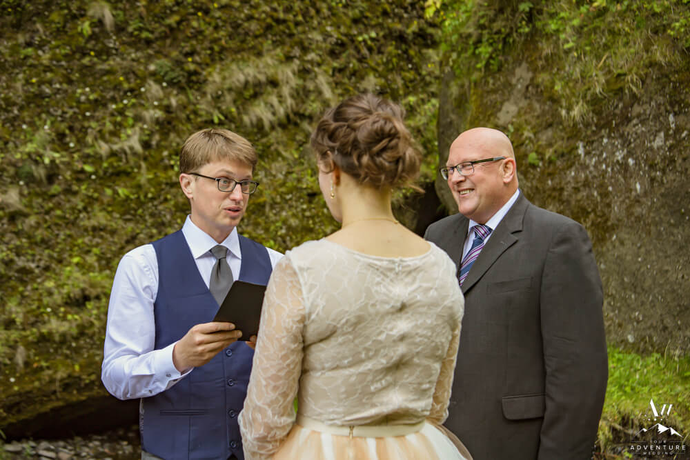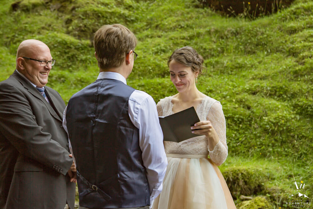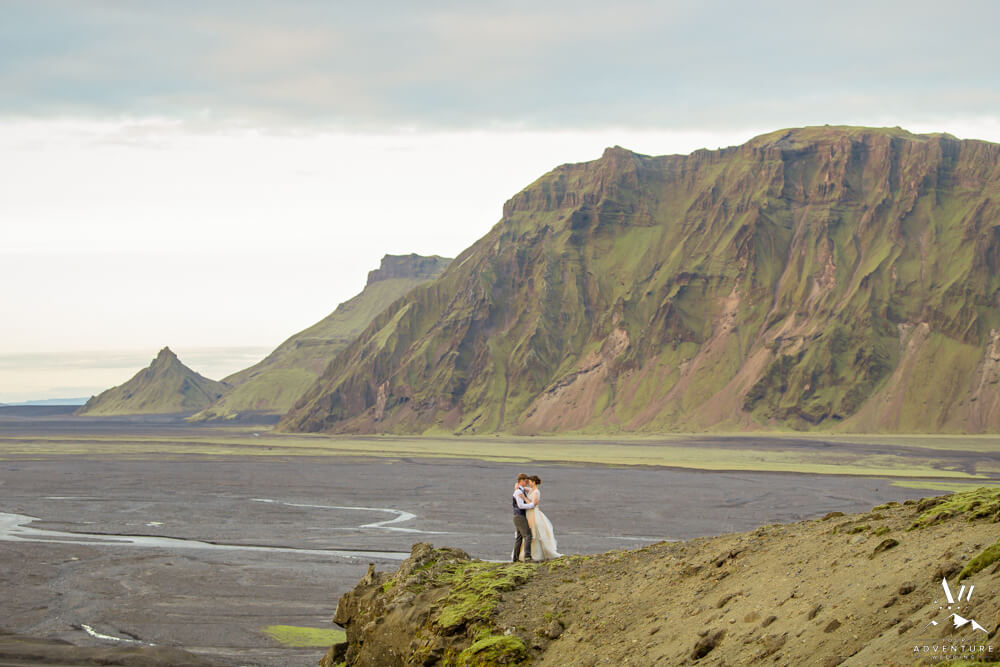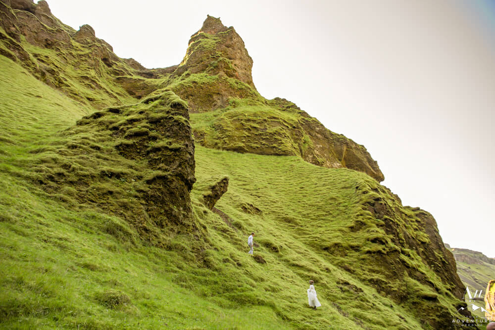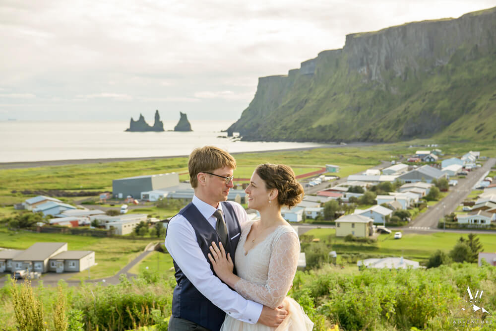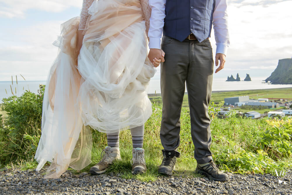 There is the most adorable church that sits high above the town of Vik. It has the iconic colors of red and white and offers a grand view of Reynisdrangar. Likely why Sarah and Will were drawn to having this recognizable spot as part of their hiking wedding adventure.