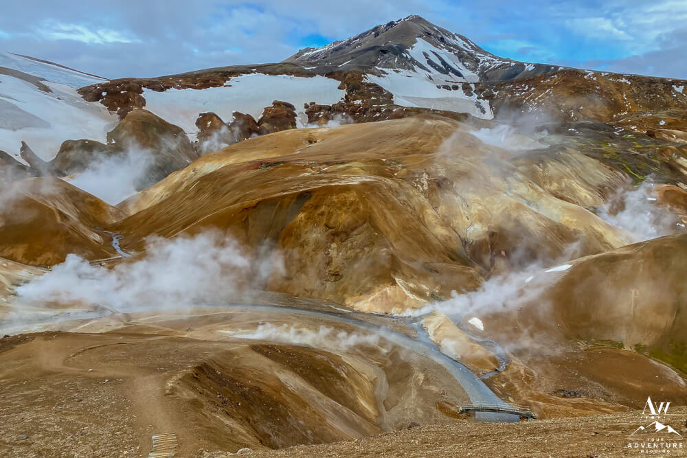 In the central highlands of Iceland, there is a spectacular geothermal area named, Kerlingarfjöll. Over 4,800 feet tall and underneath runs a 38 square mile volcanic system. There are several hiking trails you can spend your day hiking on. For instance, the hikes range from 1-5 hours). Also nearby is an offbeat highland hot spring worth hiking to too!