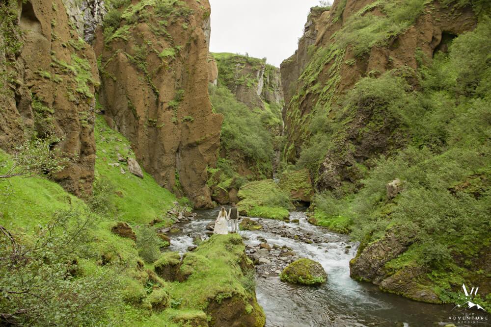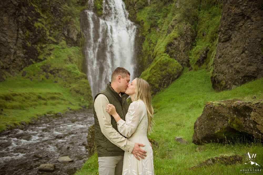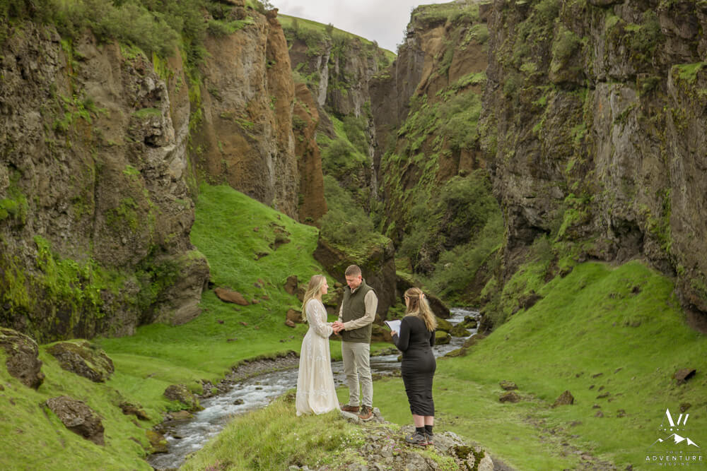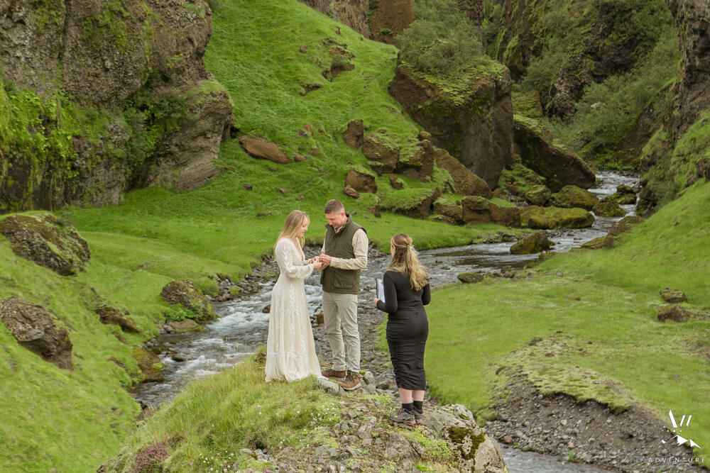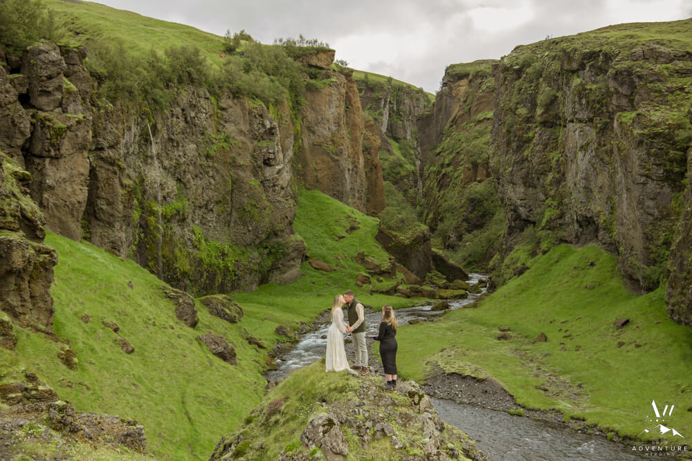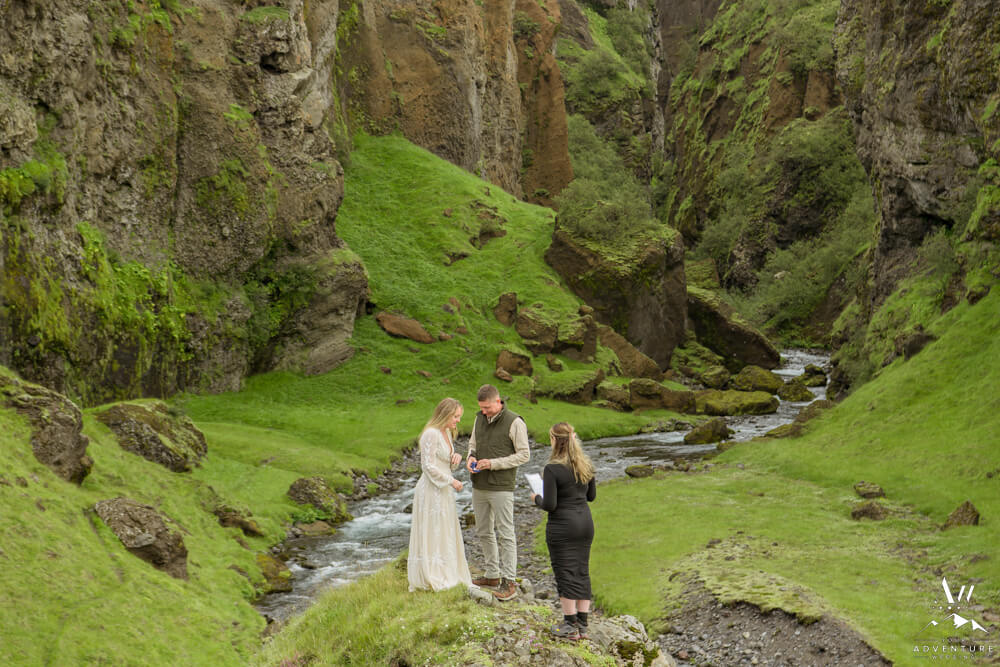 Now on to the summer vow renewal!  Firstly, that fabulous July morning, Greg and Savannah from Huntsville, Alabama met our Iceland Wedding Planner team at a private property canyon.  Second, following a short hike, these two held an adventurous vow renewal atop a cliff within the canyon.  Third, within their intimate ceremony, they exchanged personal vows, rings (Greg surprised her with a new one), and kisses!  Furthermore, the weather in Iceland held too, so it could not have been more perfect!