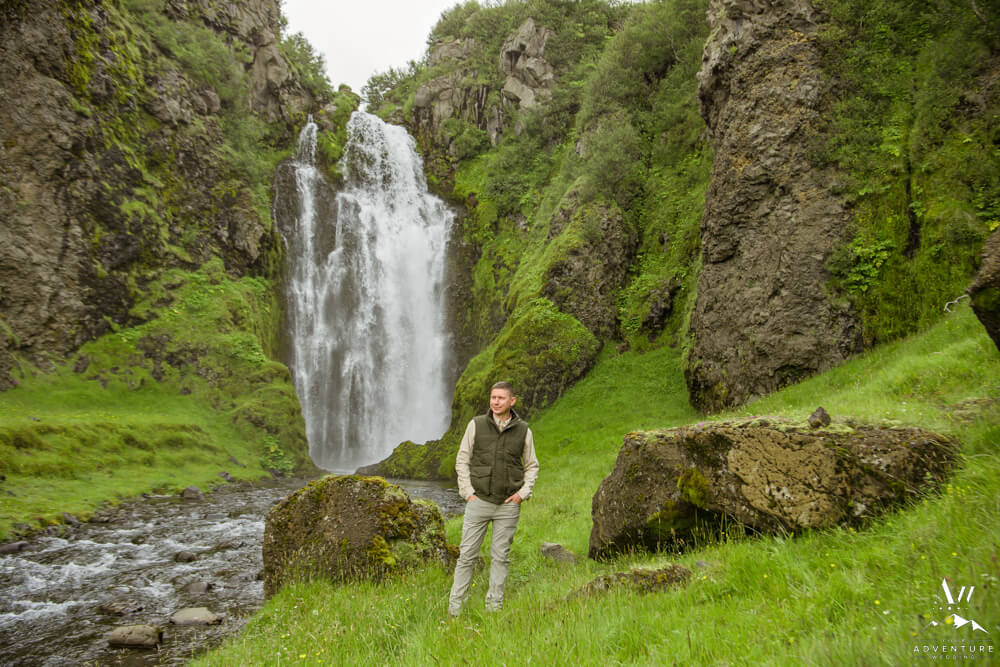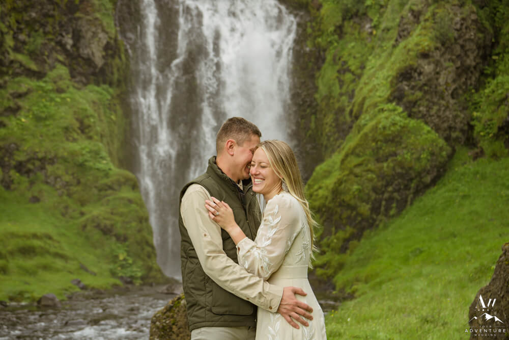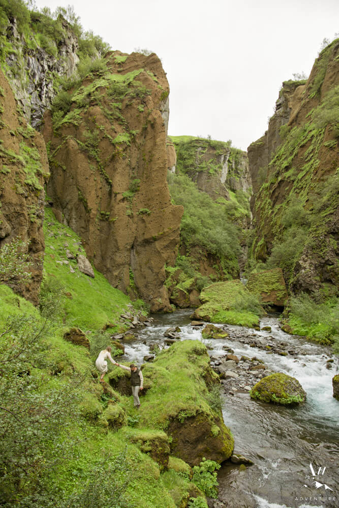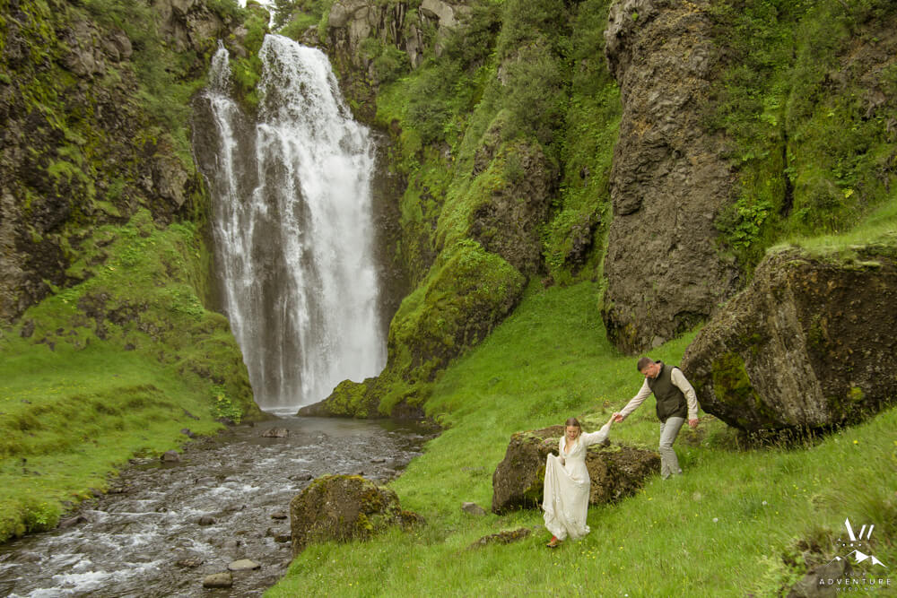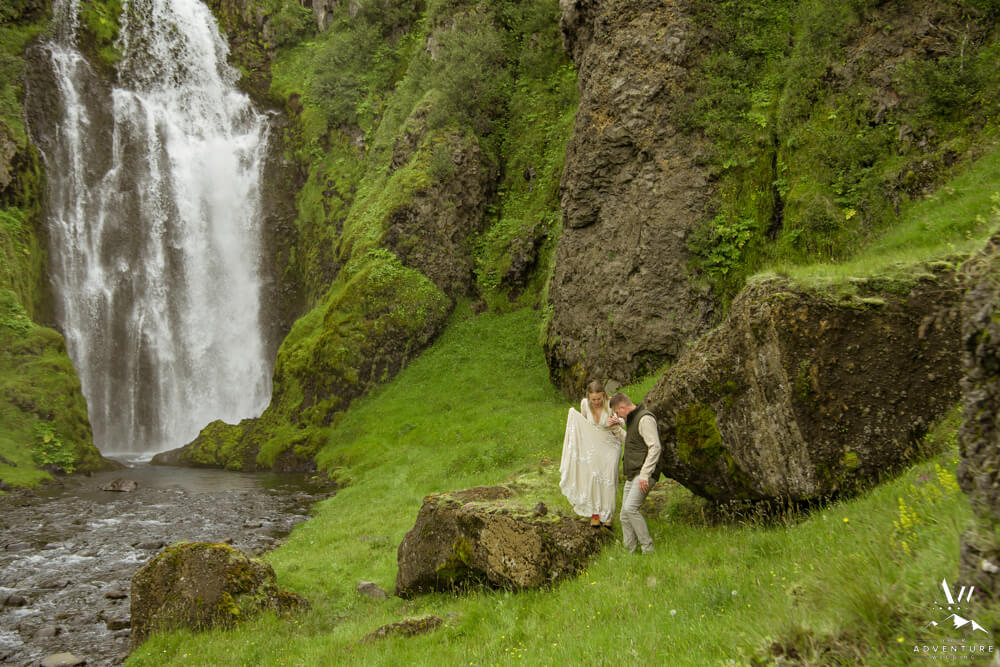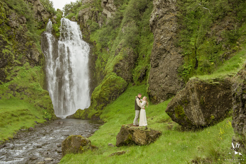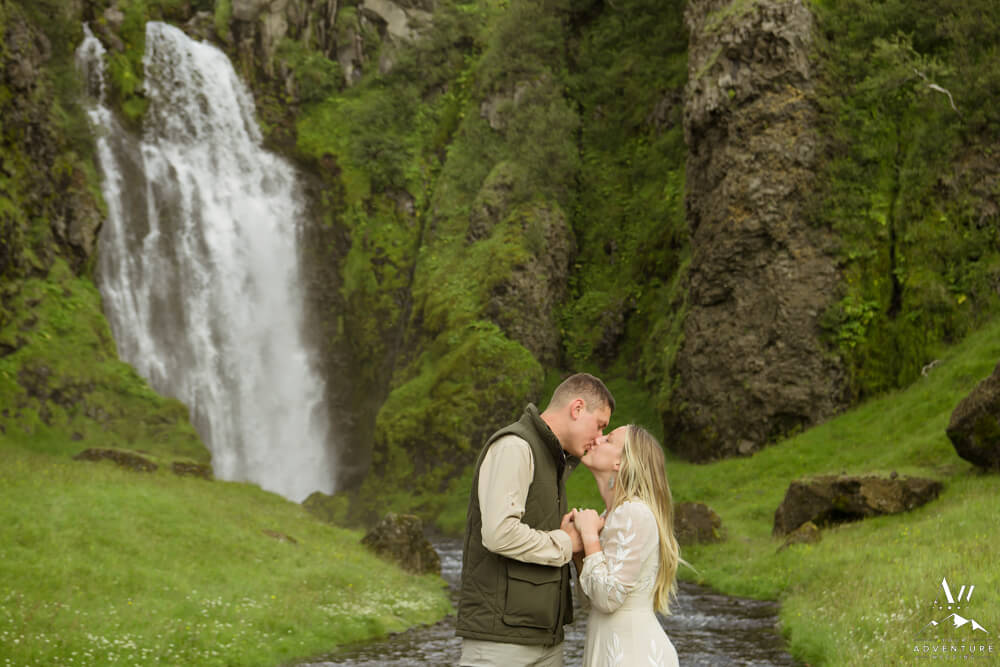 Now on to the summer vow renewal!  Firstly, that fabulous July morning, Greg and Savannah from Huntsville, Alabama met our Iceland Wedding Planner team at a private property canyon.  Second, following a short hike, these two held an adventurous vow renewal atop a cliff within the canyon.  Third, within their intimate ceremony, they exchanged personal vows, rings (Greg surprised her with a new one), and kisses!  Furthermore, the weather in Iceland held too, so it could not have been more perfect!