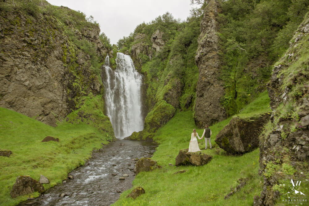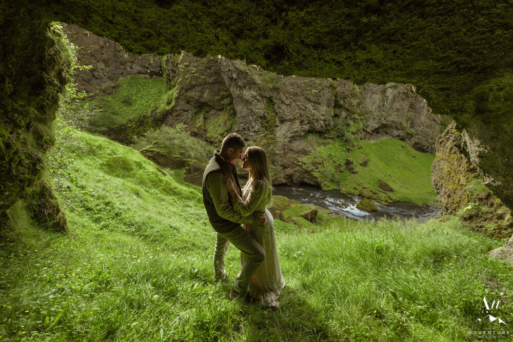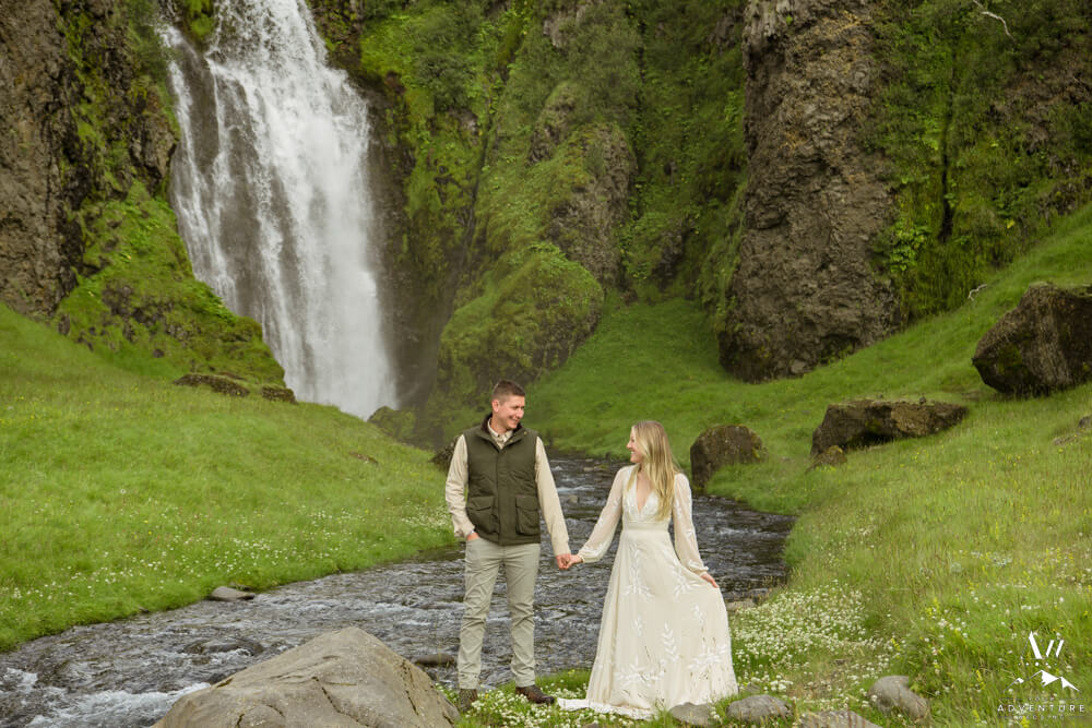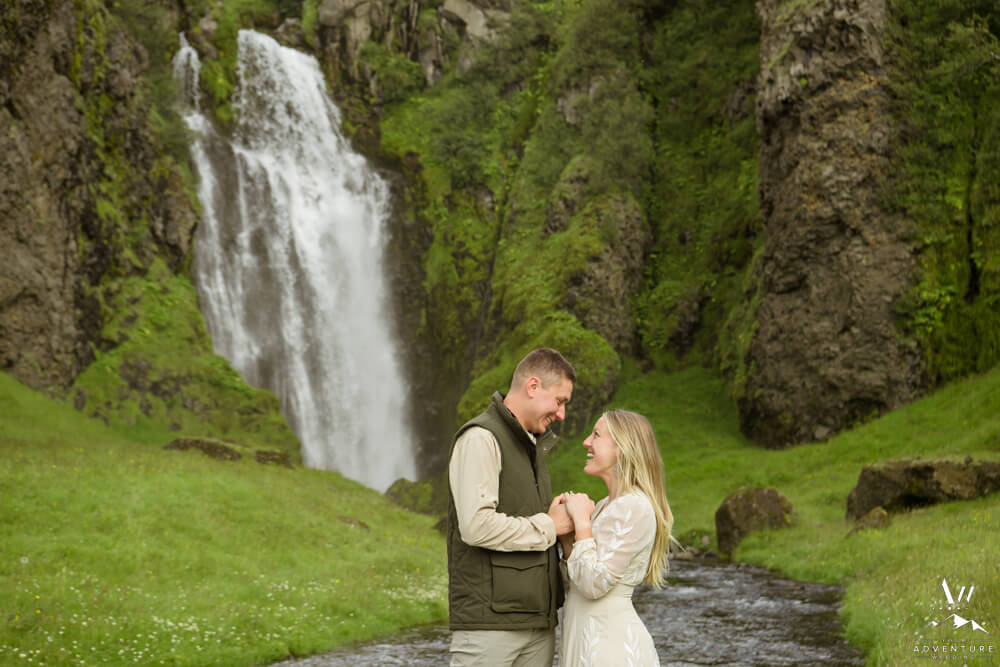 Adventurous couples who love to camp and hike, often travel to Iceland during summertime.  After all, camping is the nicest when it’s fair weather and warmer temperatures!  Likely why Savannah and Greg chose to rent a camper van to self-drive around Iceland in July to celebrate a milestone anniversary of 9 years!  Therefore, checkout their beautiful Summer vow renewal at a private property canyon and waterfall…