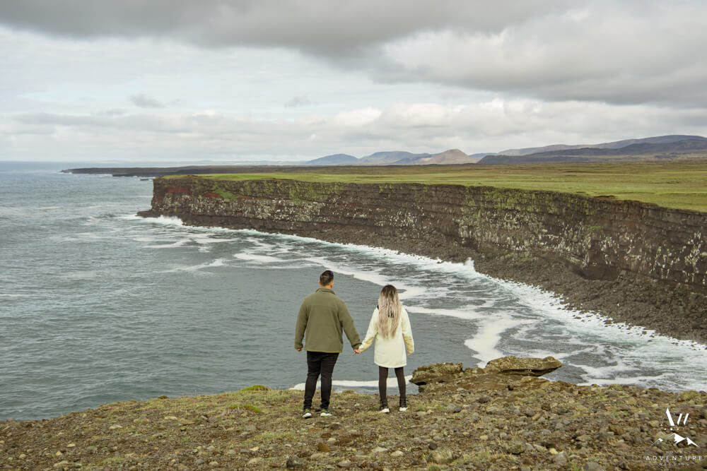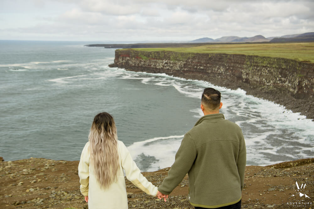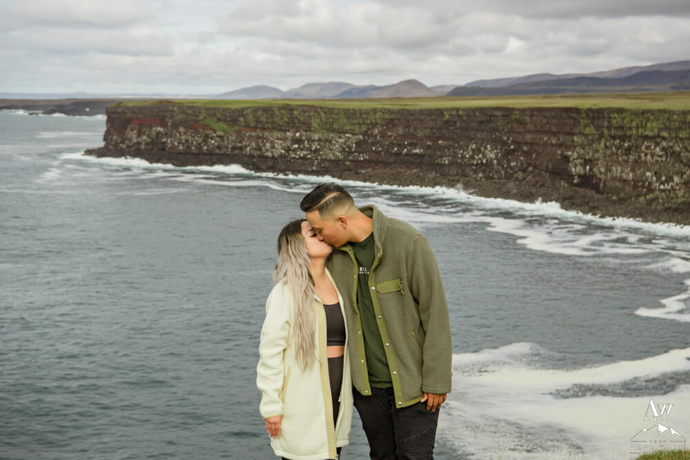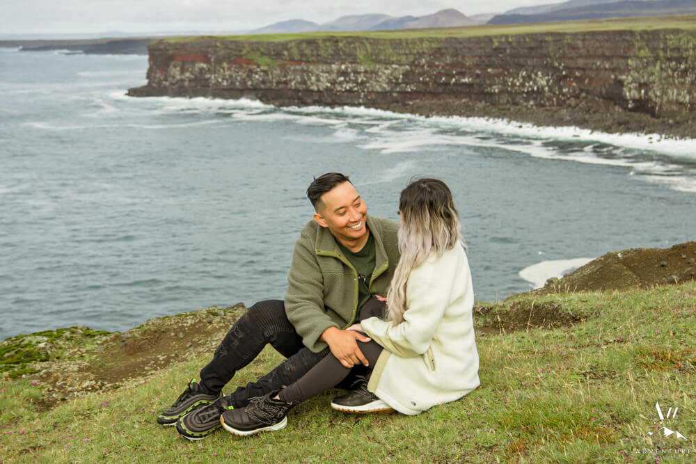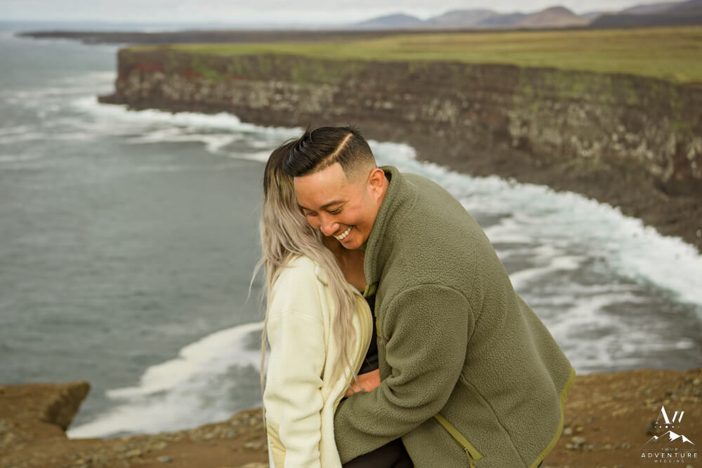 The newly engaged pair continued to explore Krýsuvíkurbjarg together. Admiring the waves, colors, and bird life alongside Leslie’s stunning new bling! Happiness oozed from them both!!