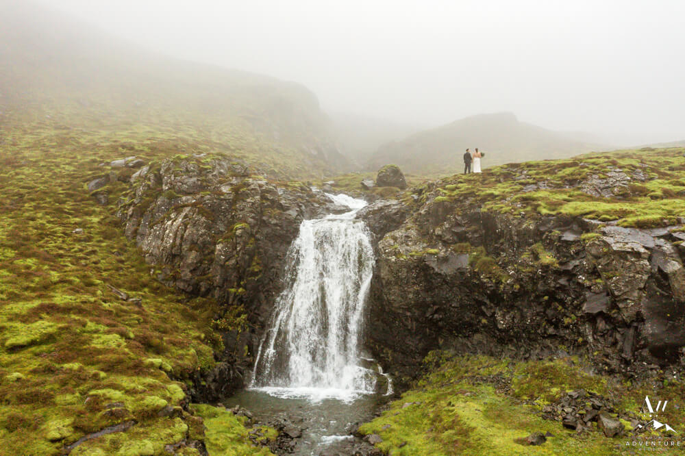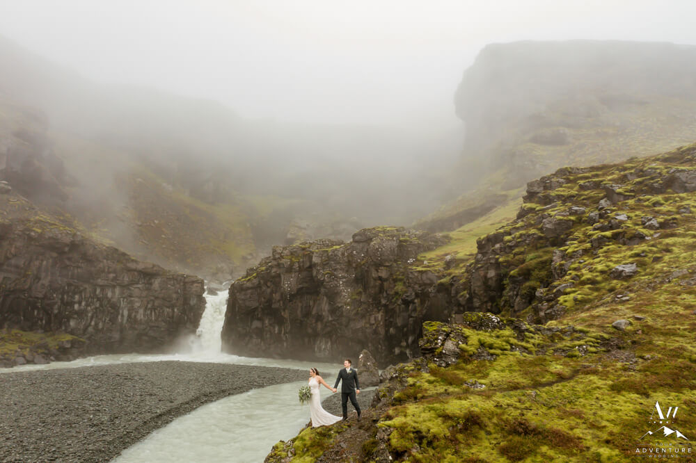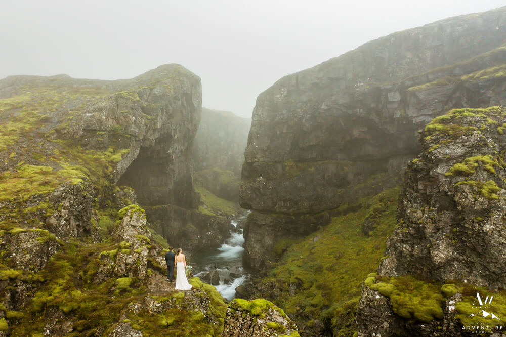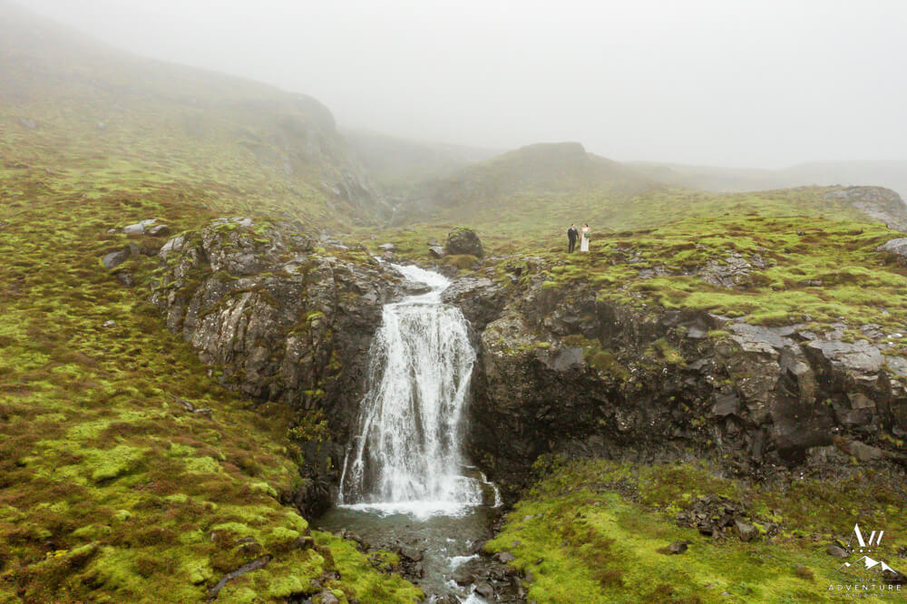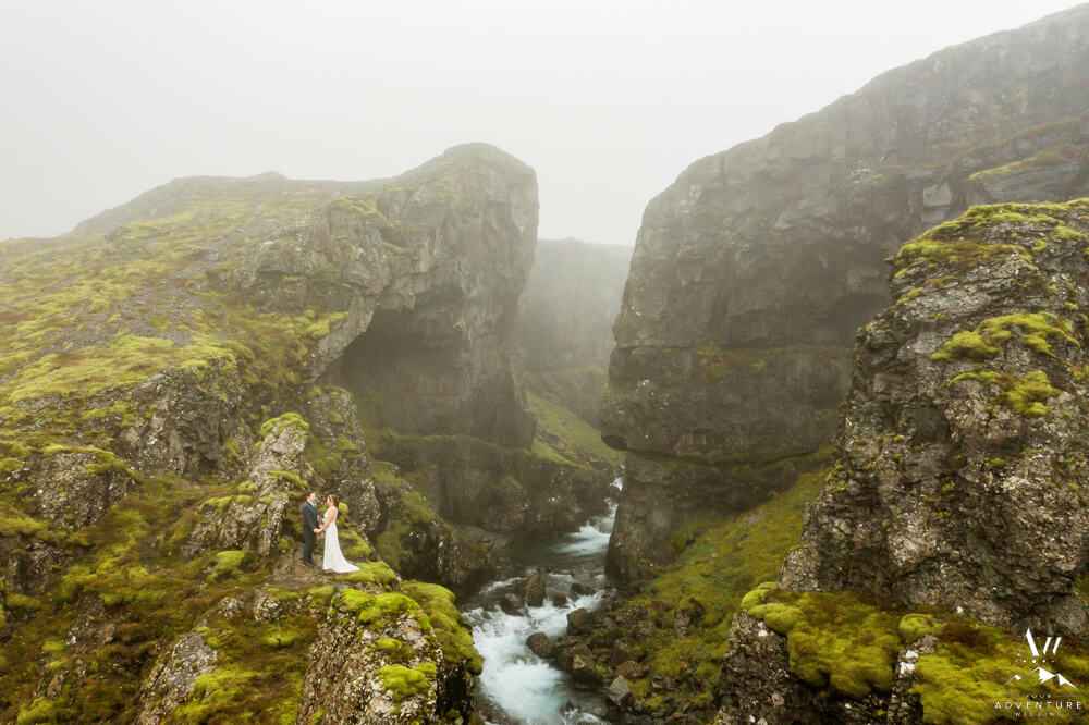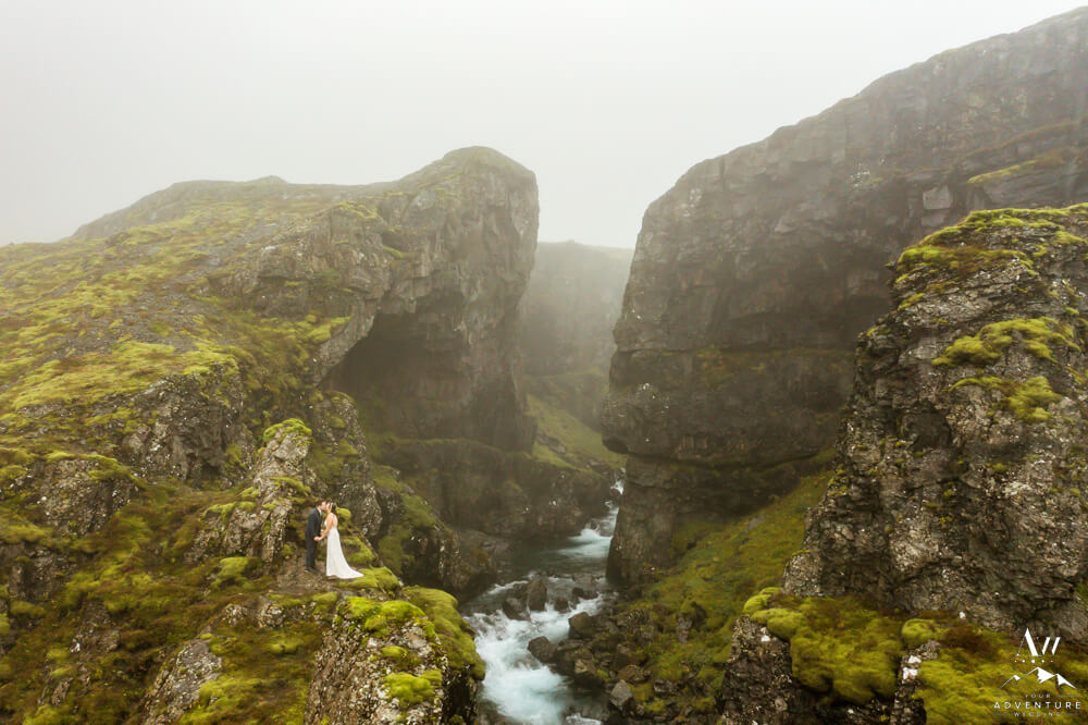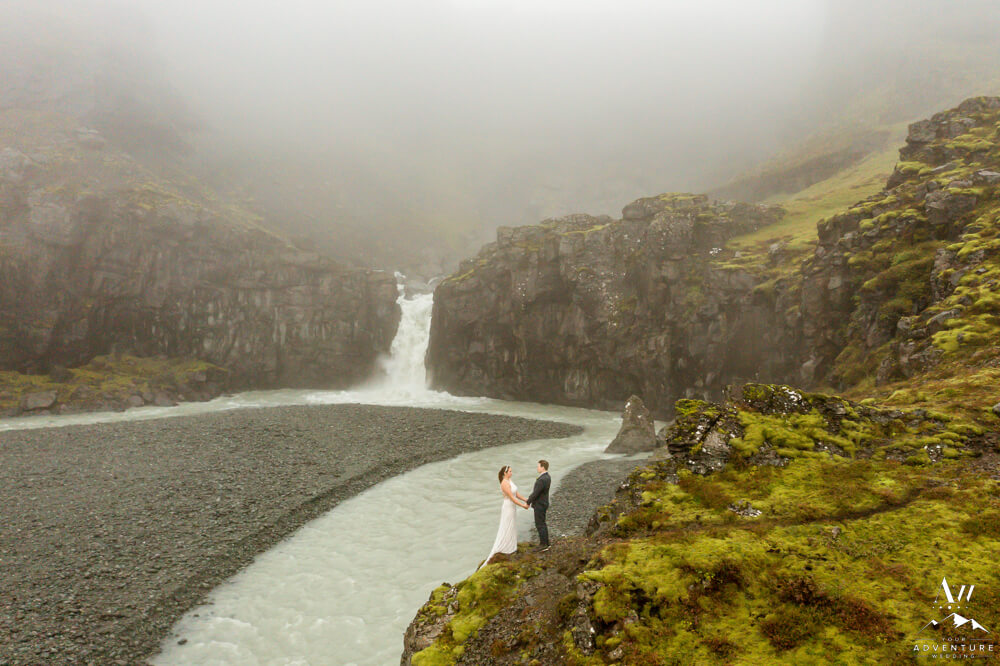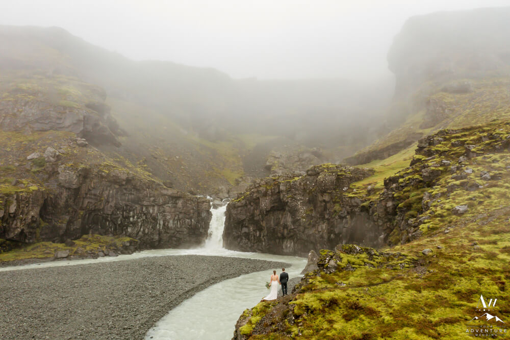 After a longer hike than the first, it was time to adventure to a foggy canyon area which was perfectly captured via drone by our Iceland elopement photographer. For example, the mist, fog and raging river crossings really added to the dramatic elopement photos!