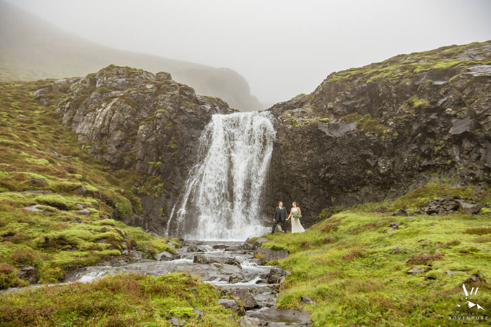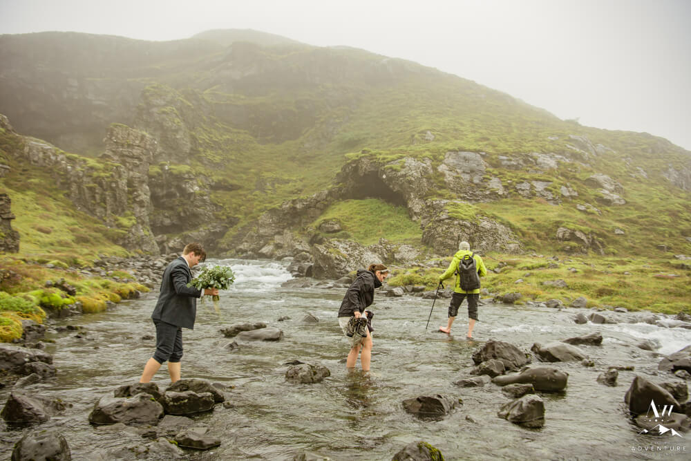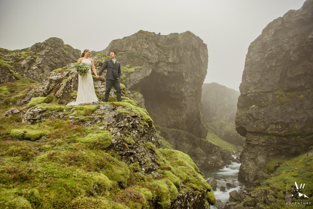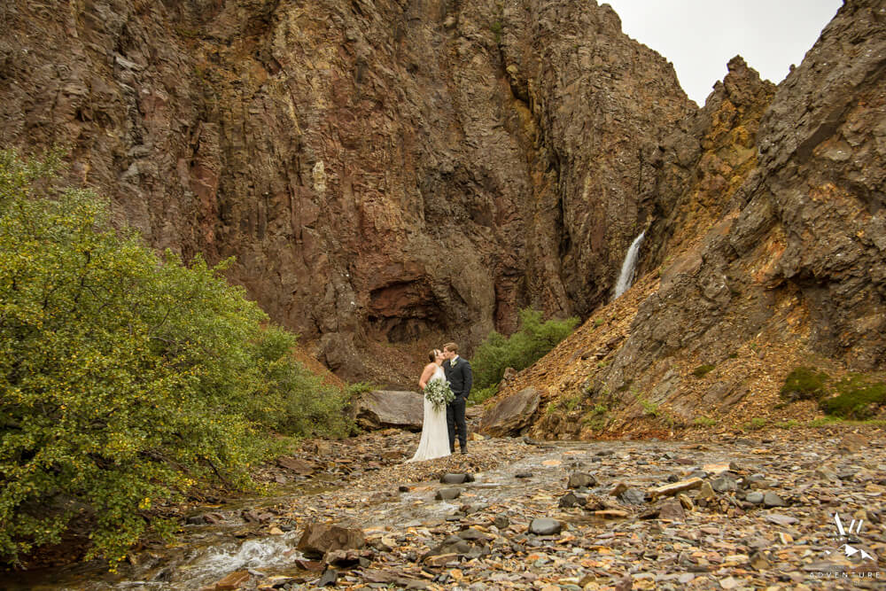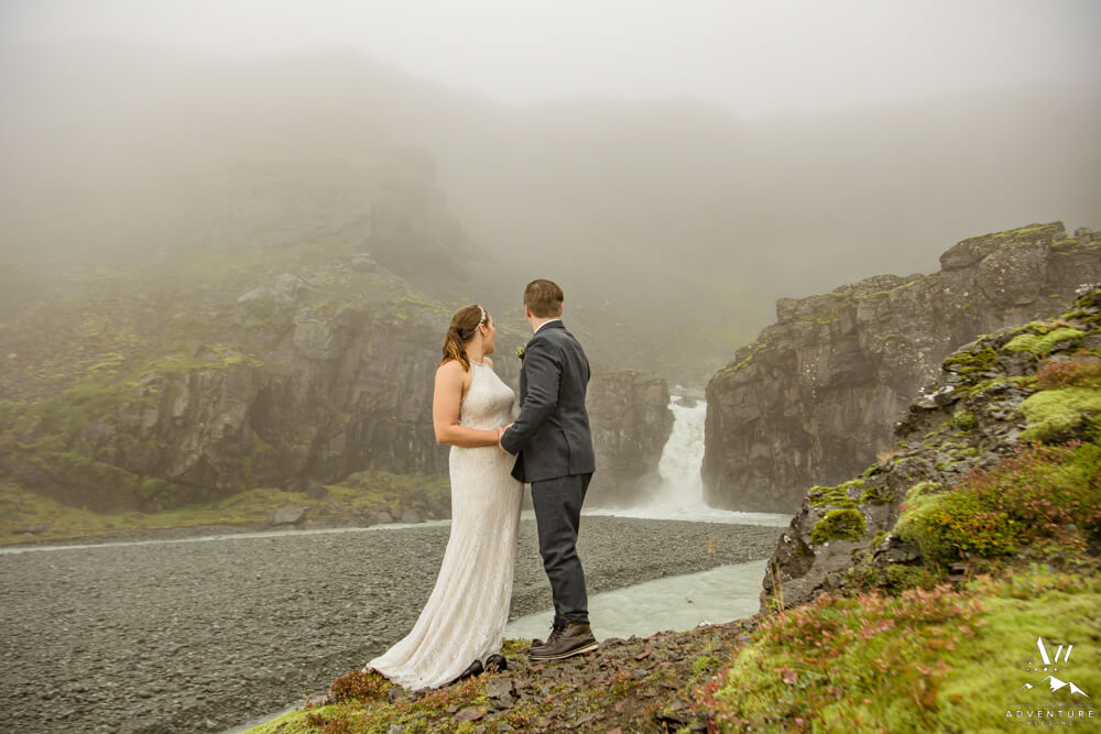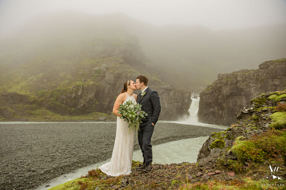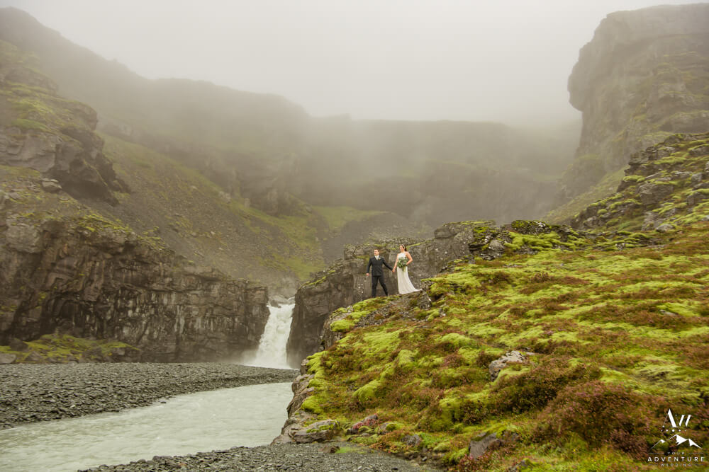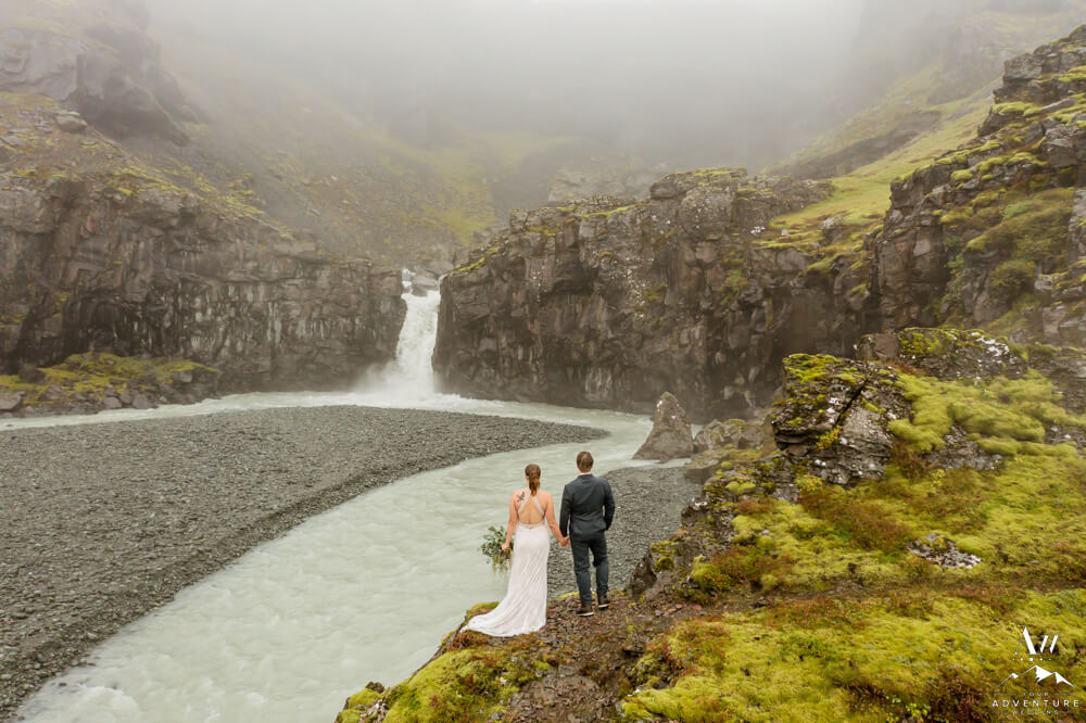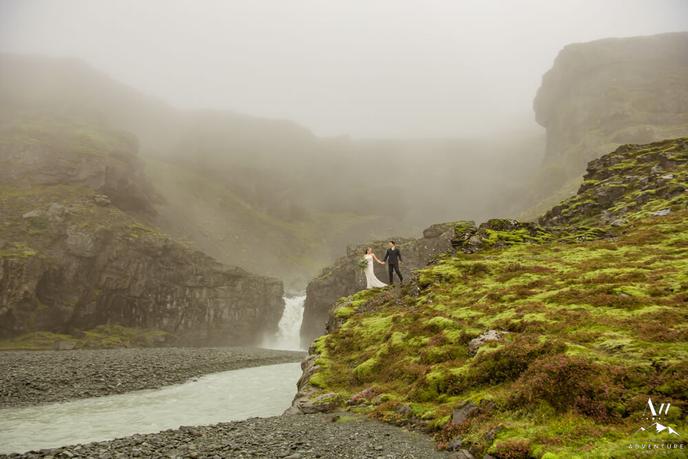 After a longer hike than the first, it was time to adventure to a foggy canyon area which was perfectly captured via drone by our Iceland elopement photographer. For example, the mist, fog and raging river crossings really added to the dramatic elopement photos!