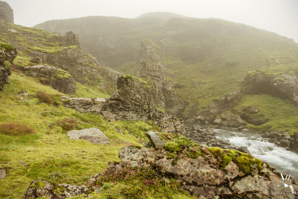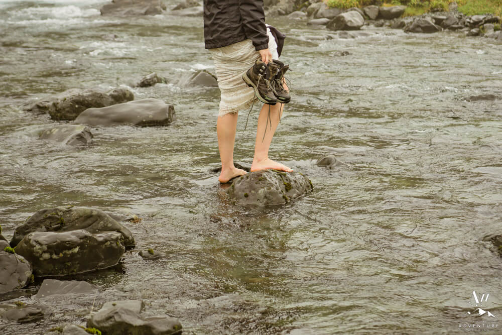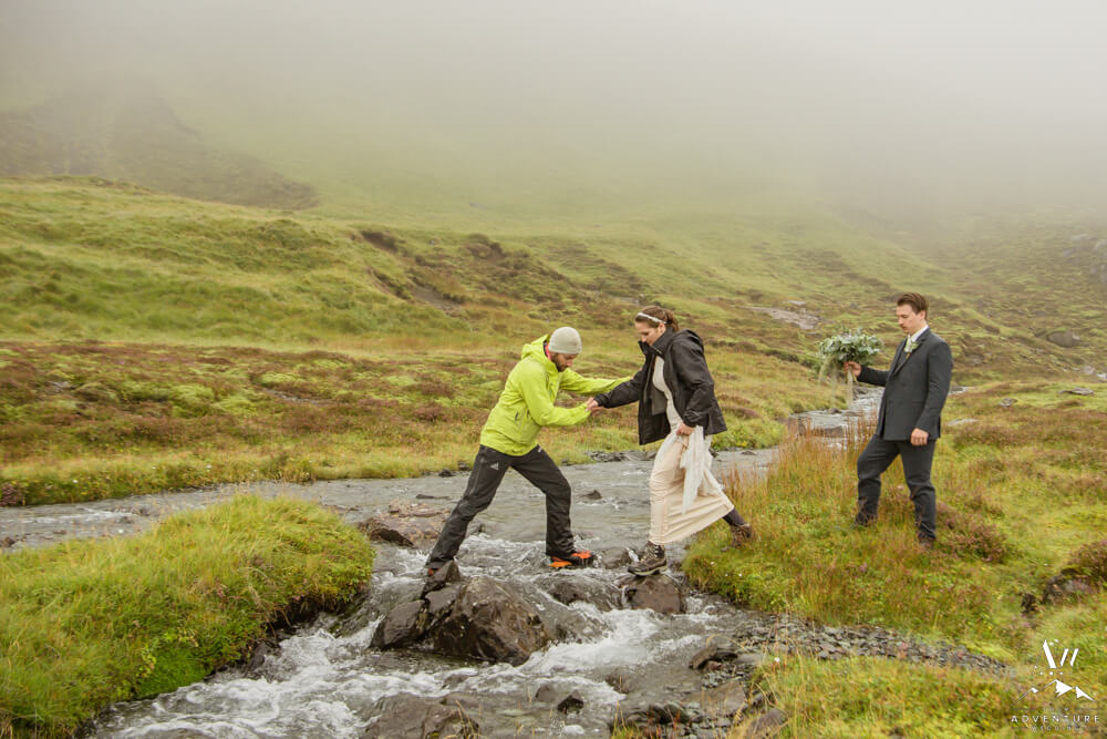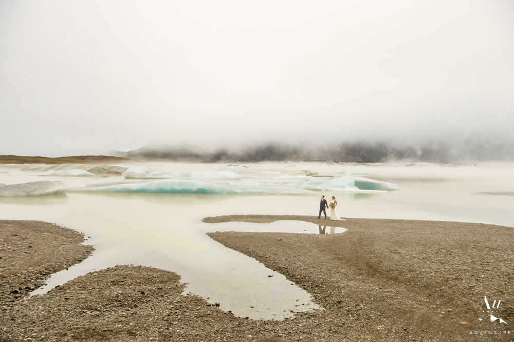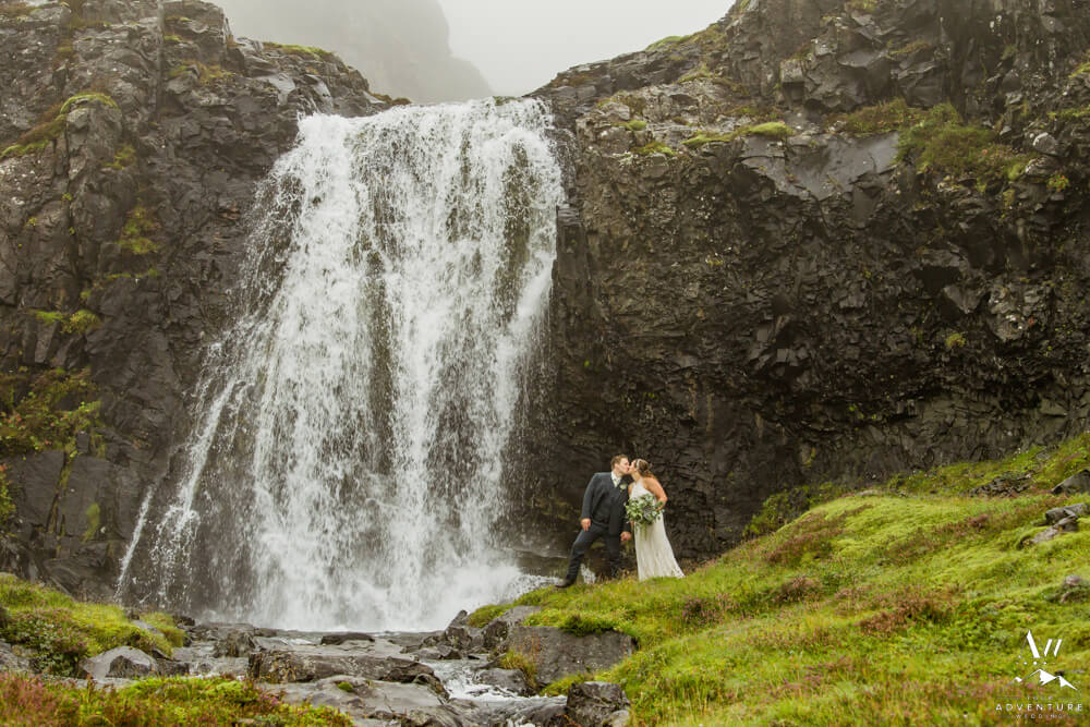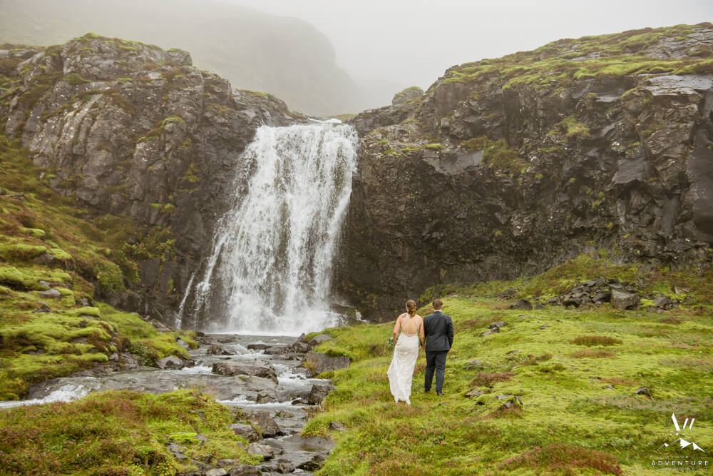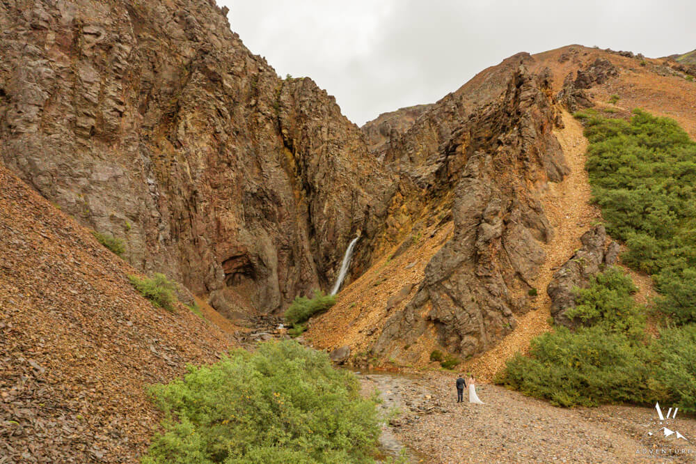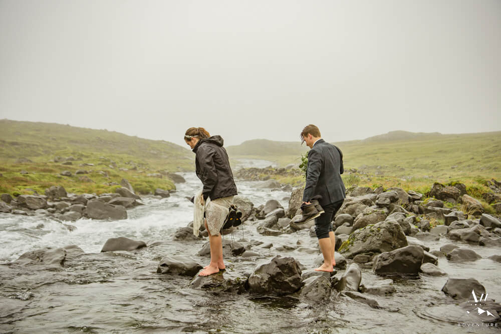 After a longer hike than the first, it was time to adventure to a foggy canyon area which was perfectly captured via drone by our Iceland elopement photographer. For example, the mist, fog and raging river crossings really added to the dramatic elopement photos!