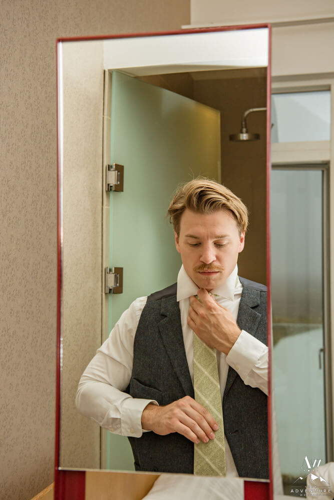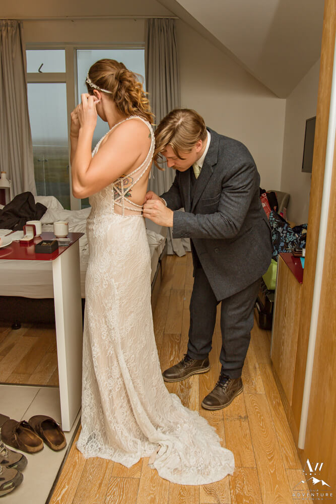 The dramatic elopement began very early on August 31st 2022. In fact, the weather in Iceland delivered her best overcast windy skies to set the snuggly mood. Kate and Austin had a quiet morning getting ready together in their lovely room inside Fosshotel Vatnajökull. Meanwhile as 8am drew near, it was time to grab go bags and load into the super jeep for the day!