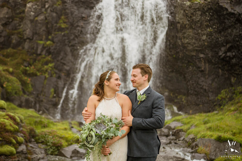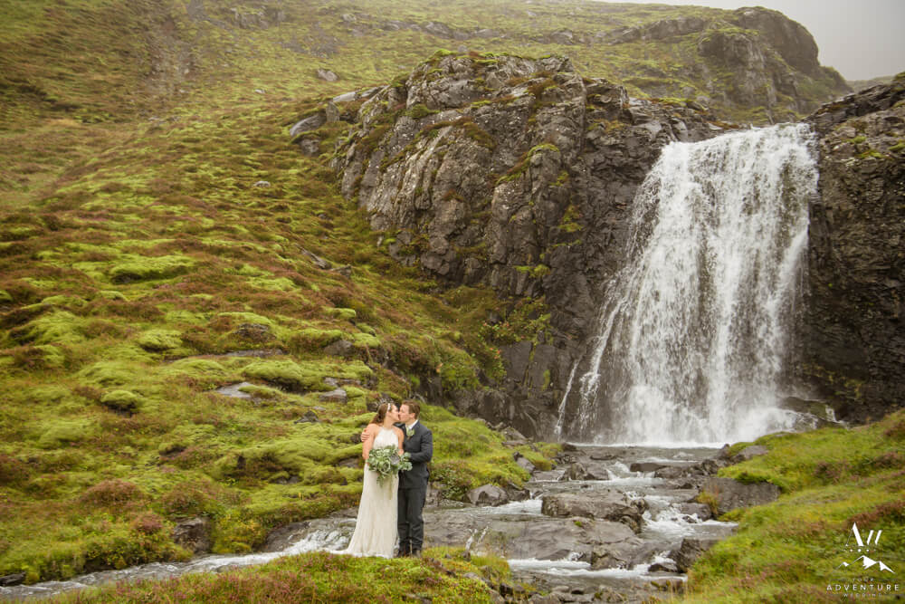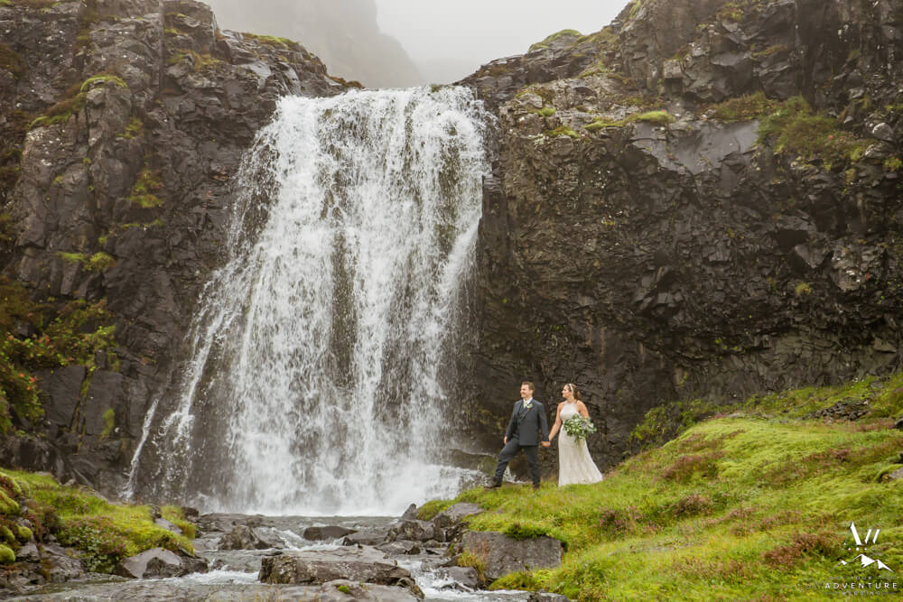 One of the countless reasons why the Kate and Austin came to our Iceland Wedding Planner team was to ensure… They would spend the day making new memories together rather than just playing dress up. No matter the weather, the two wanted time to be in the moment and explore and landscapes hand in hand. Therefore, following their dramatic elopement, they hiked around in front of the waterfall and then to the top!