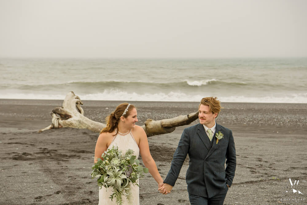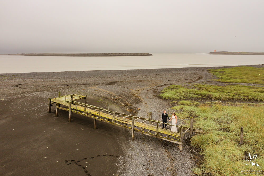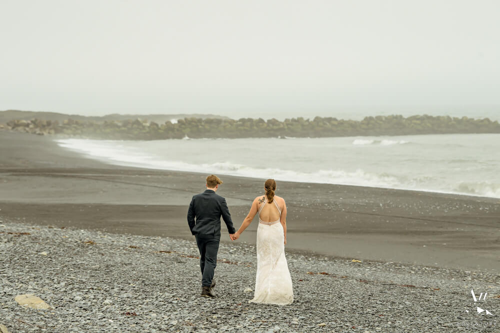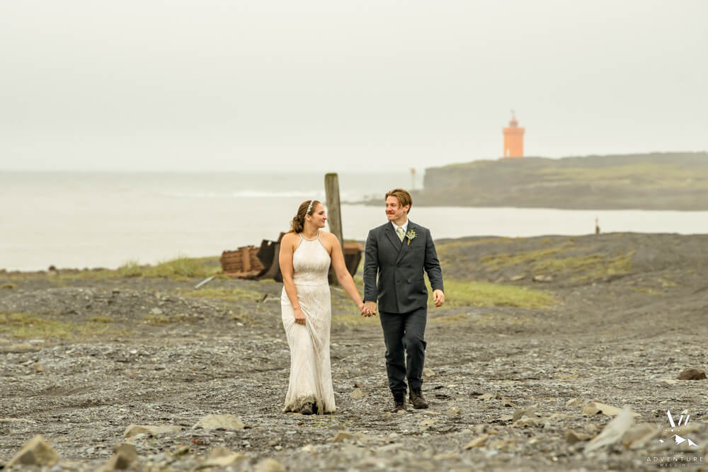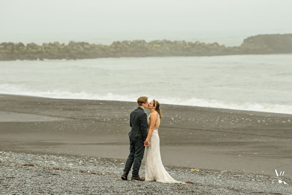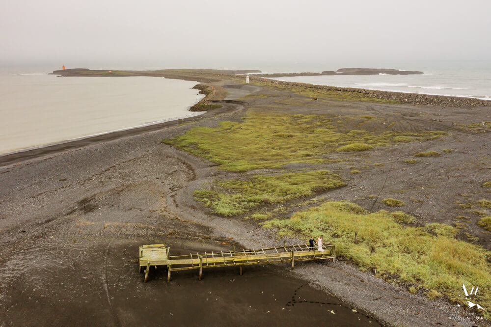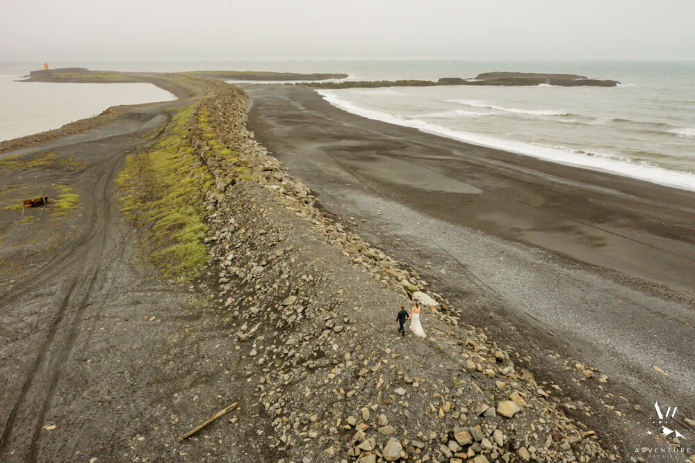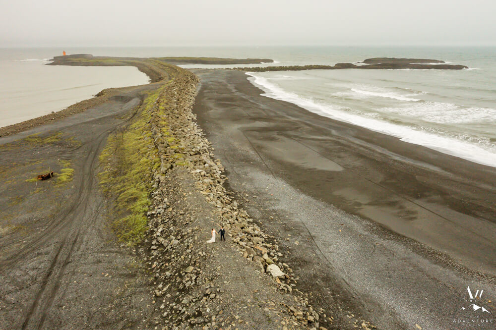 Volcanic beaches is a must see feature when traveling to Iceland. So if you do not encounter one on your Iceland dramatic elopement then you must do so on your self-drive honeymoon. However, if you’ve hired our Iceland Wedding Planner team, it’s likely you’ll have an incredible selection to consider! To illustrate, Kate and Austin spent time running around a driftwood black sand beach. Firstly, the ride in the super jeep to get there is nuts! Second, they ventured to a old oceanside dock, a lighthouse peninsula, and saw the magnitude of driftwood that washes up from other countries!