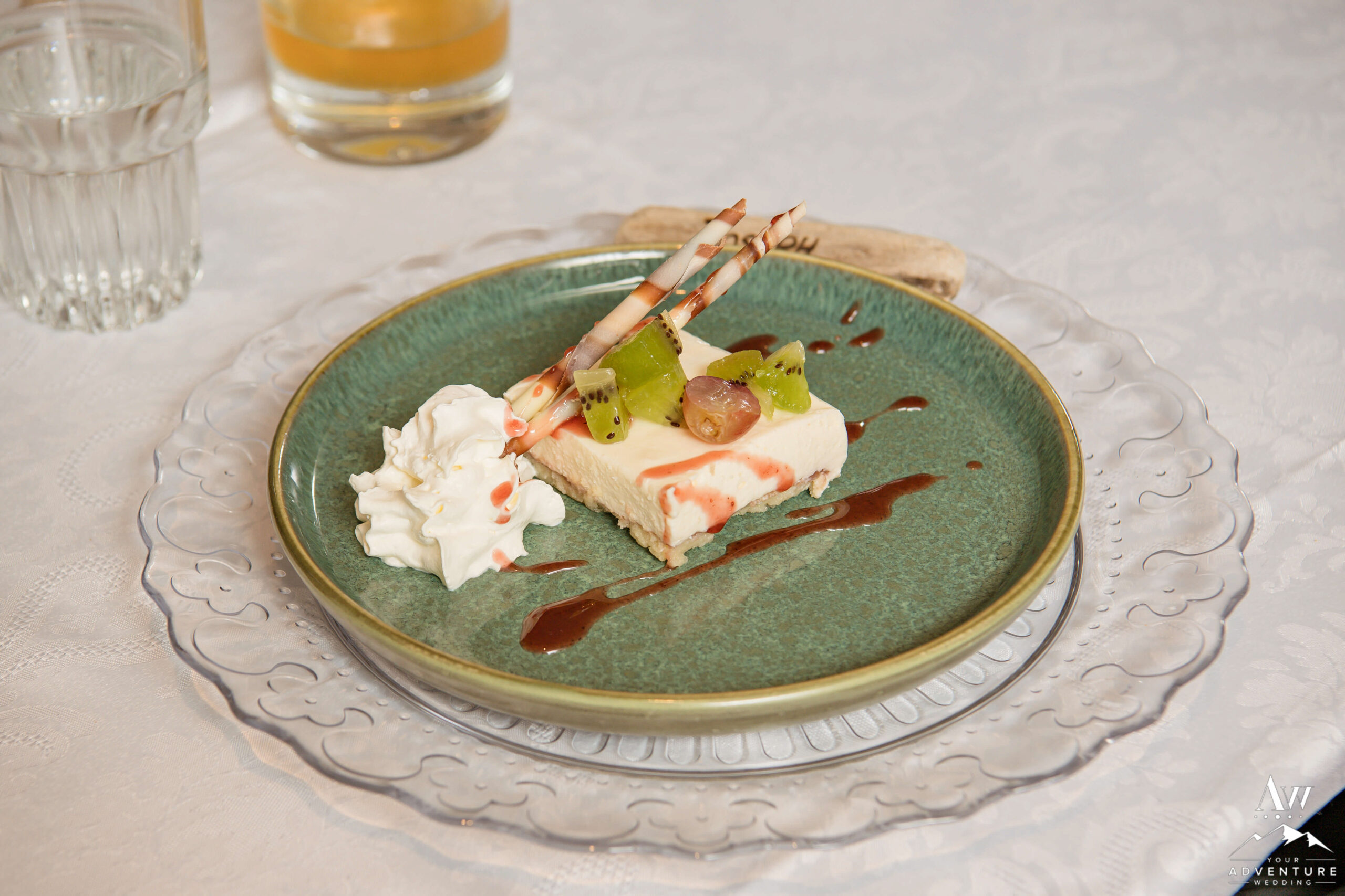 After the adventure portion of the experience driven wedding was finished the group had a chance to refresh before dinner. Next, they gathered upstairs in a private reception room at Hotel Stracta. For example, the space was transformed into an elegant dinner for 15 people. Complete with a separate cake table too! Hello lovely little kransakaka!