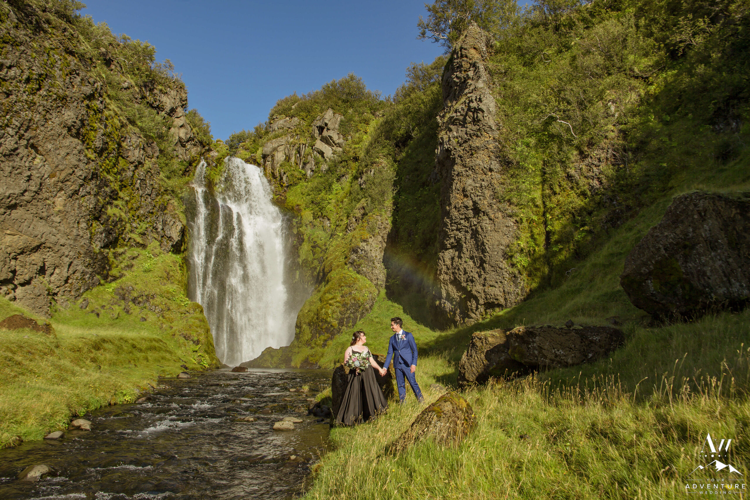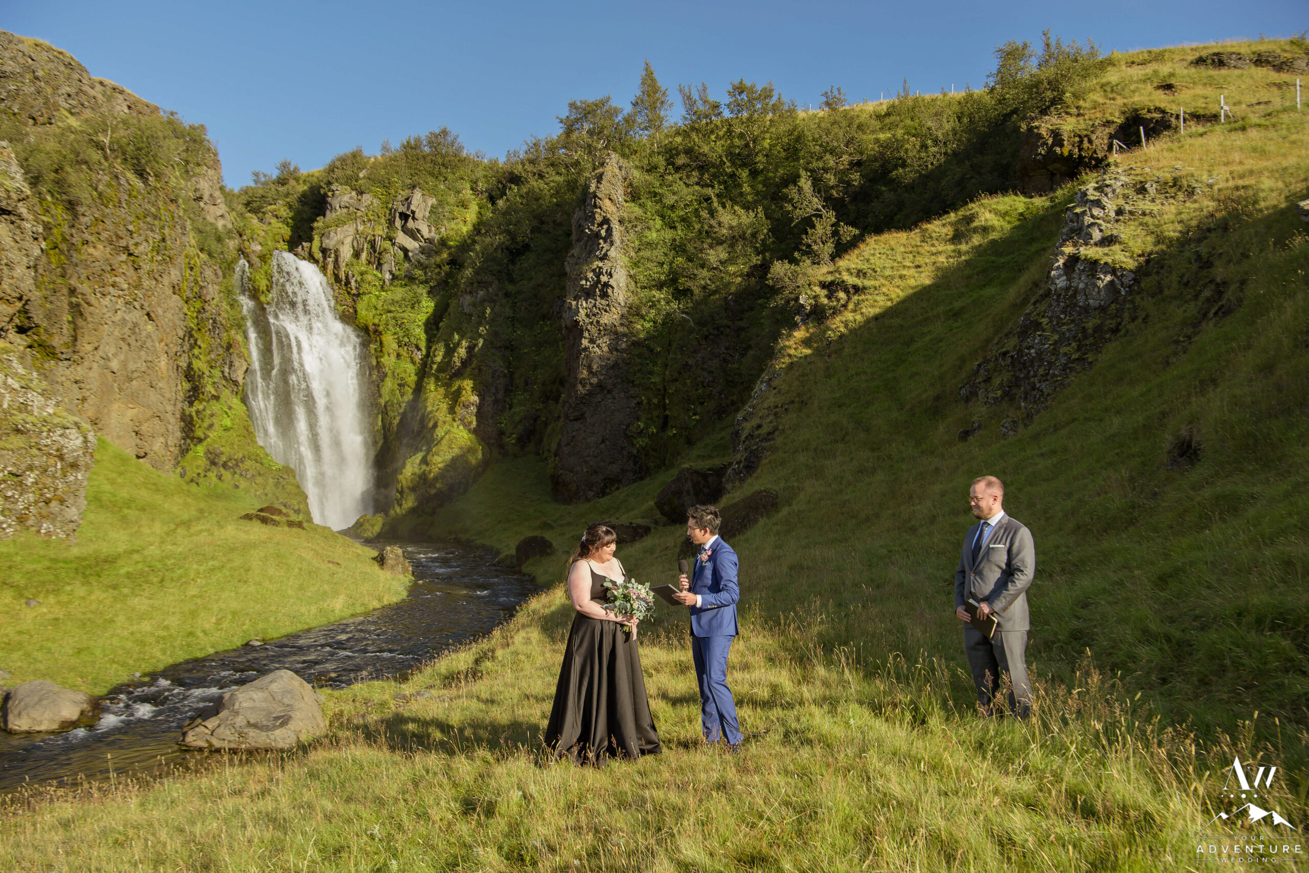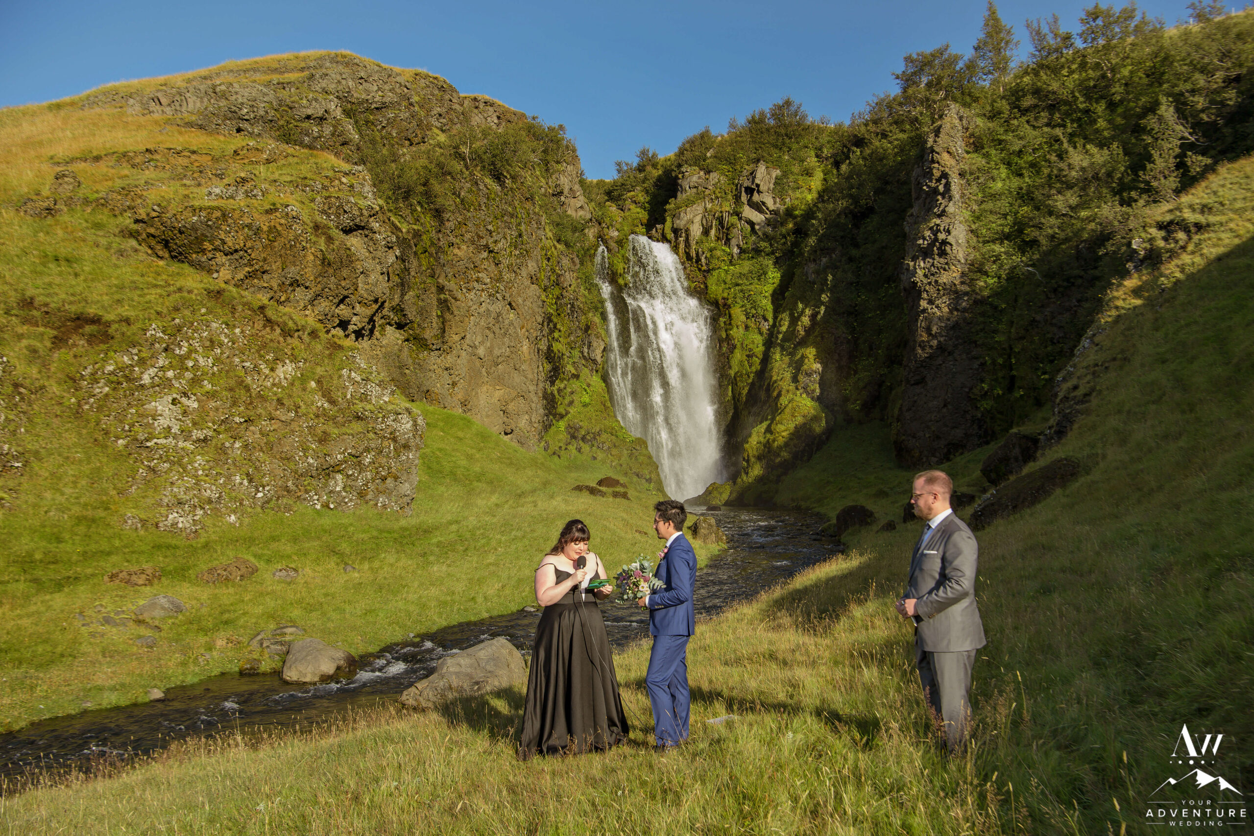 Next, Jacob walked his mum down the aisle and Janessa’s father walked her down the aisle. Further, since they had been legally married prior to coming to Iceland their good friend performed the ceremony. Following the vivid wedding ceremony, the group posed for a group photo and then the couple took time to explore around the private property waterfall with their local Iceland wedding photographer.
