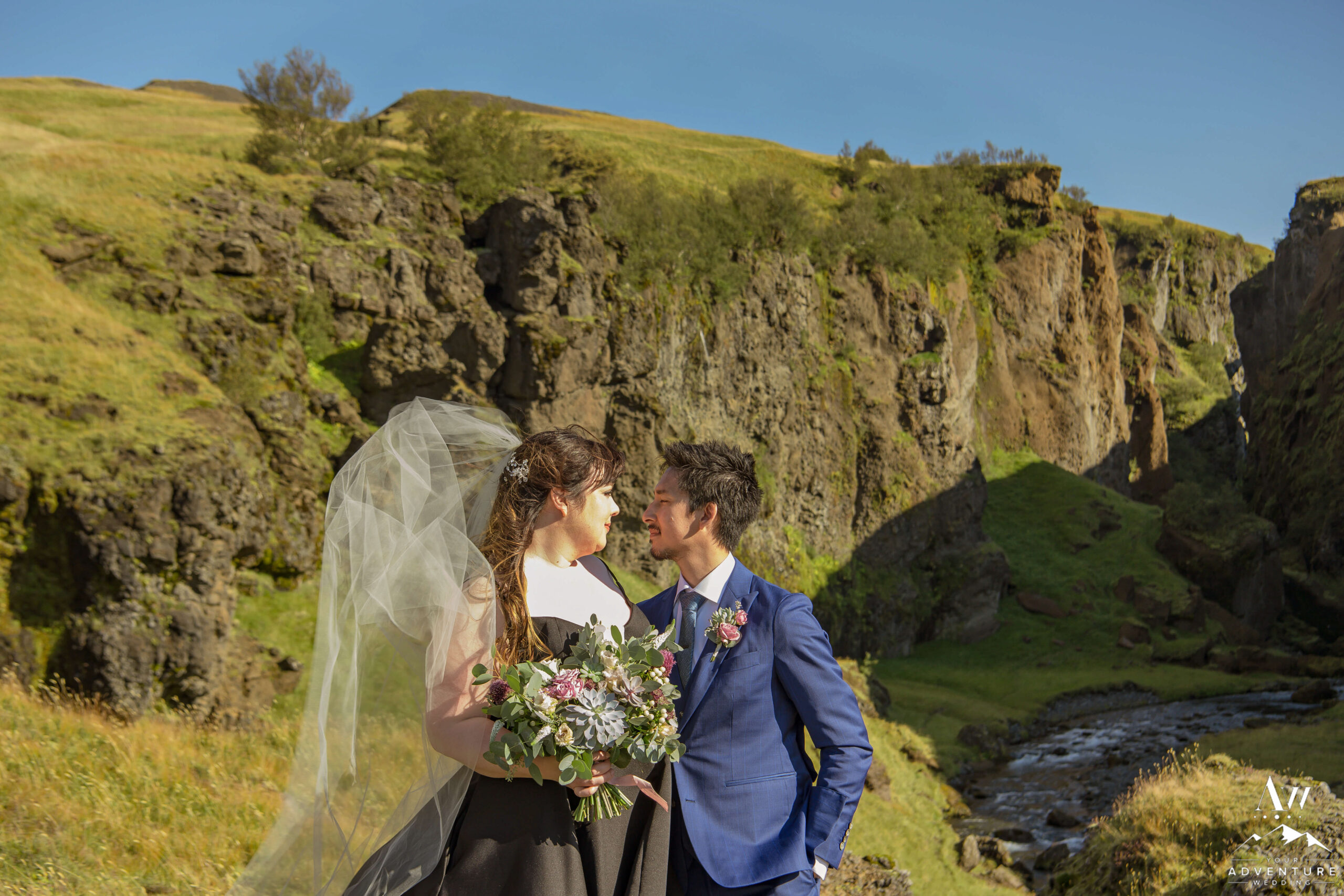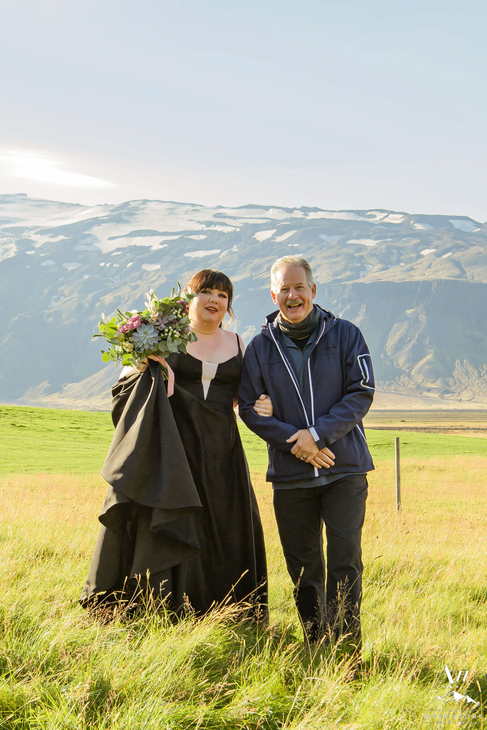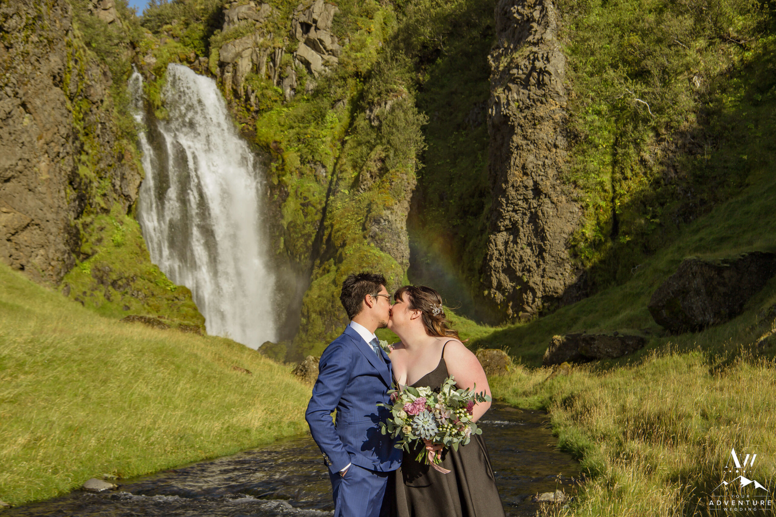 Next, Jacob walked his mum down the aisle and Janessa’s father walked her down the aisle. Further, since they had been legally married prior to coming to Iceland their good friend performed the ceremony. Following the vivid wedding ceremony, the group posed for a group photo and then the couple took time to explore around the private property waterfall with their local Iceland wedding photographer.