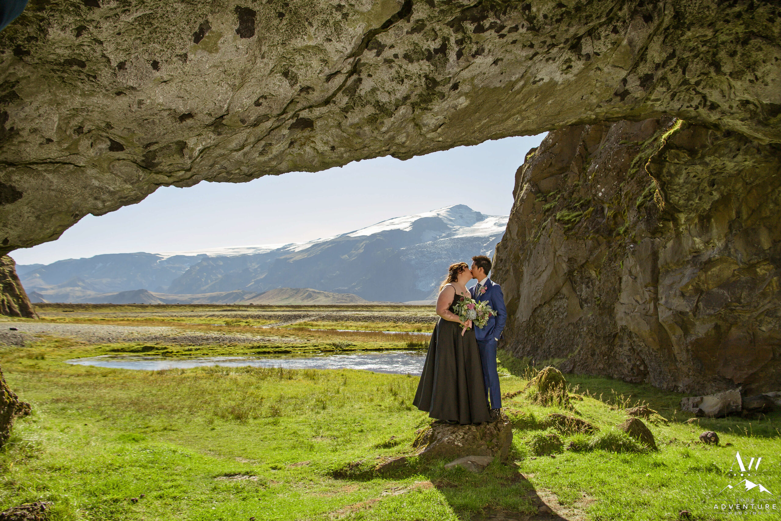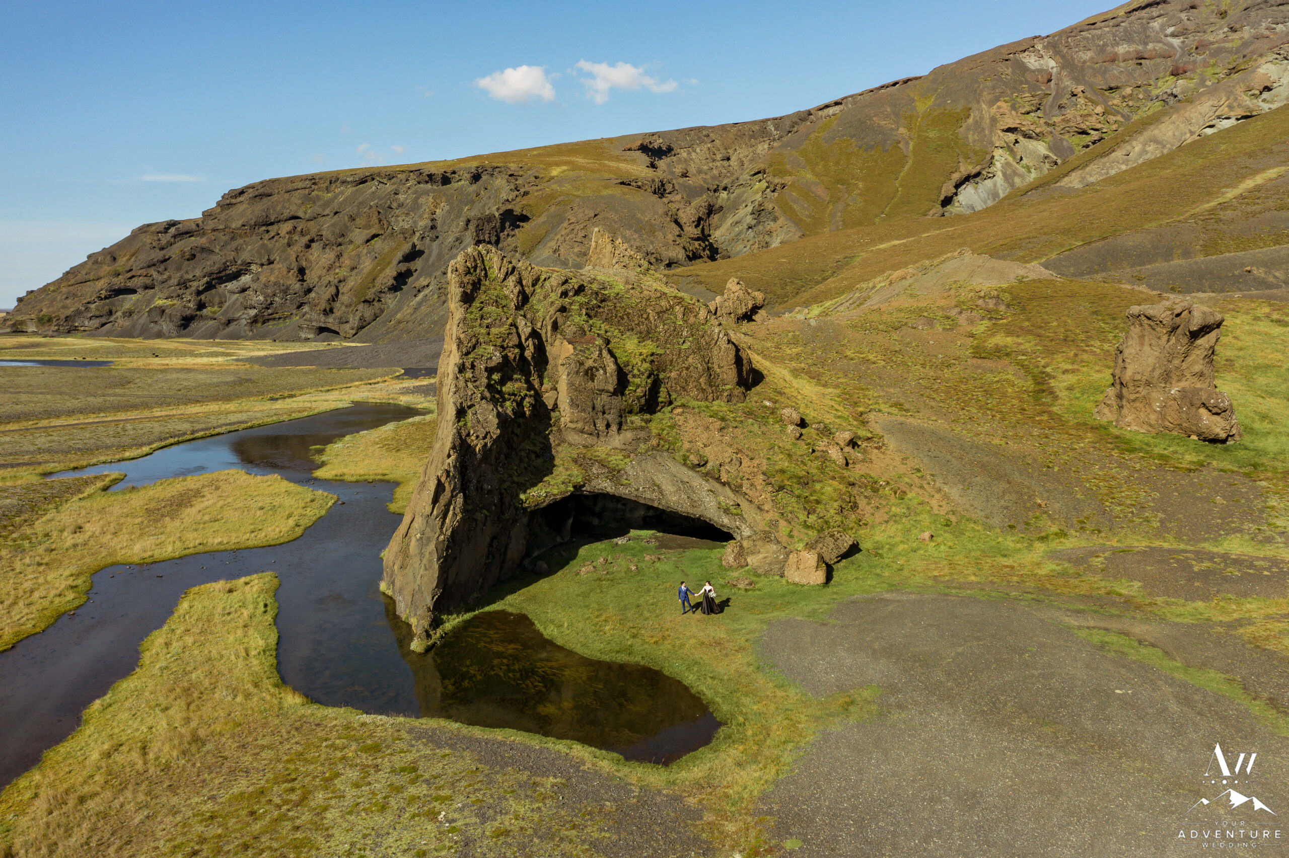 But no stress! Our jeep team gets it done right and in a super fun way so bring on the next vivid wedding location… And that awe-inspiring spot is a natural cave, with glacier view and rock formations. Not sure which we enjoy more, the ground shot images or the drone ones!?!
