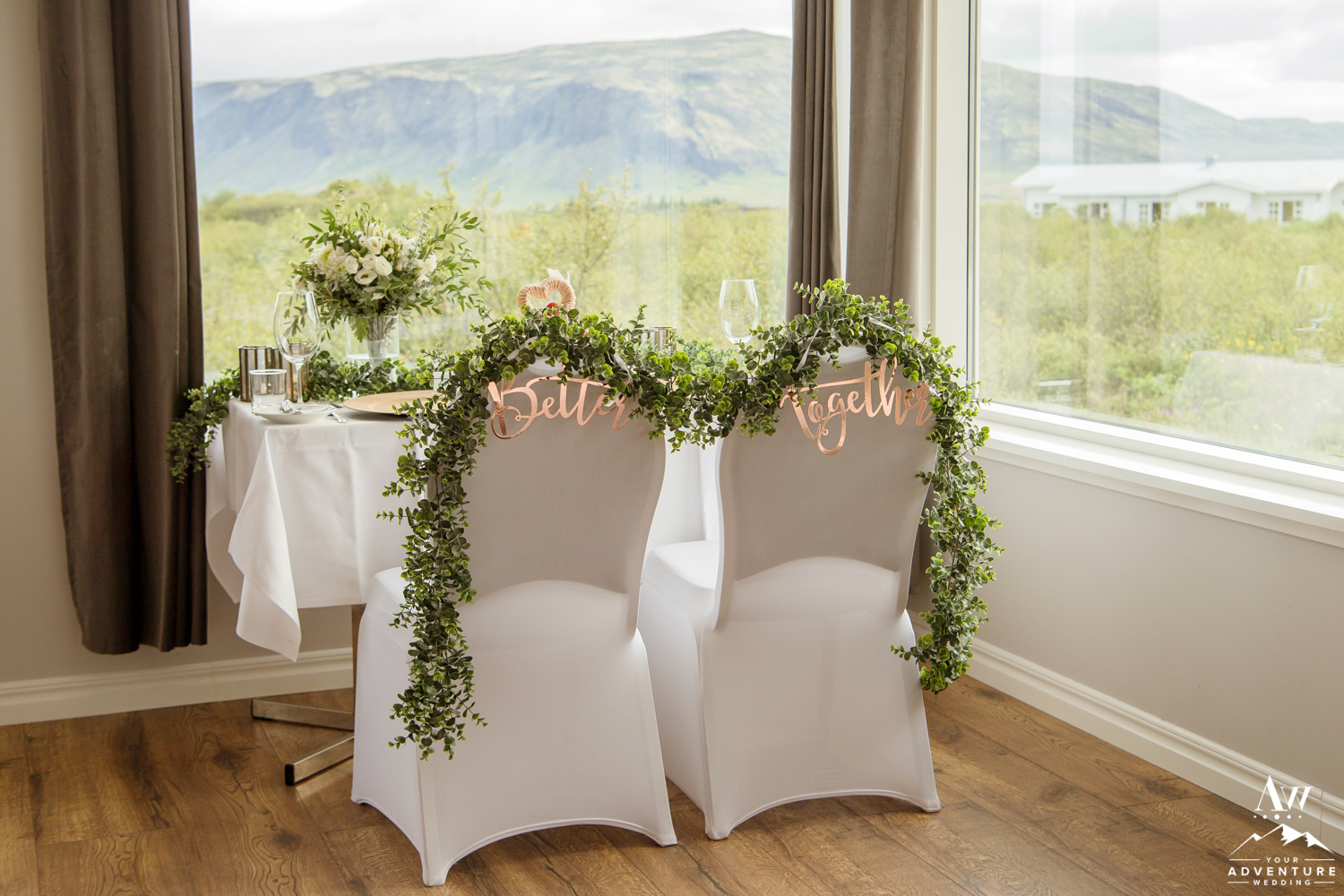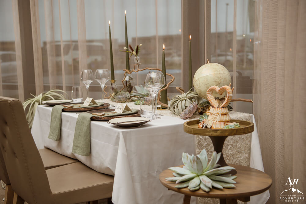 Likely, you have come to Iceland because you seek adventure. Therefore, why not have a table which celebrates that fact? An adventure theme elopement reception table could mean there are elements of travel included into the tablescape. To illustrate, things like a globe, mountains, adventurous signs, compass, maps, highlighting an activity, nature undertones, etc.