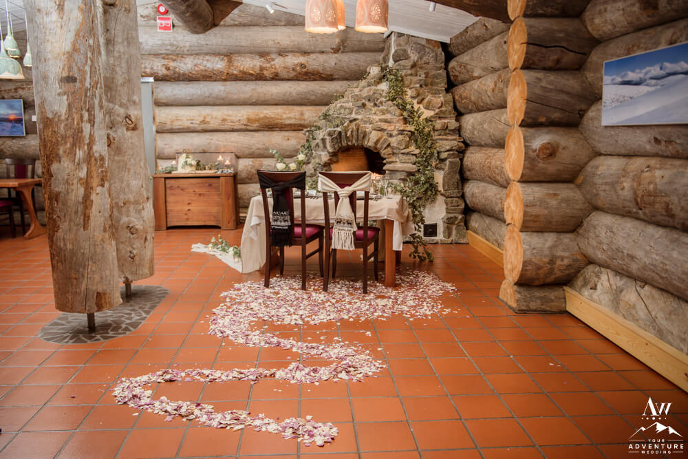 If you love to be surrounded by dreamy or cozy things then a romantic elopement reception table would suit you best. For example, being set in front of a fireplace, having rose petals, reds, pinks, and candles can really set the mood. Furthermore, maybe even some pearls, furs, or inspirational signs could help transition the ambiance.