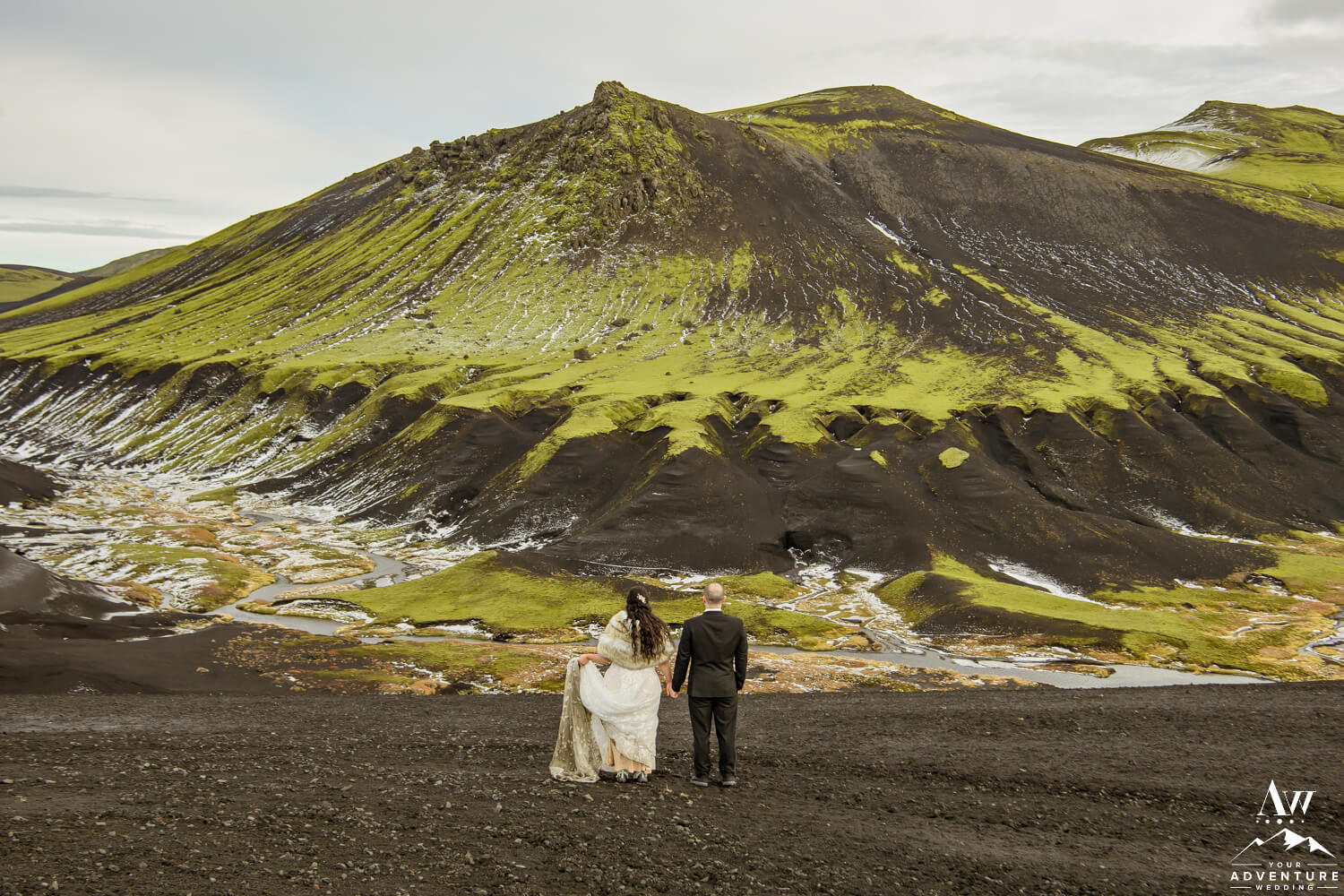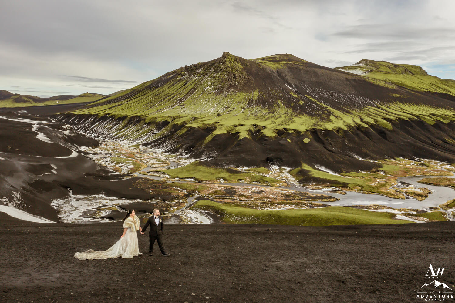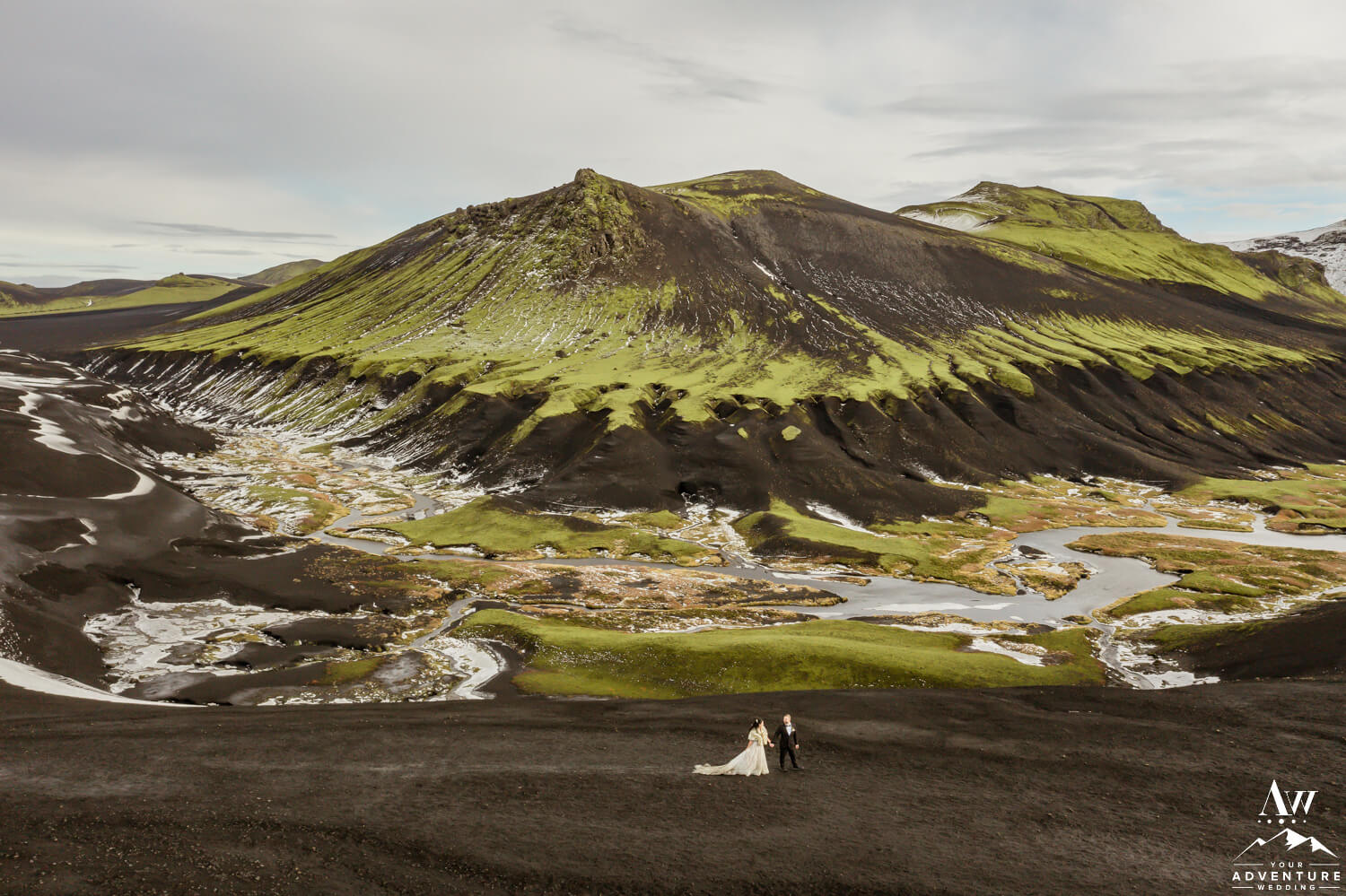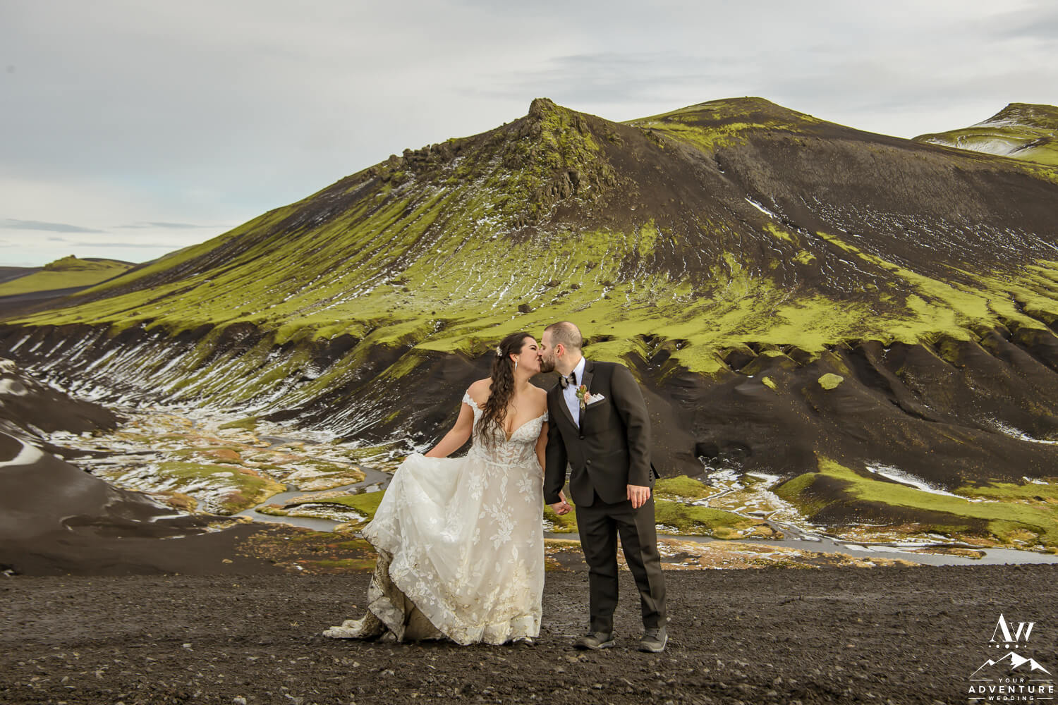 One landscape feature that often ties the highlands together is volcanic sand. First, it’s likely it has been brought to the location by a previous eruption. Second, it is found throughout the glacier areas, waterfalls, even adds to the vividness of canyons and rivers too! Meanwhile, the next Iceland wedding location Sophy and Vinnie experienced, is a canyon area which was mixed with black sand, moss, and ground coverings which featured fall colors. Needless to say, VIVID for a October highland elopement!