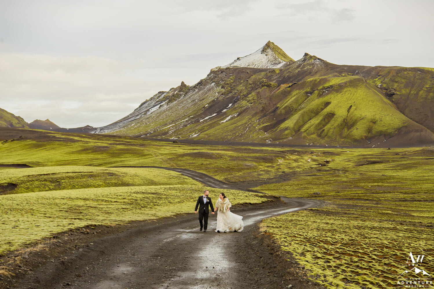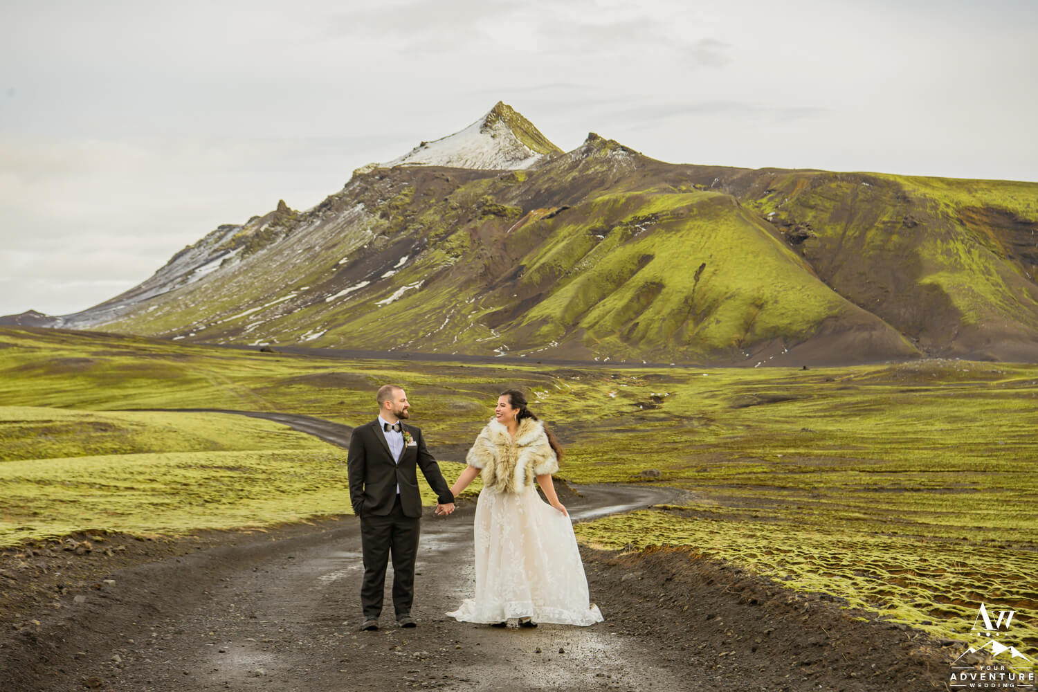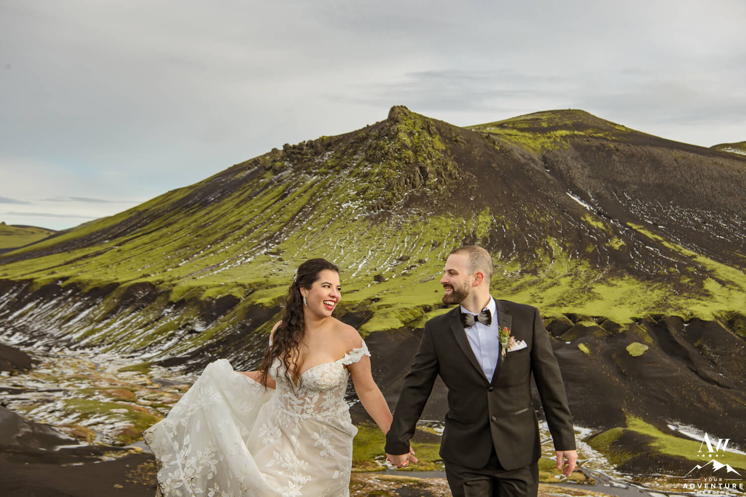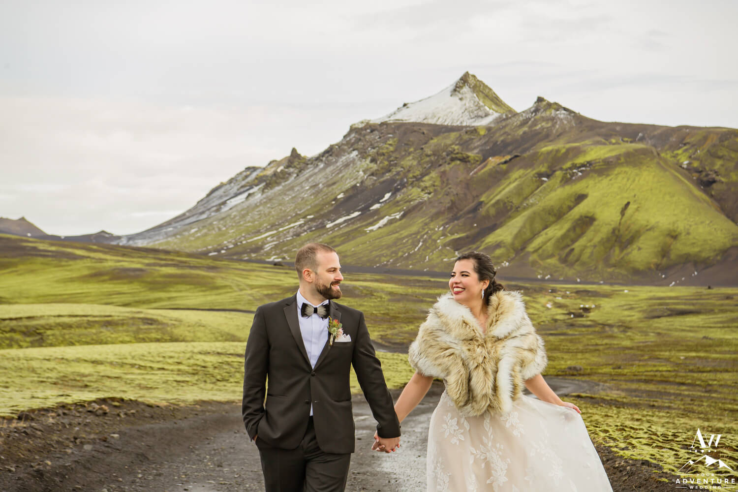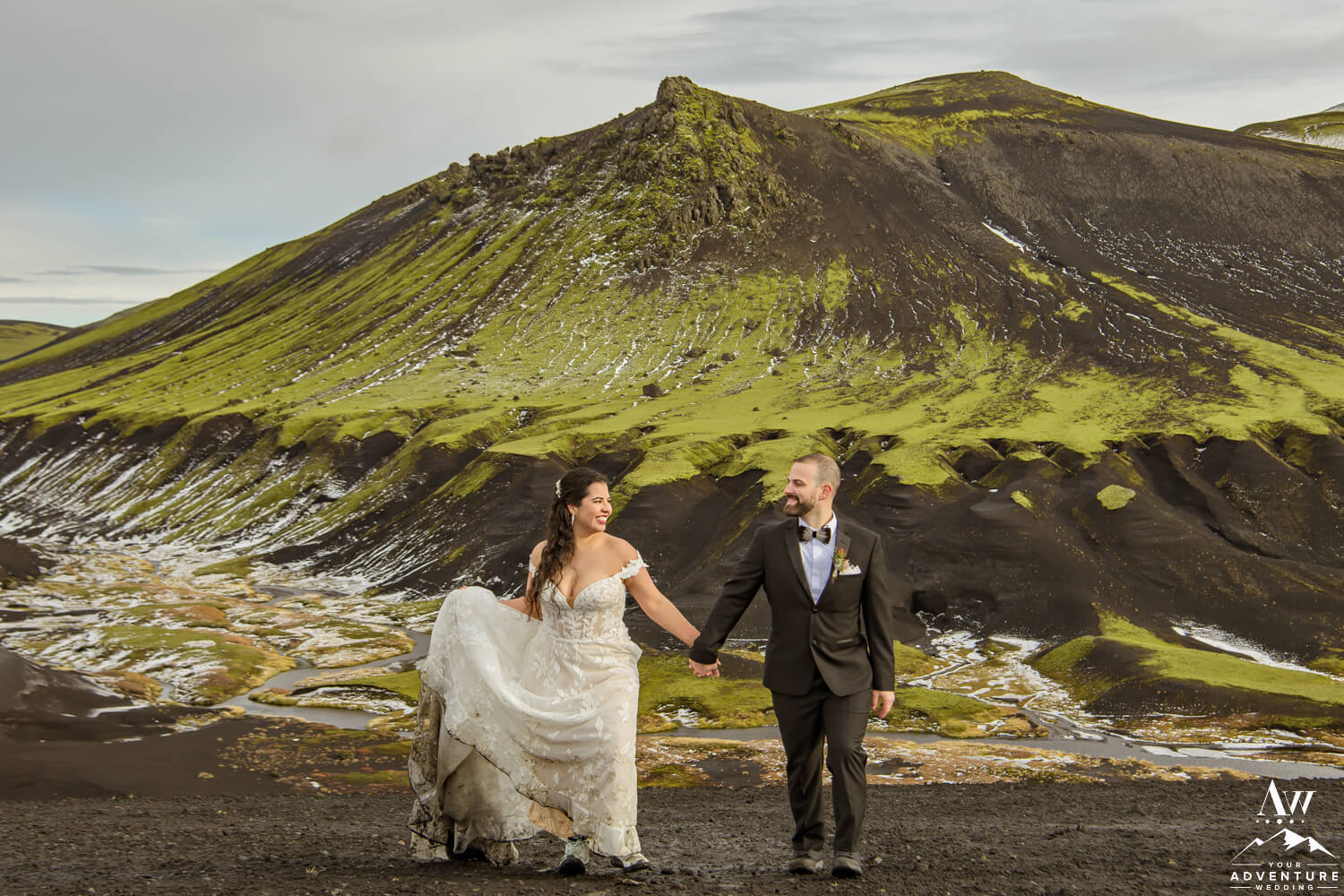 One landscape feature that often ties the highlands together is volcanic sand. First, it’s likely it has been brought to the location by a previous eruption. Second, it is found throughout the glacier areas, waterfalls, even adds to the vividness of canyons and rivers too! Meanwhile, the next Iceland wedding location Sophy and Vinnie experienced, is a canyon area which was mixed with black sand, moss, and ground coverings which featured fall colors. Needless to say, VIVID for a October highland elopement!