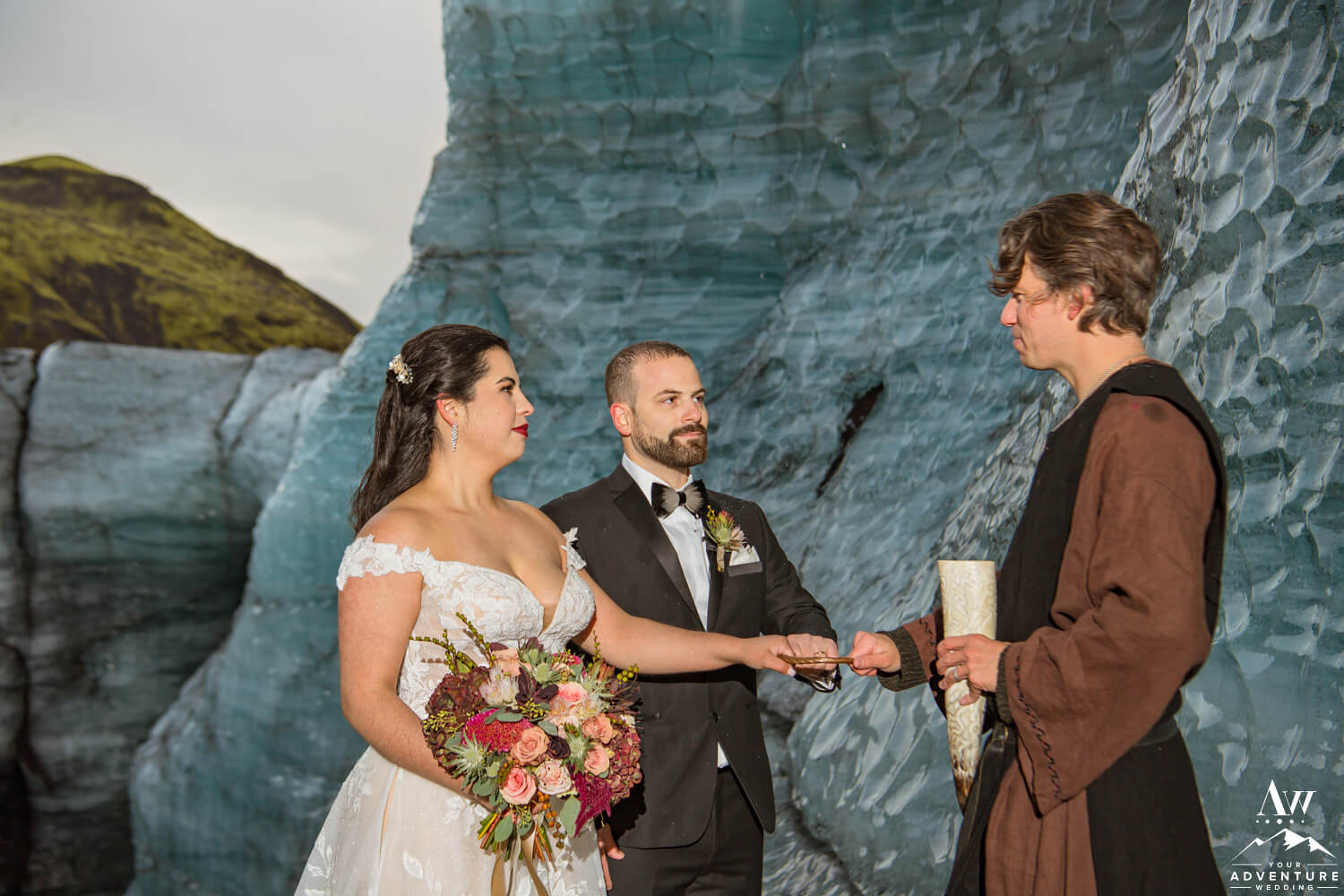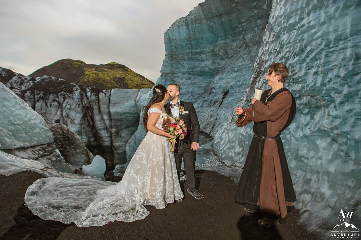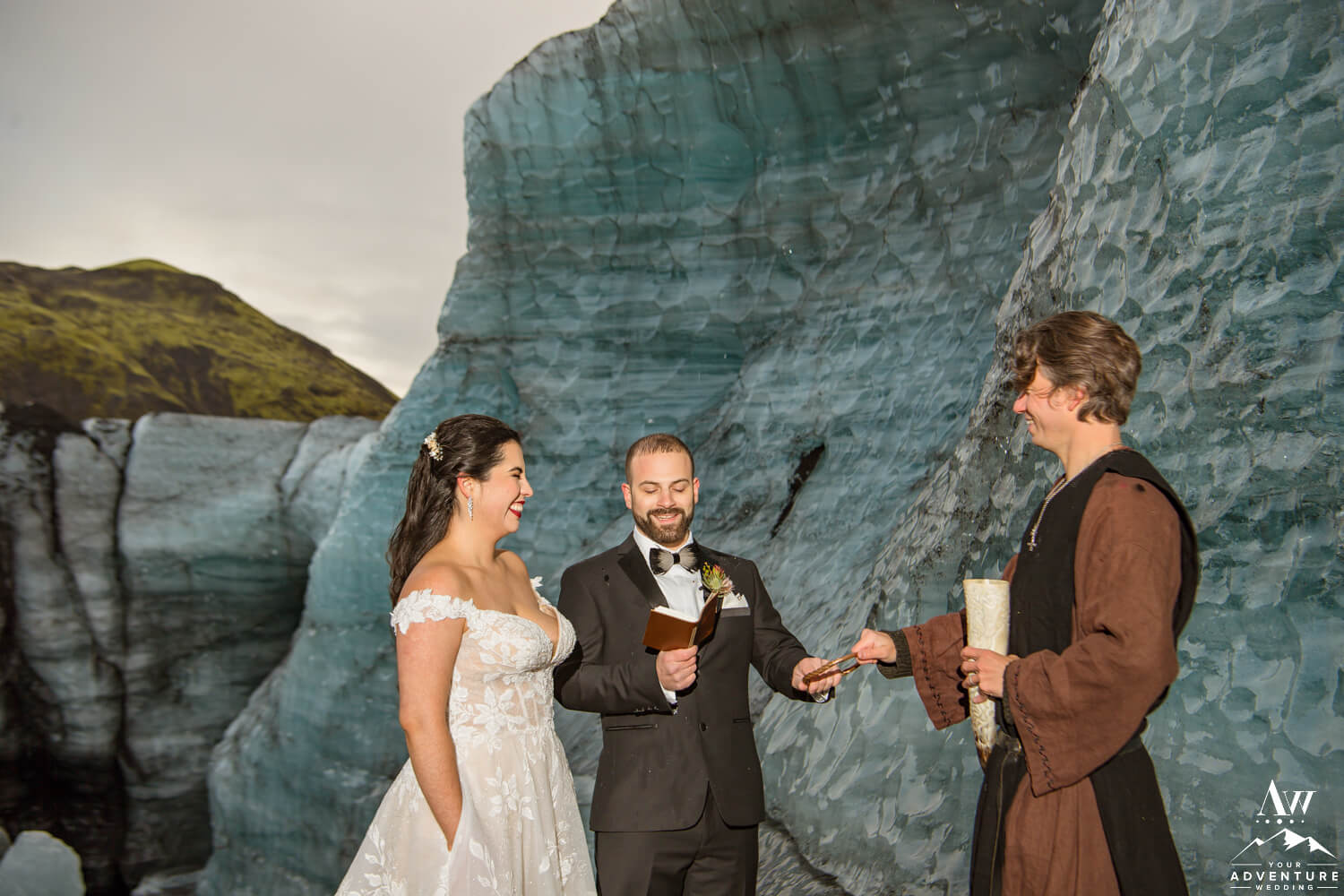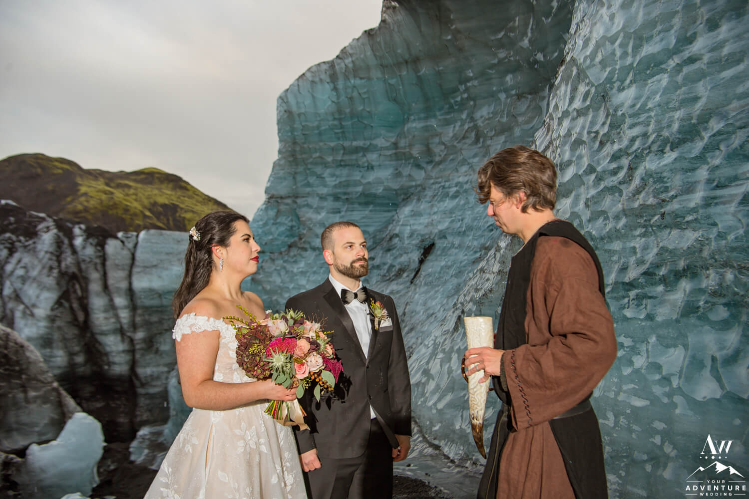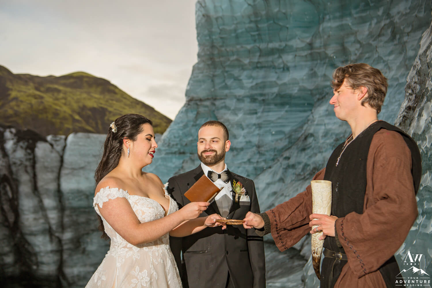 Heading into the wild of Iceland as sunrise approached is an eerie but exciting feeling! Perfect vibe for their October highland elopement, truly! Bundled up for the hike to the Katla Ice Cave area Sophy and Vinnie were ready for their first private experience. For example, they chose to hold an Ásatrú wedding ceremony with an Icelandic Goði. This is the type of ceremony where you are connected to Norse mythology, write oaths to each other, hold an oath ring, and drink from a Viking horn.