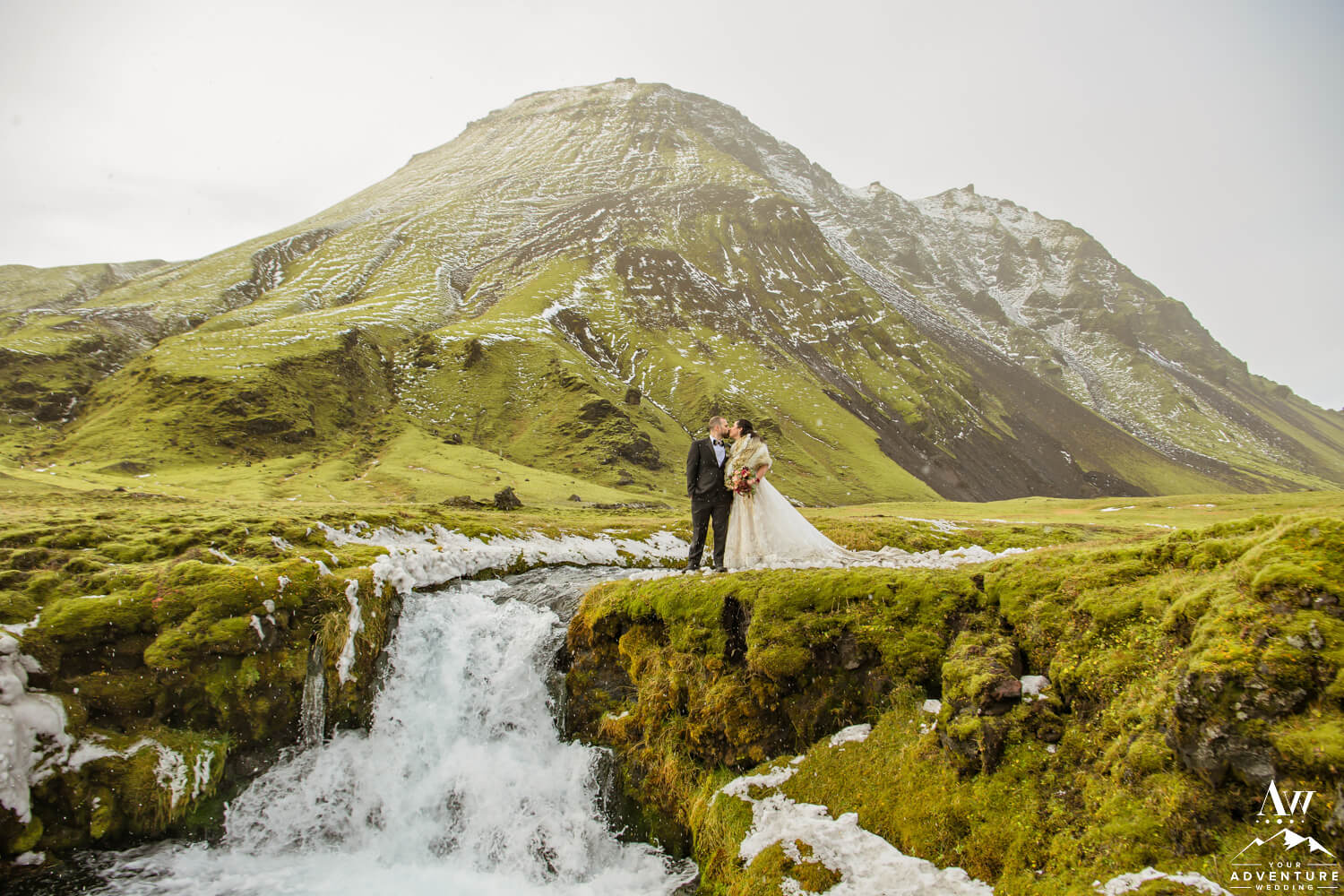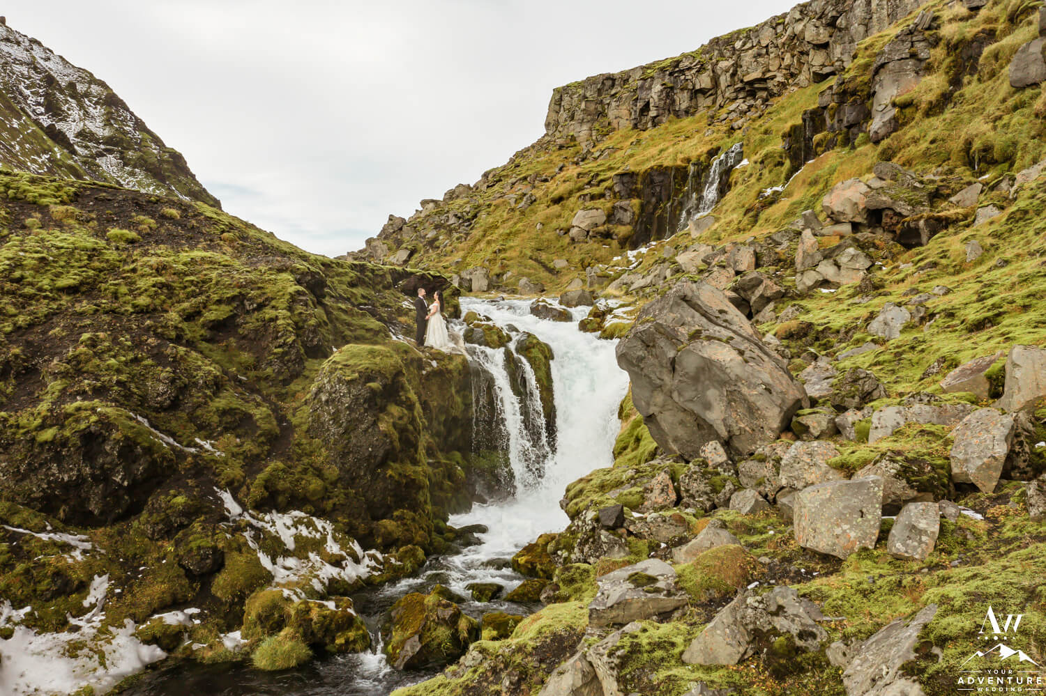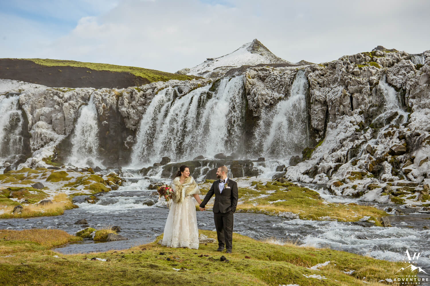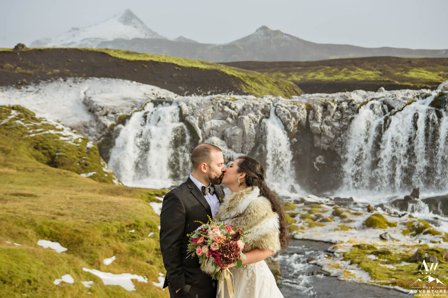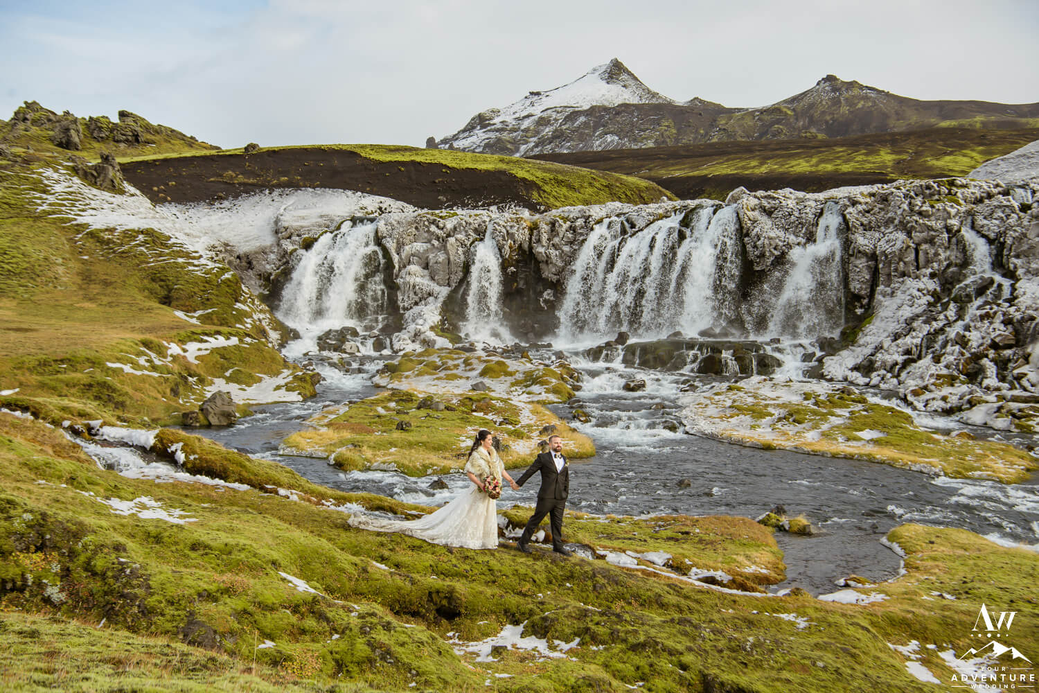 Discovery continues further and deeper into the highlands crossing rivers in the super jeep and by foot. Furthermore, the freshly snow perfectly outlined the next waterfall. But the sun shined to keep our newlyweds warm for their October highland elopement photos!