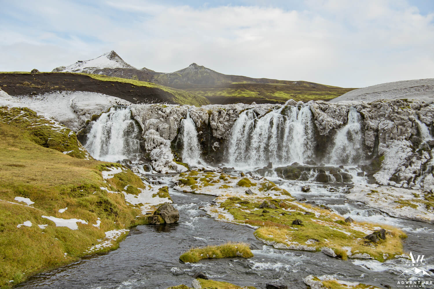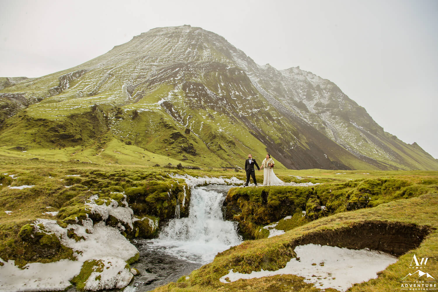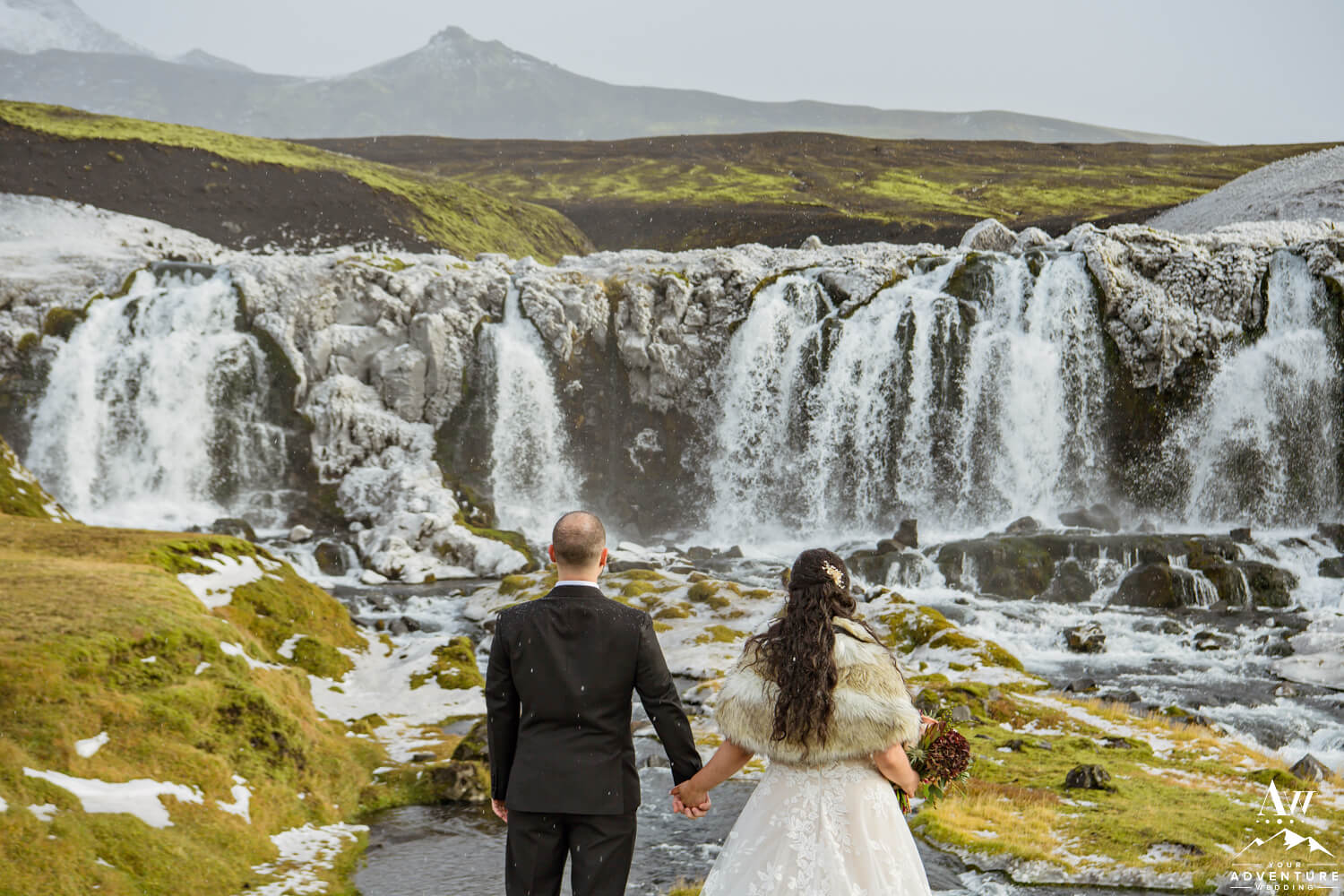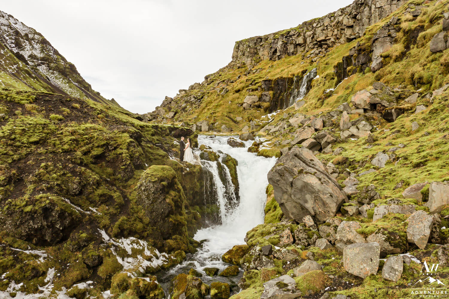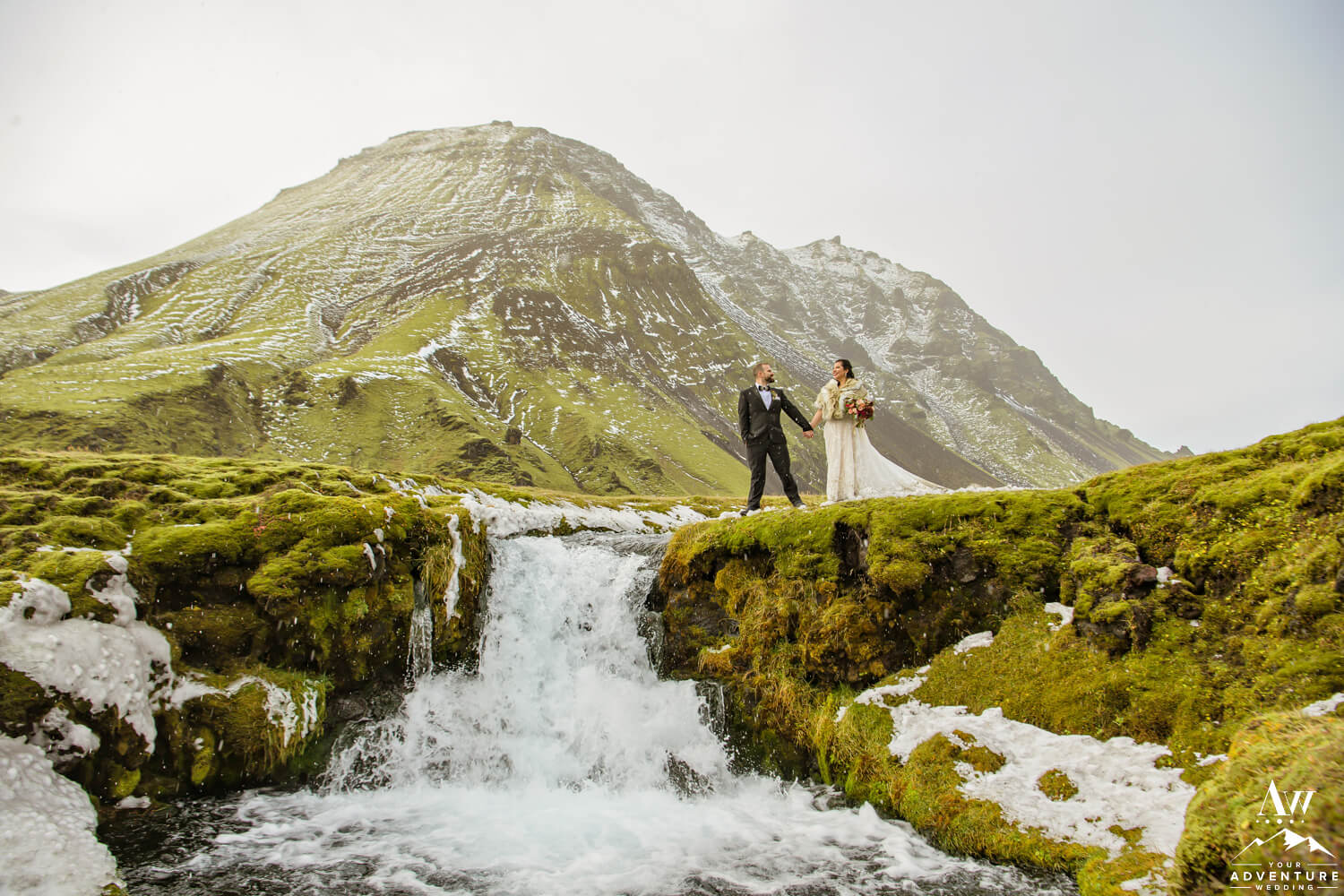 Discovery continues further and deeper into the highlands crossing rivers in the super jeep and by foot. Furthermore, the freshly snow perfectly outlined the next waterfall. But the sun shined to keep our newlyweds warm for their October highland elopement photos!