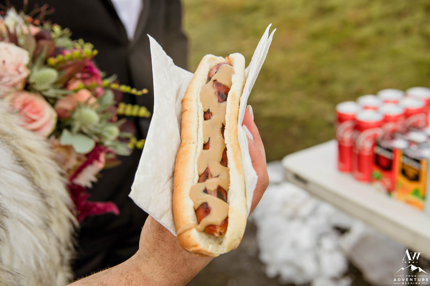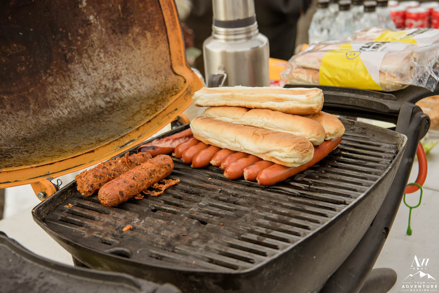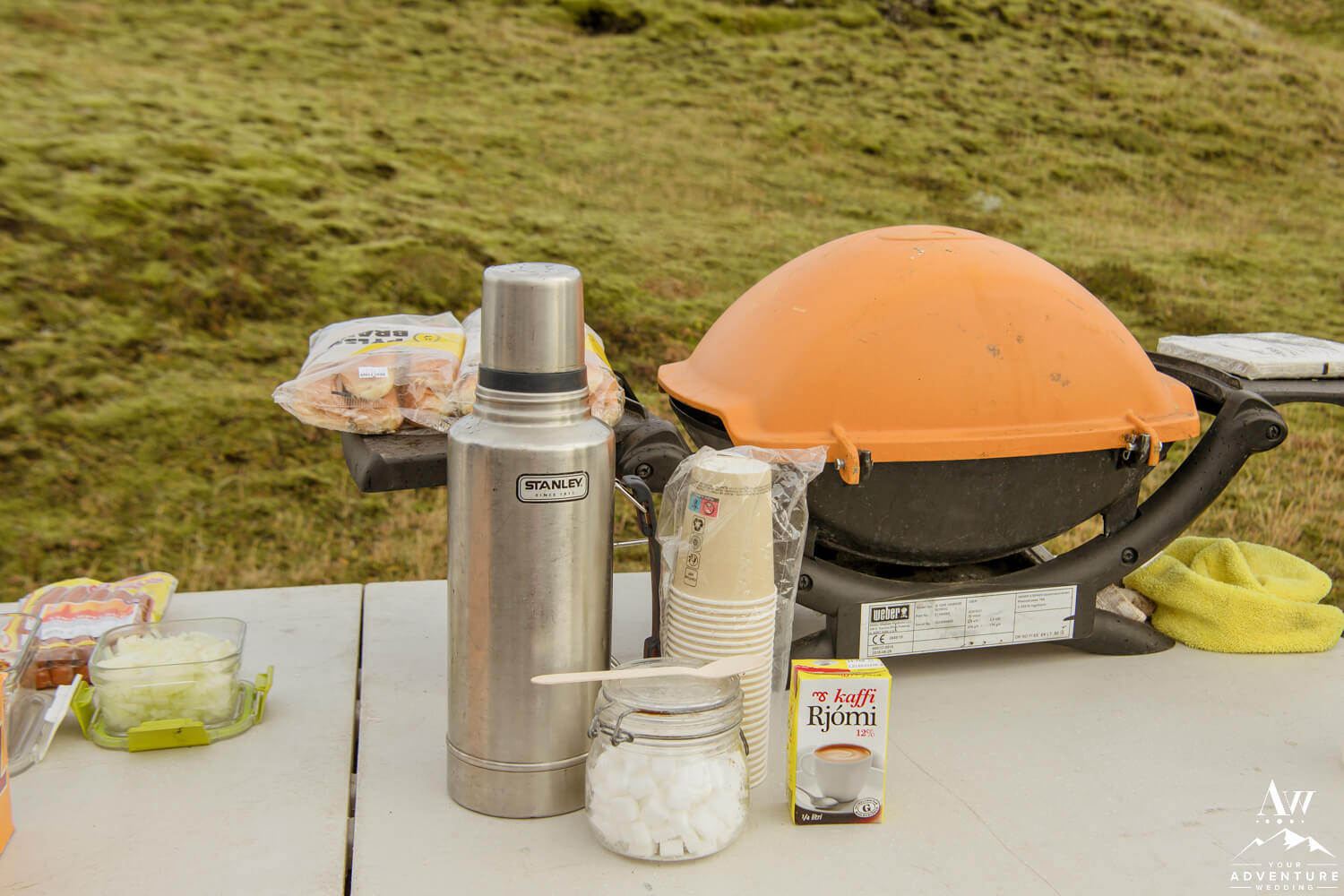 Next, the journey continues deeper into the Icelandic highlands… Sophy and Vinnie marveled over the scenes they witnessed from the super jeep. Additionally, it was super exciting to see the fall colors and snow capped mountains enter as a stunning backdrop! Upon arriving to the first waterfall they would explore, it was time for lunch! To illustrate, the newlyweds chose to add on a traditional Icelandic hot dog BBQ for their lunch experience. Delicious and Fun! And how dreamy is it that it started snowing too during their October highland elopement?!