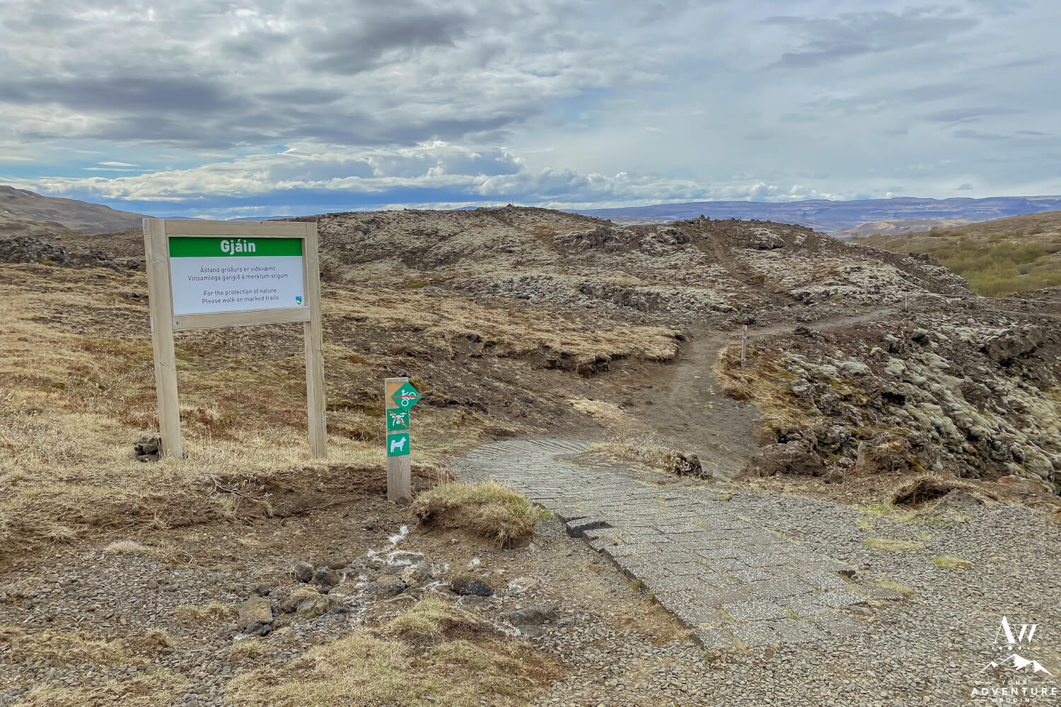 - View from Gjáin Parking Lot. The path to the right takes you down and the path to the left is an overview area.