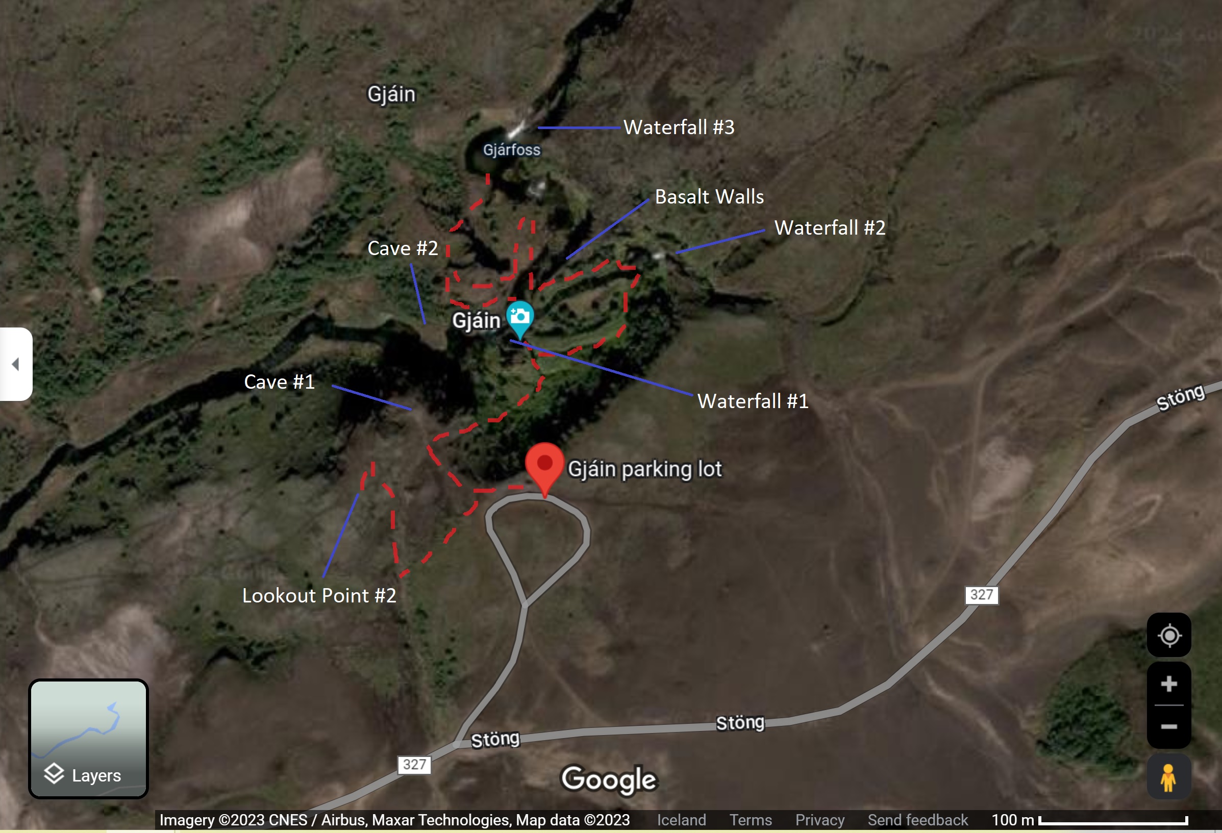 A word before we begin… Be aware, there is another parking point further down on the unmarked not paved road (usually very pitted with potholes) but there you can park, cross a manmade bridge, and hike for 10-30 minutes one way (depending on your pace) to get to Gjárfoss (waterfall #3) without crossing a river by foot. But in order to see the other falls in the area you would have to cross the rivers by foot or drive around to the side we highlight below.