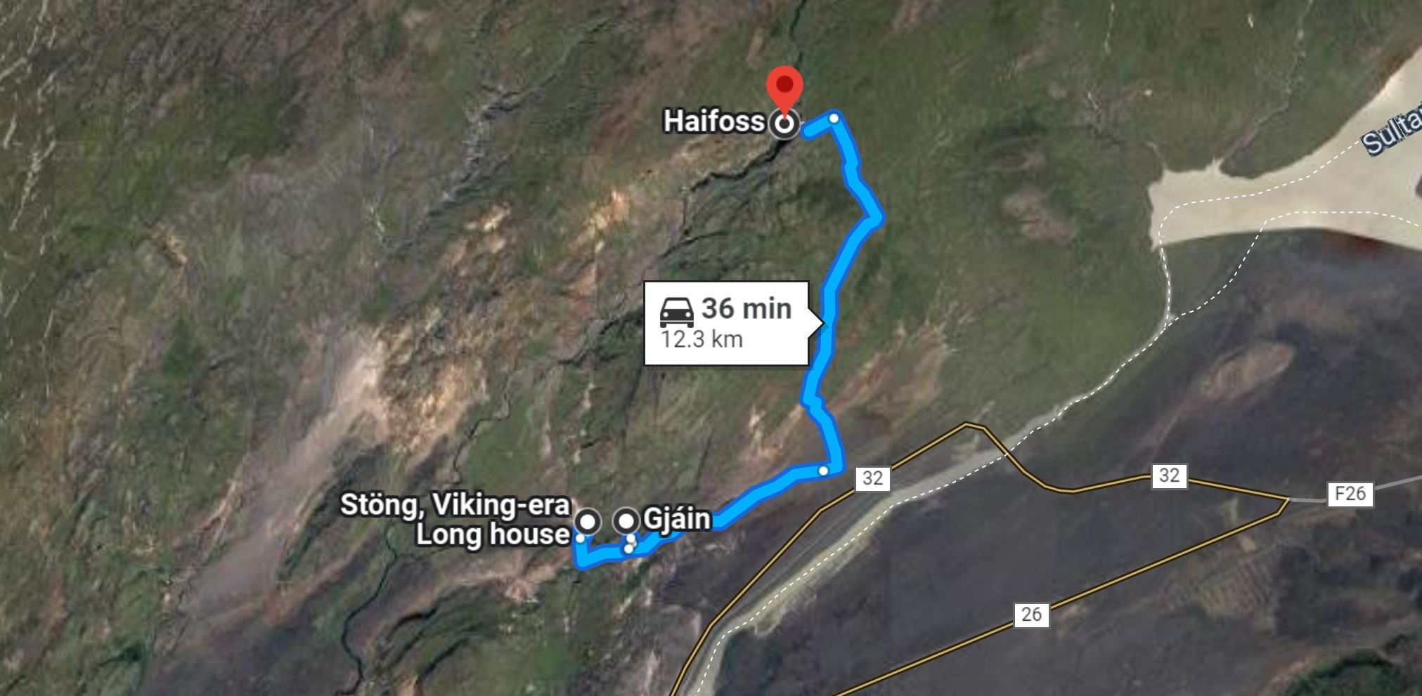 - At Þjórsárdalsvegur or Route #32 you’ll turn RIGHT and stay on this road for 42km / 26 miles.