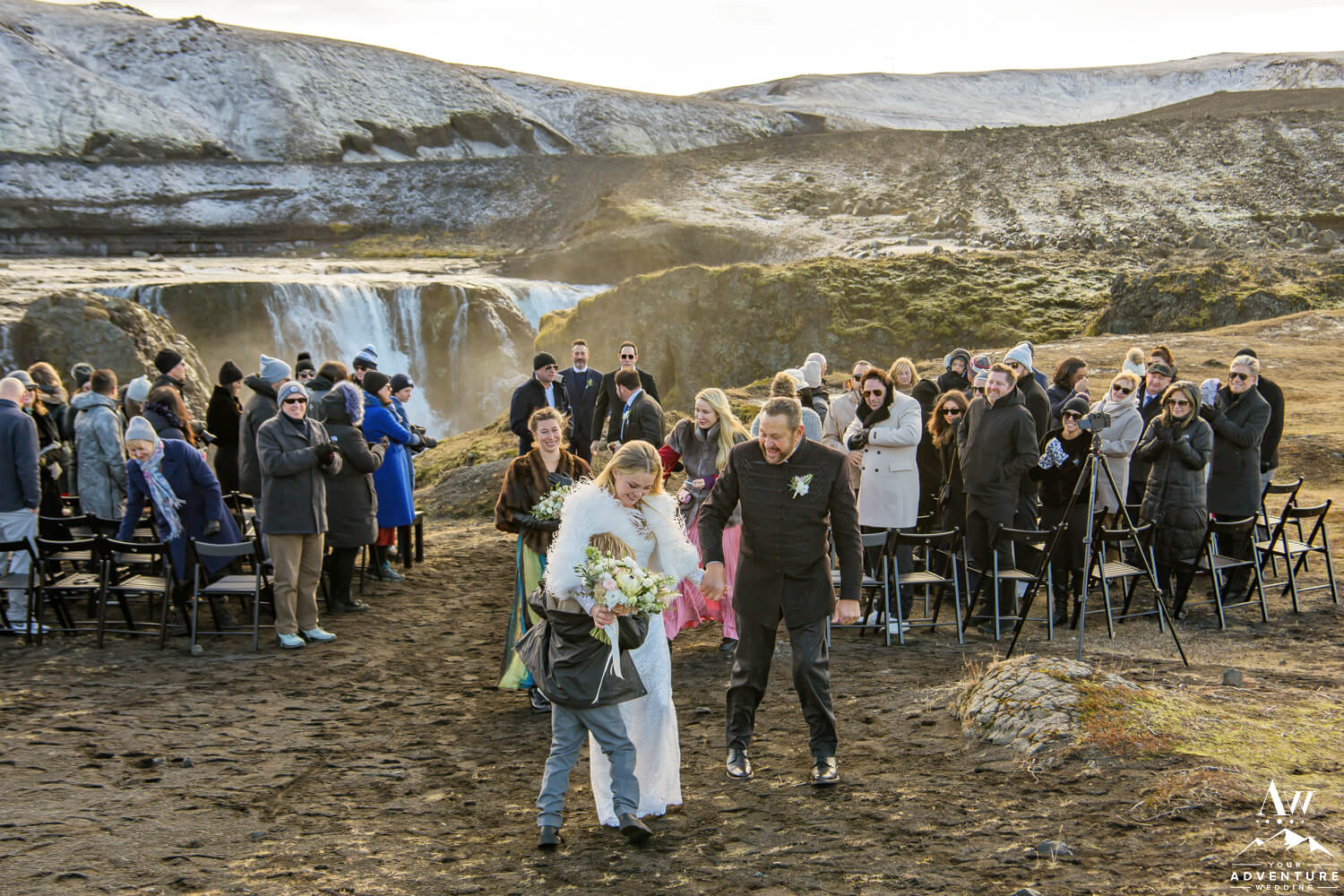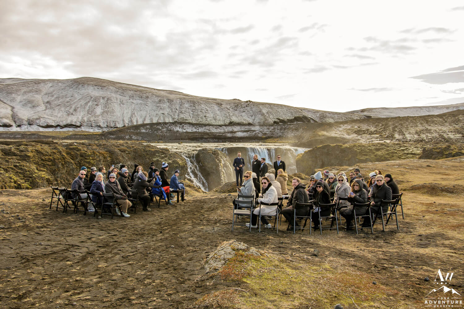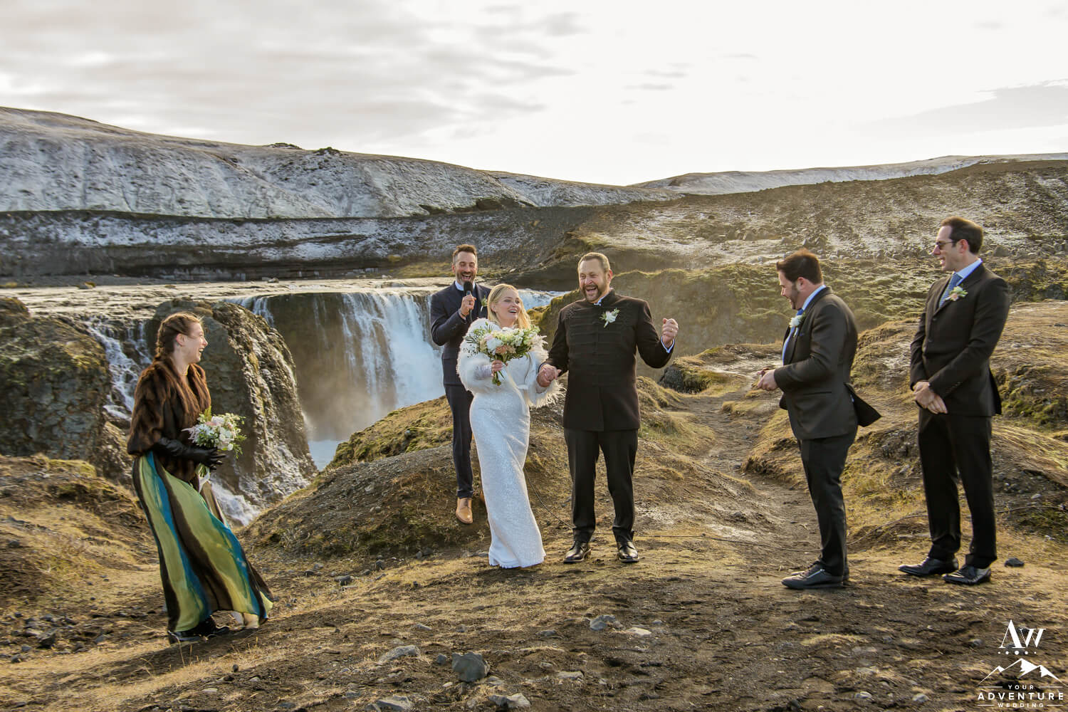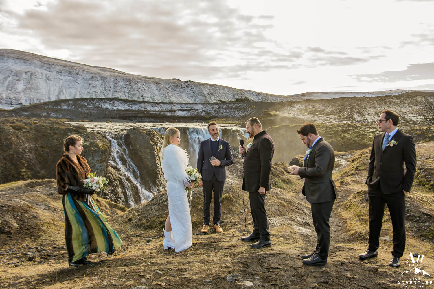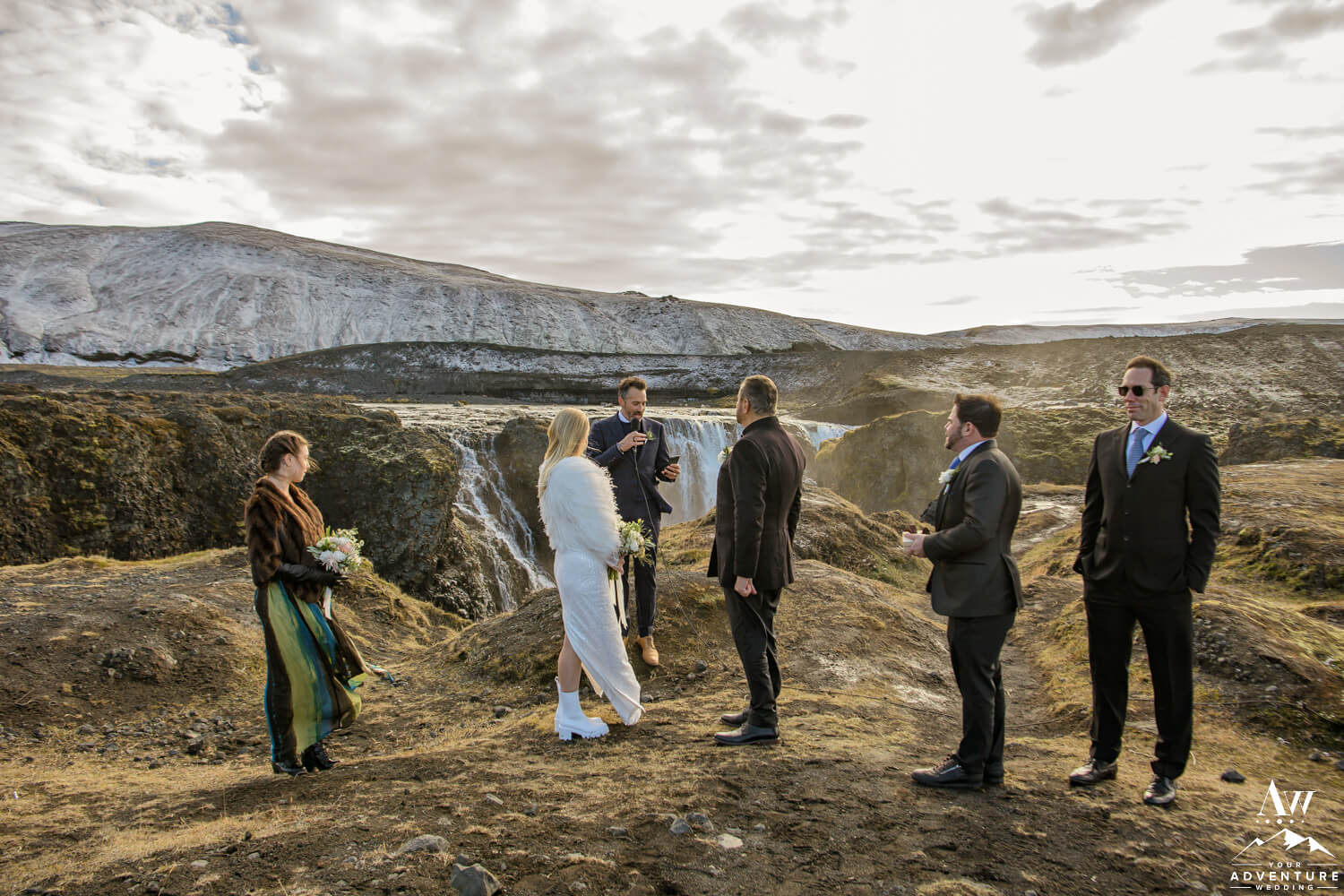 Back to Peter and Eva’s 2-day Iceland wedding adventure… Guests ooh’d and awe’d over the drivee, caught up with each other, and also learned some fabulous things about Iceland along the way. Upon arriving to the highland waterfall the group made their way down to the main attraction to be seated. Everyone then waited excitedly for the bride to walk down the aisle.