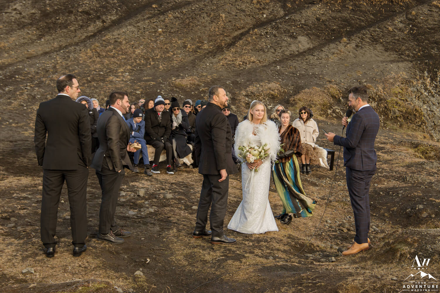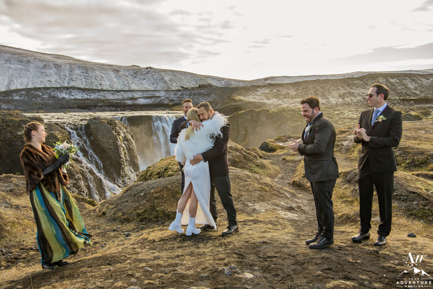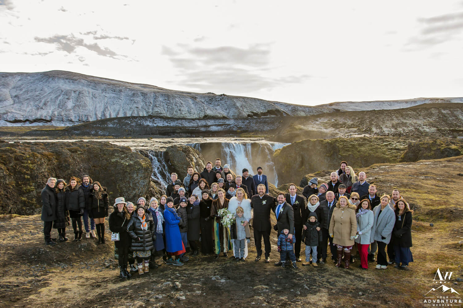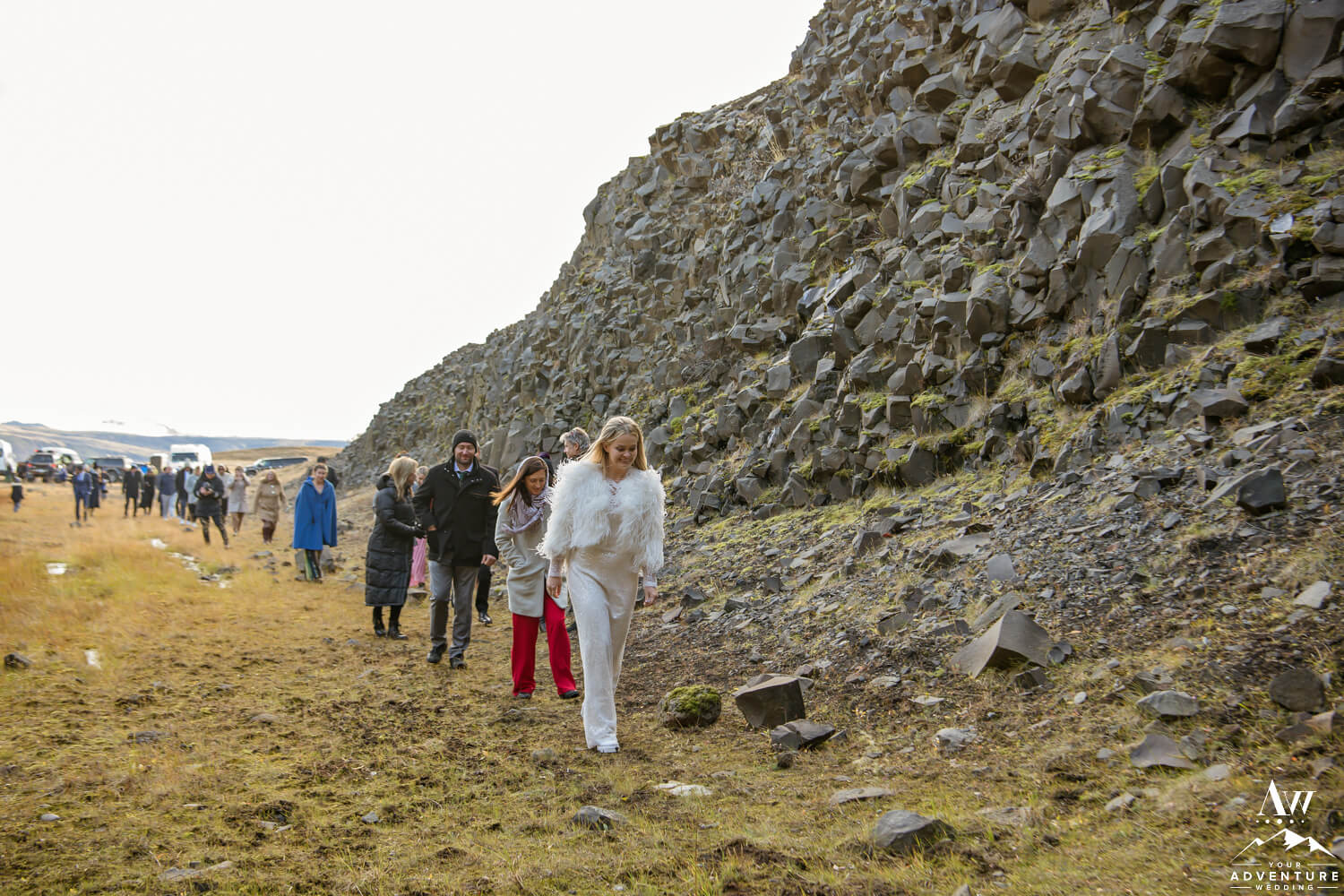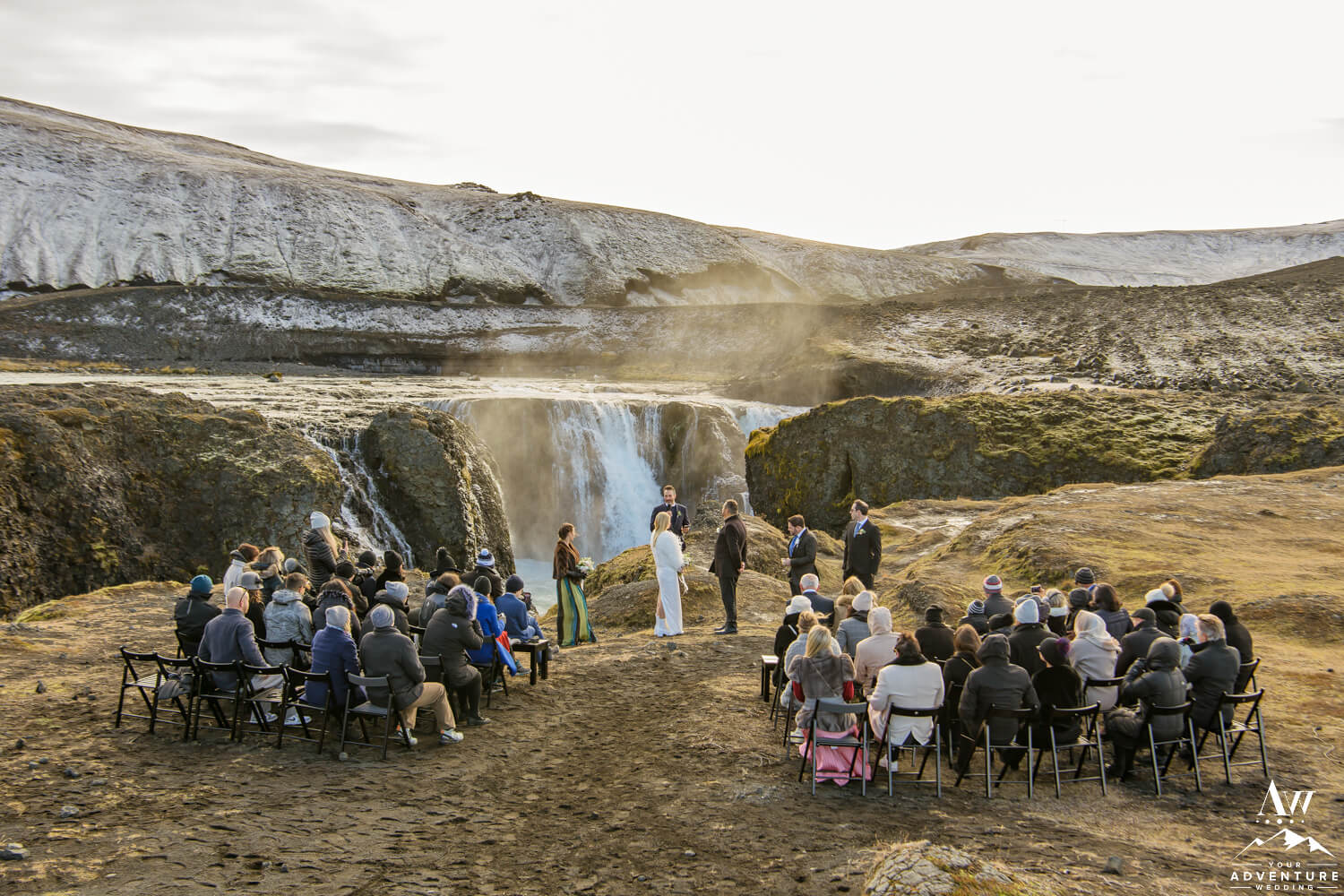 Back to Peter and Eva’s 2-day Iceland wedding adventure… Guests ooh’d and awe’d over the drivee, caught up with each other, and also learned some fabulous things about Iceland along the way. Upon arriving to the highland waterfall the group made their way down to the main attraction to be seated. Everyone then waited excitedly for the bride to walk down the aisle.