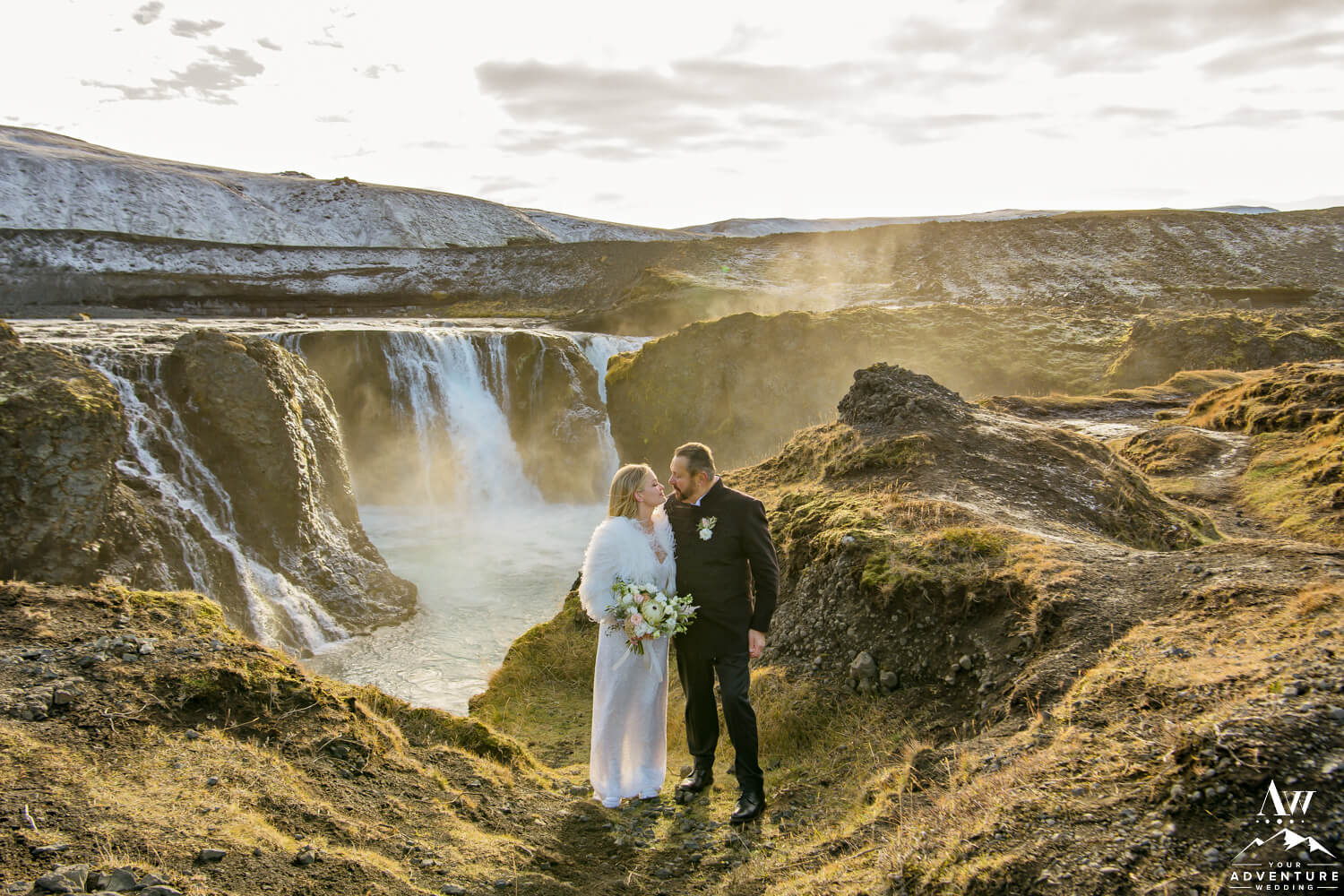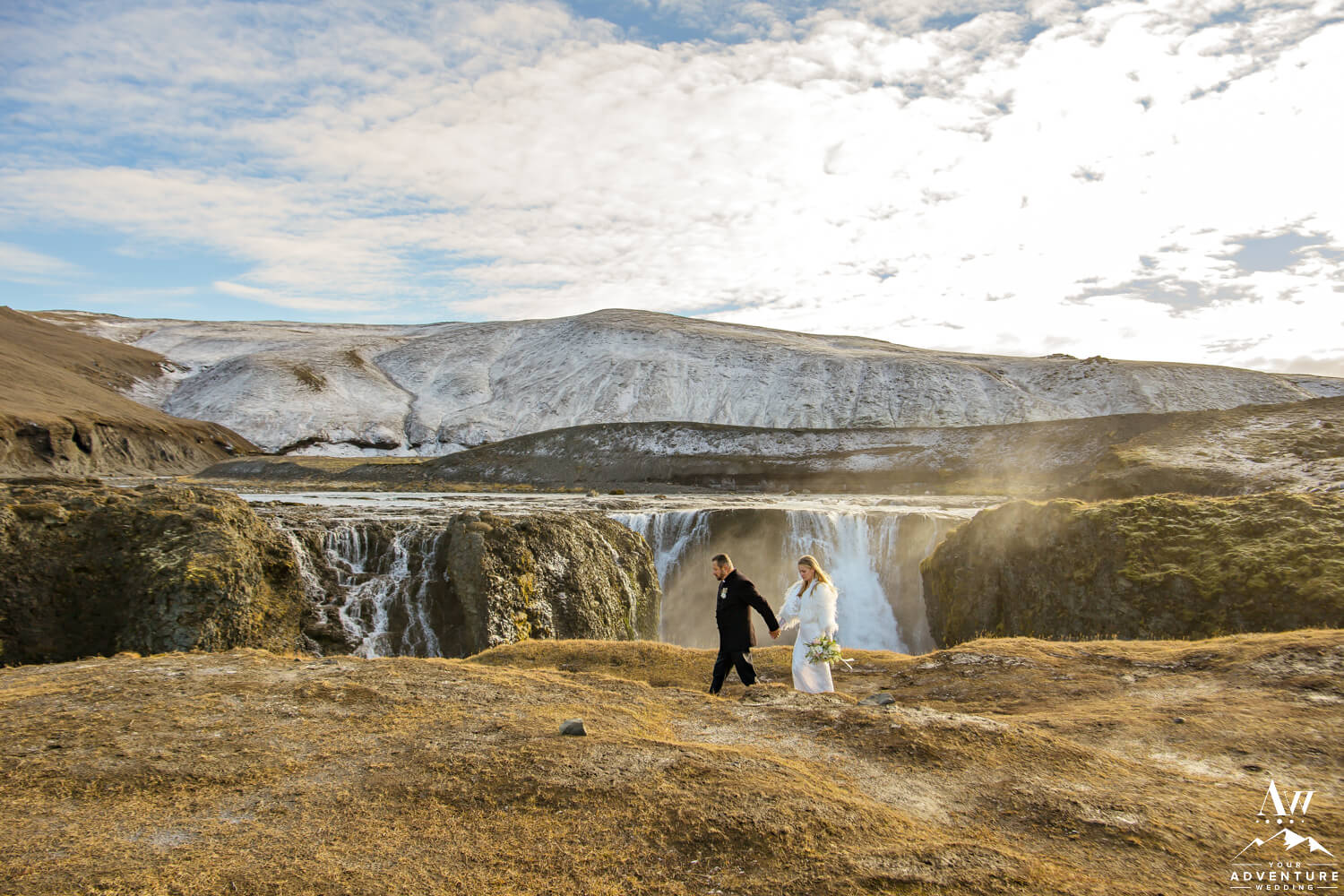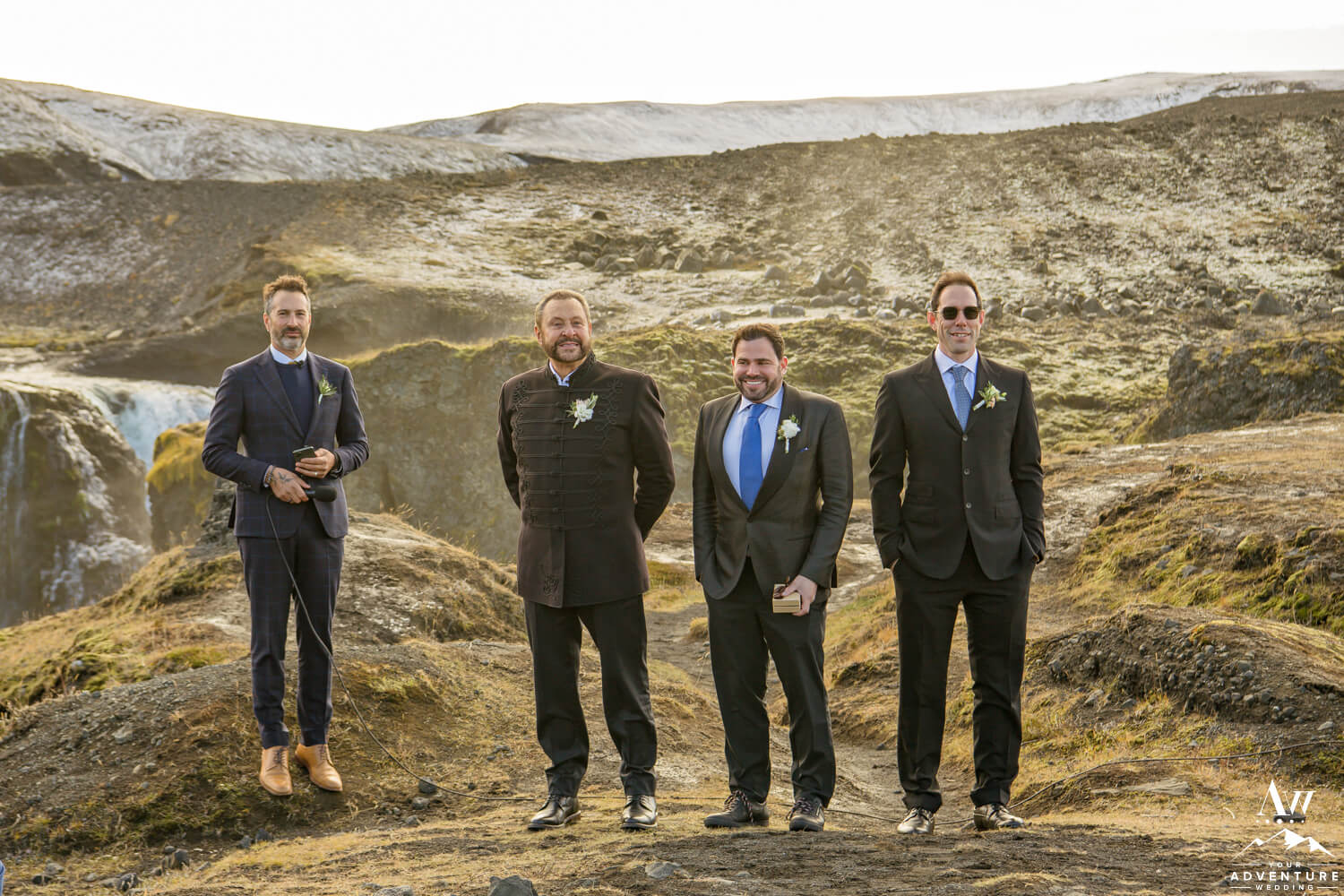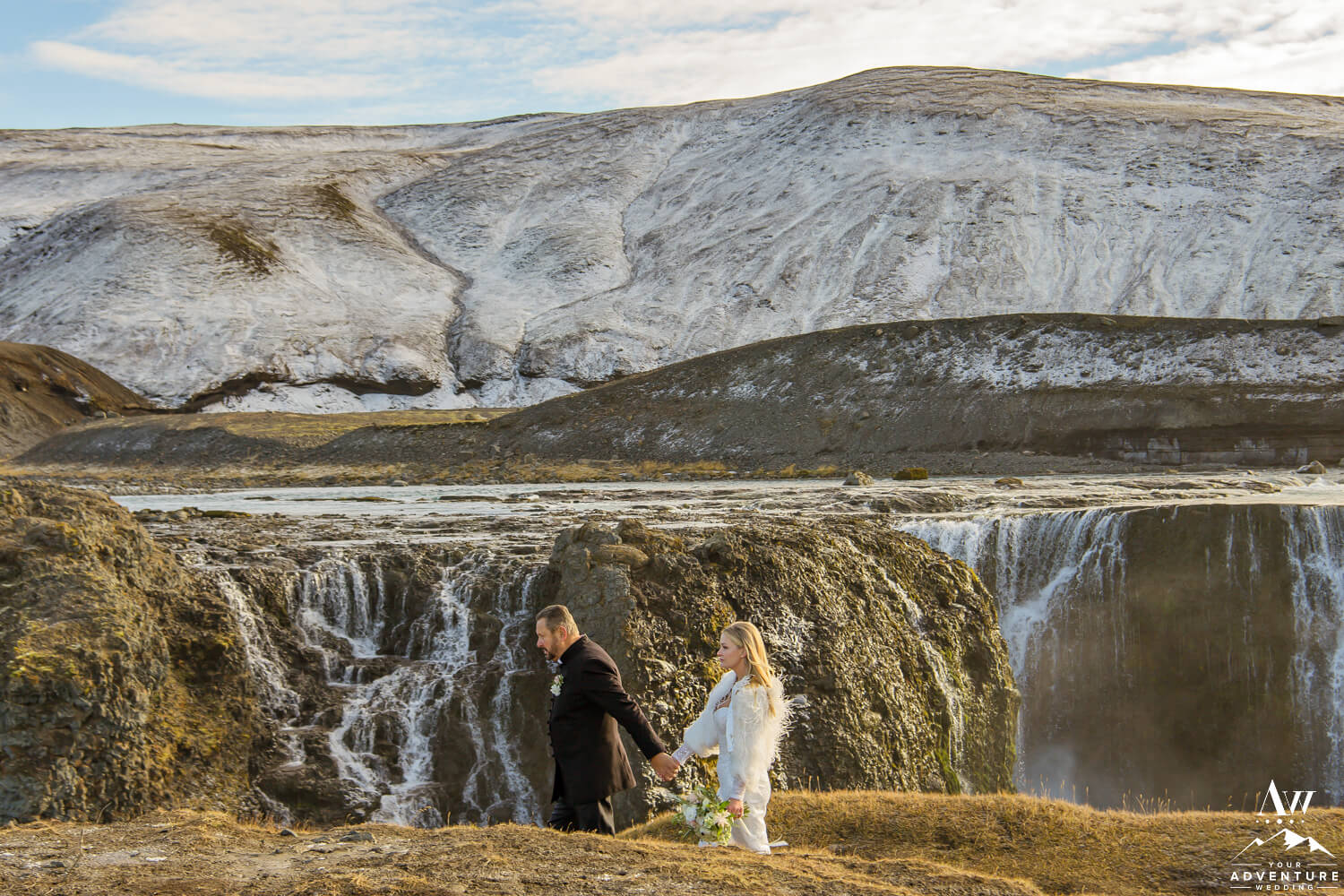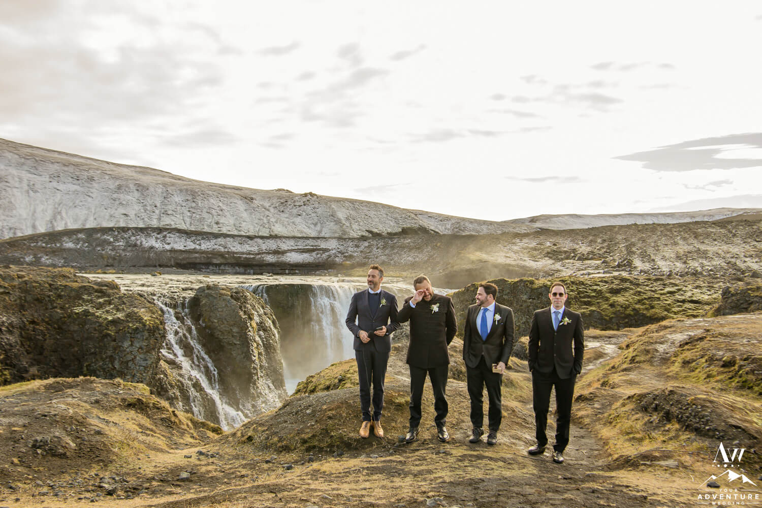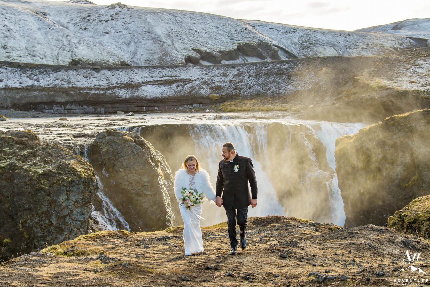 Back to Peter and Eva’s 2-day Iceland wedding adventure… Guests ooh’d and awe’d over the drivee, caught up with each other, and also learned some fabulous things about Iceland along the way. Upon arriving to the highland waterfall the group made their way down to the main attraction to be seated. Everyone then waited excitedly for the bride to walk down the aisle.