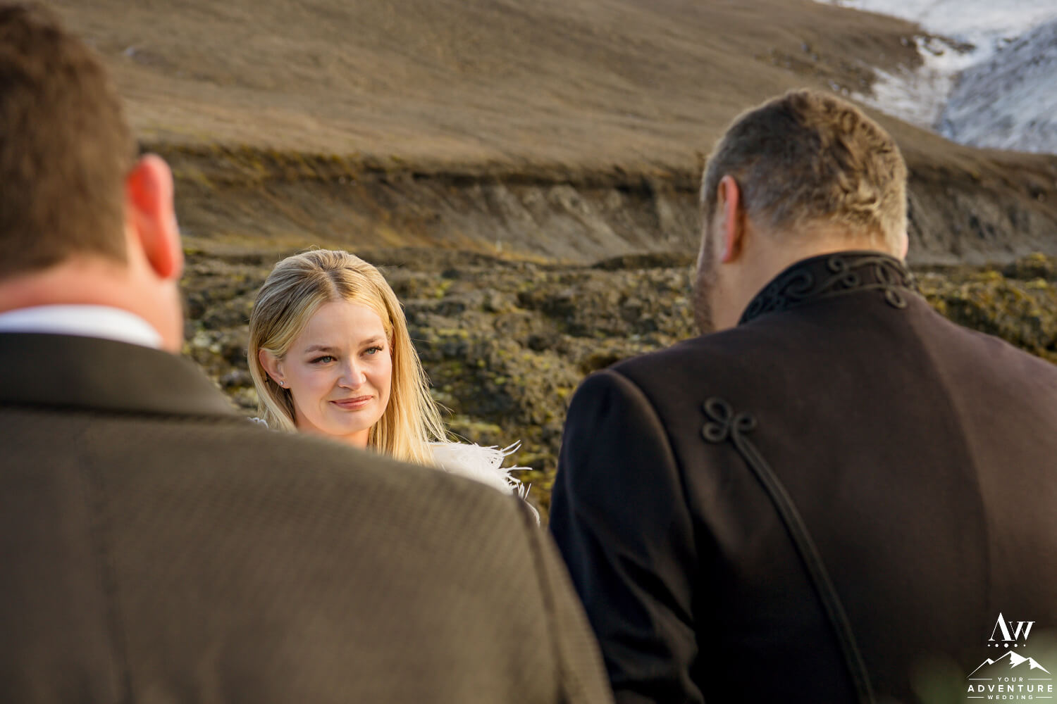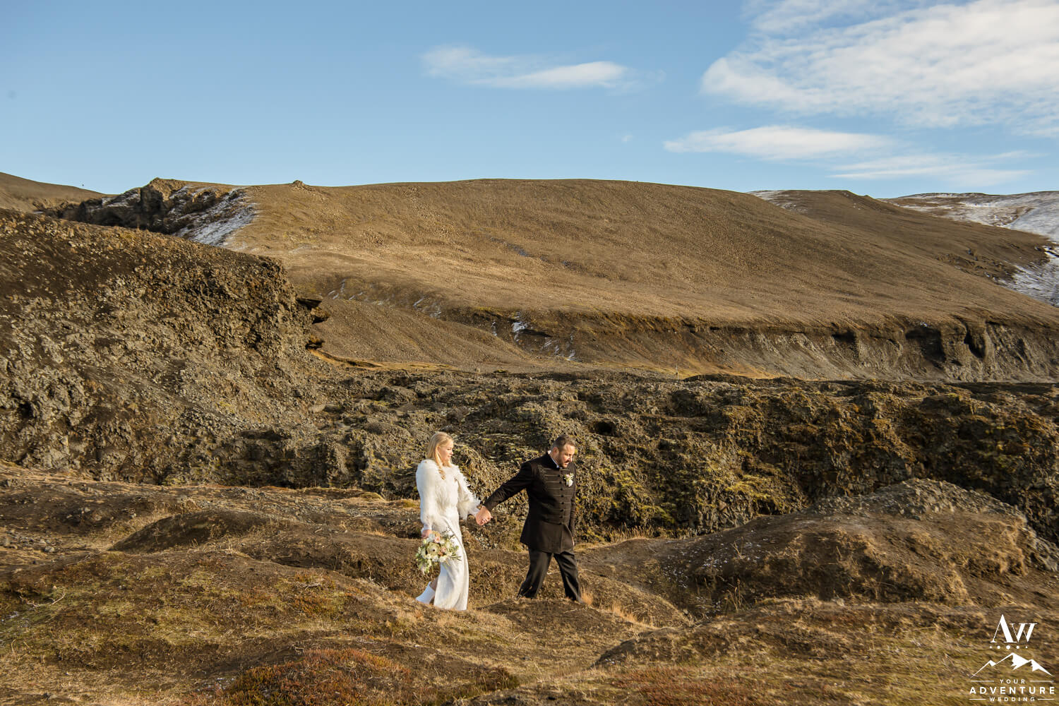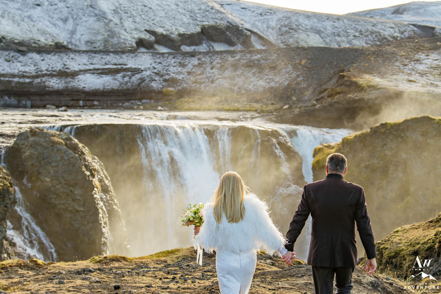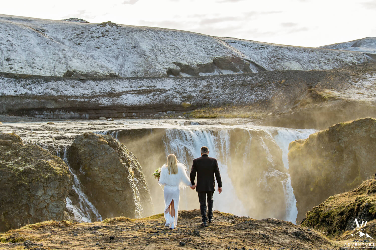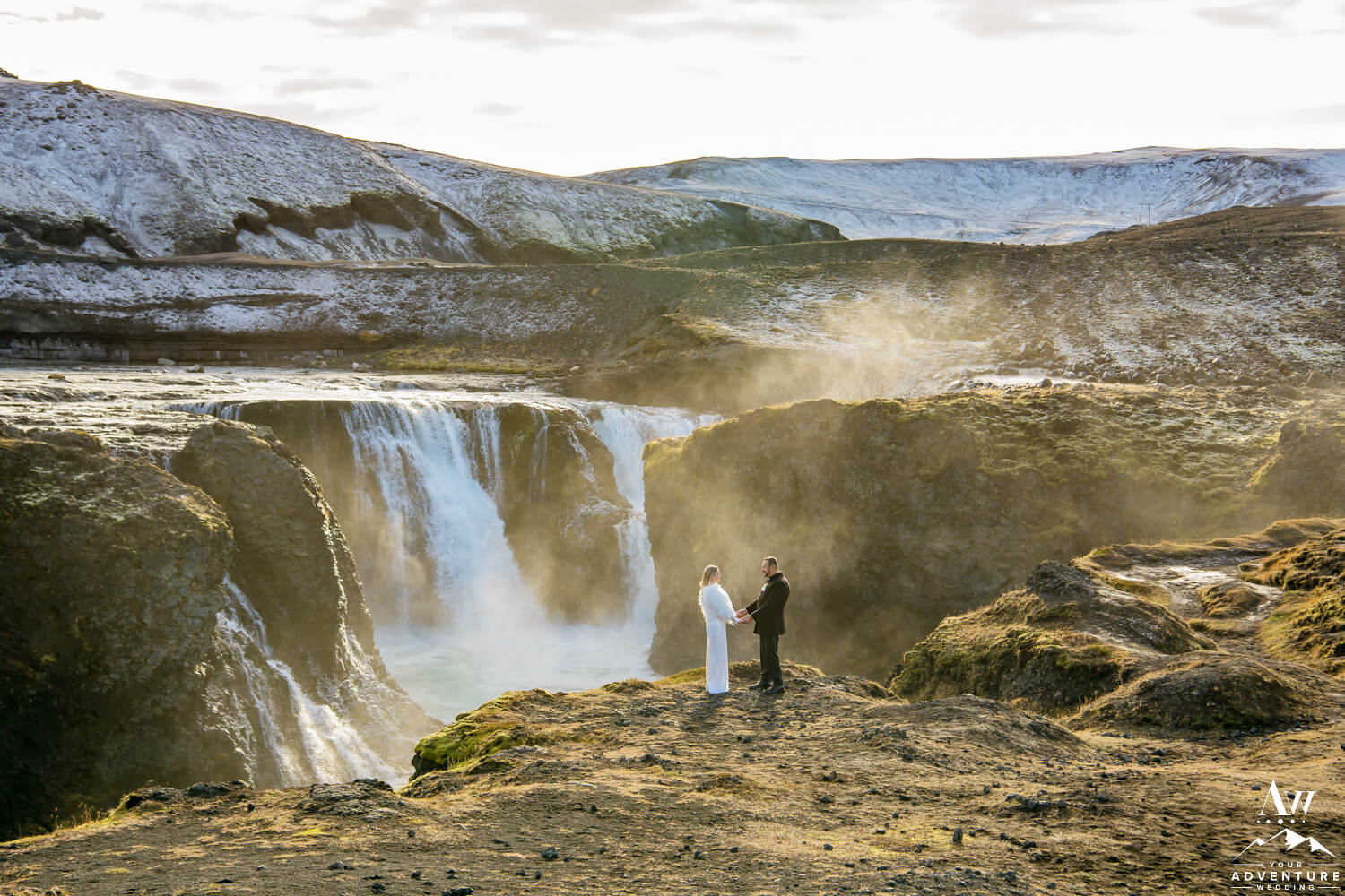 Back to Peter and Eva’s 2-day Iceland wedding adventure… Guests ooh’d and awe’d over the drivee, caught up with each other, and also learned some fabulous things about Iceland along the way. Upon arriving to the highland waterfall the group made their way down to the main attraction to be seated. Everyone then waited excitedly for the bride to walk down the aisle.