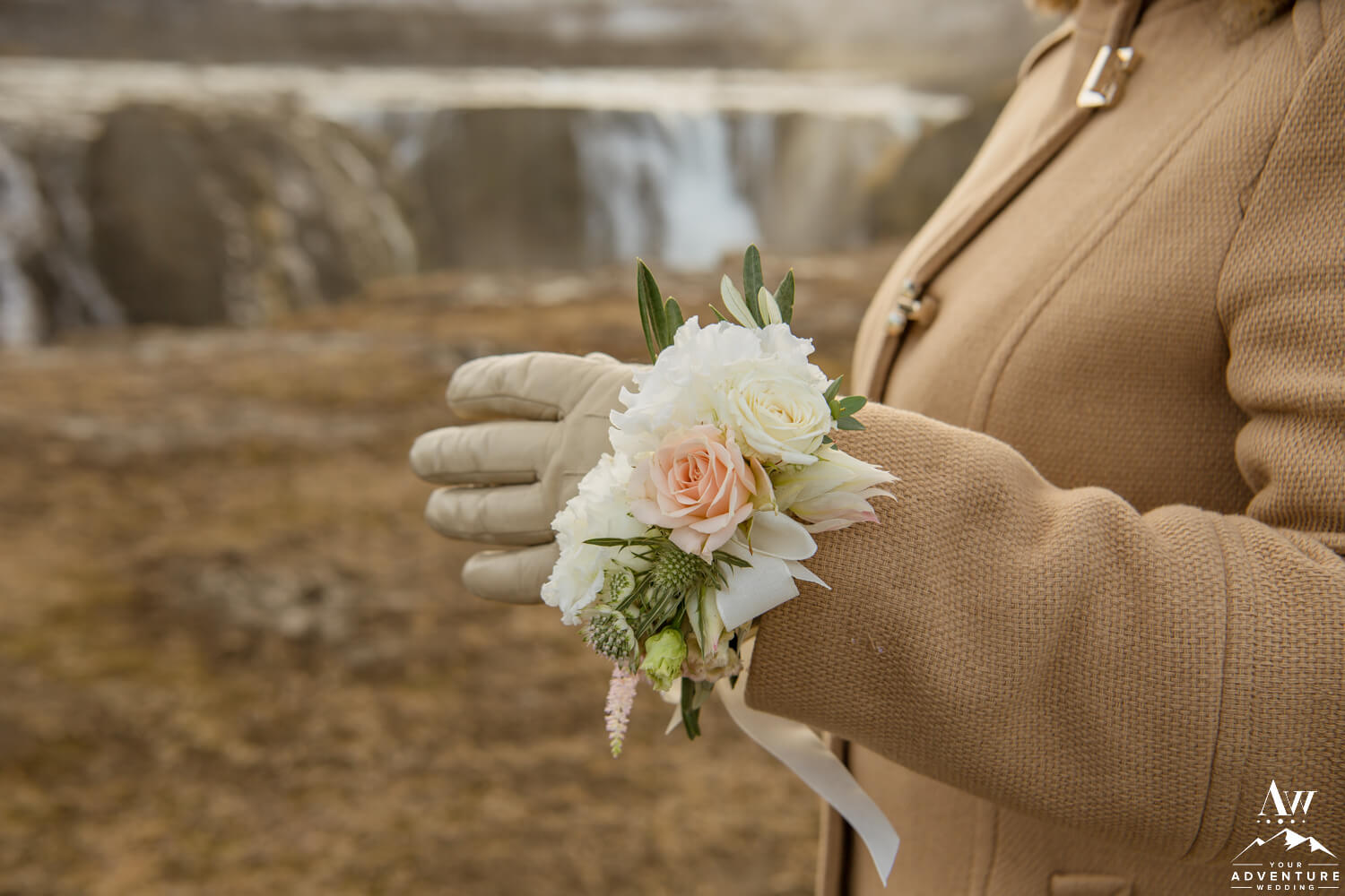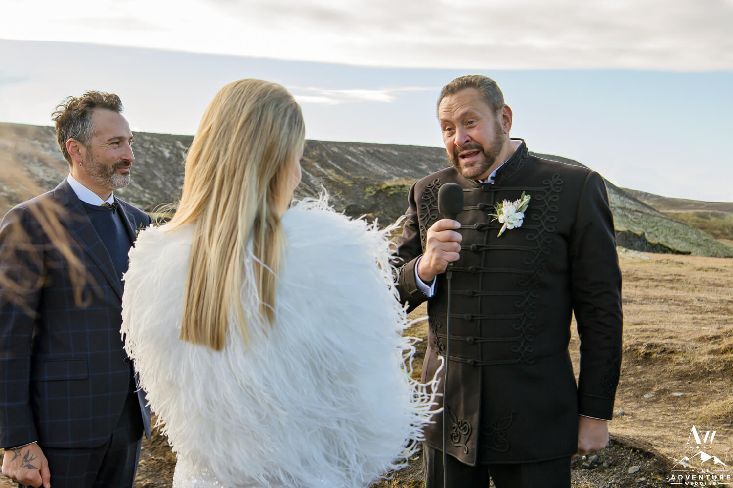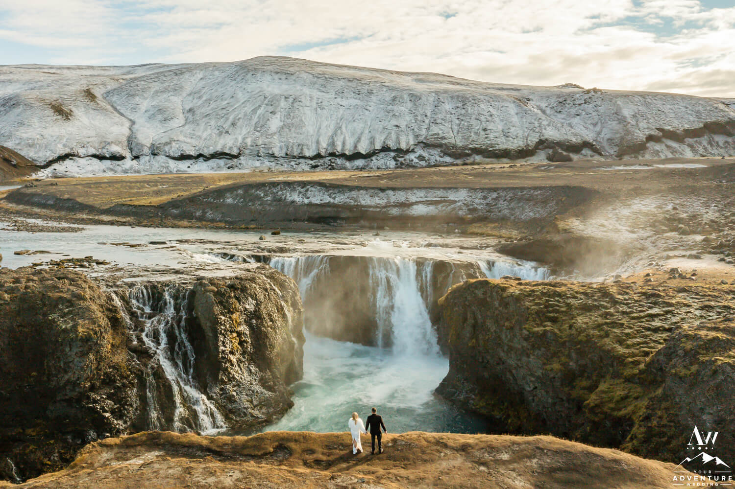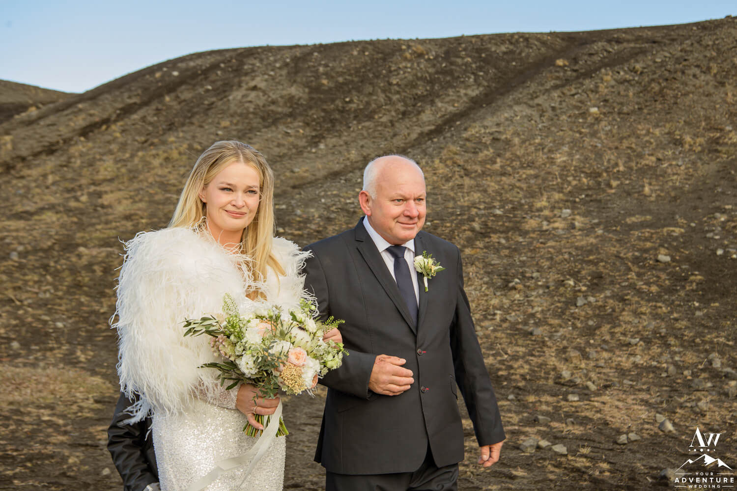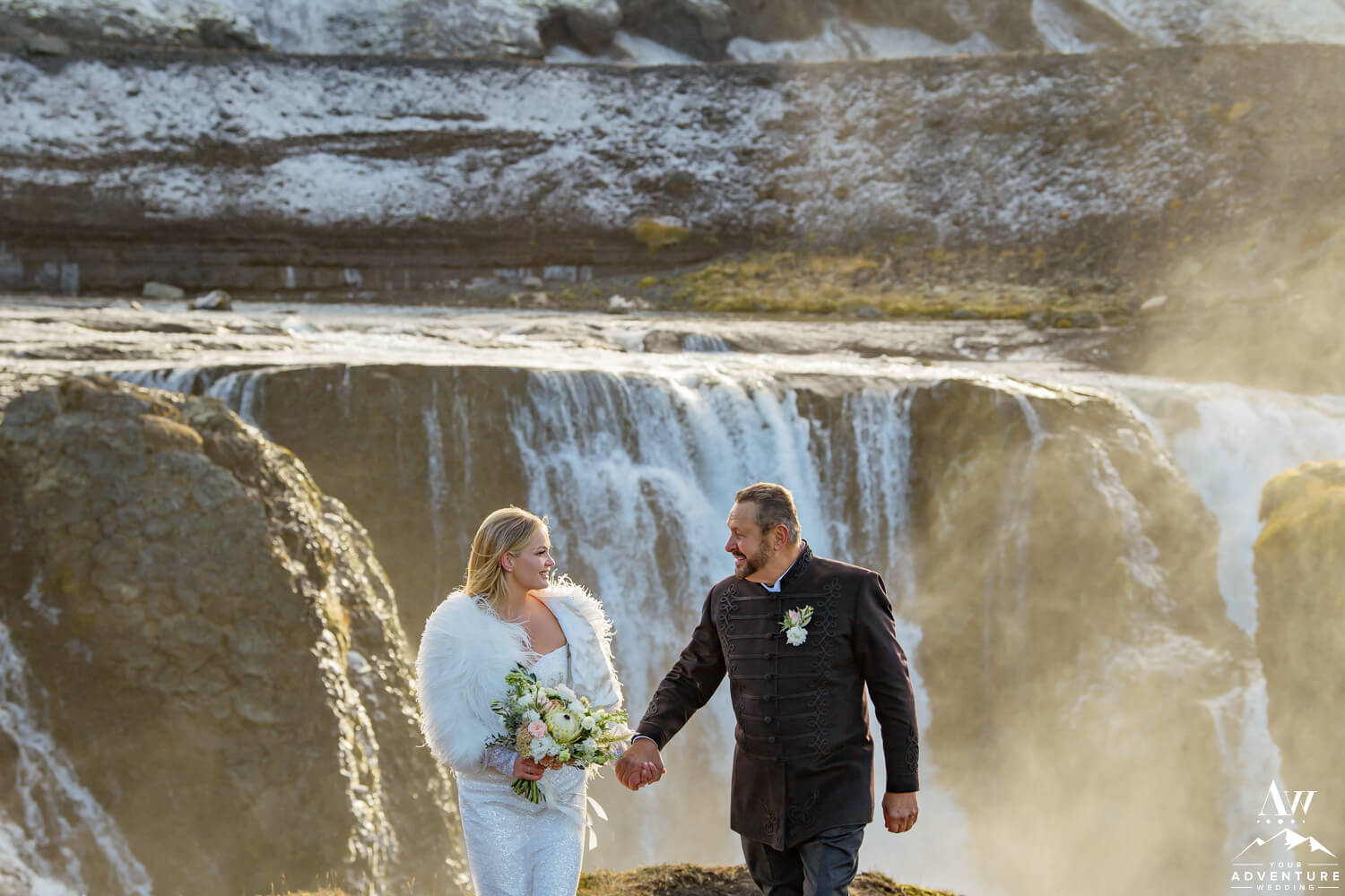 Back to Peter and Eva’s 2-day Iceland wedding adventure… Guests ooh’d and awe’d over the drivee, caught up with each other, and also learned some fabulous things about Iceland along the way. Upon arriving to the highland waterfall the group made their way down to the main attraction to be seated. Everyone then waited excitedly for the bride to walk down the aisle.