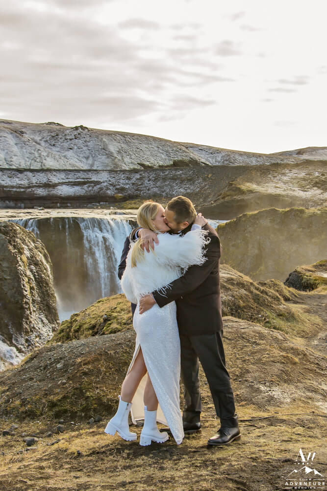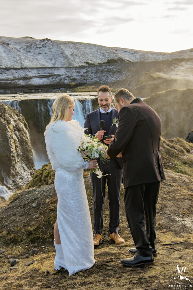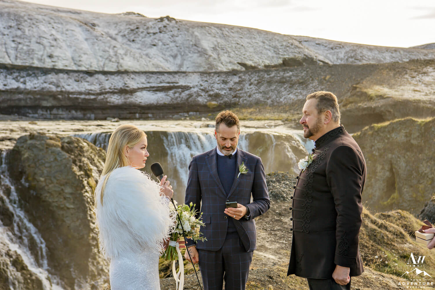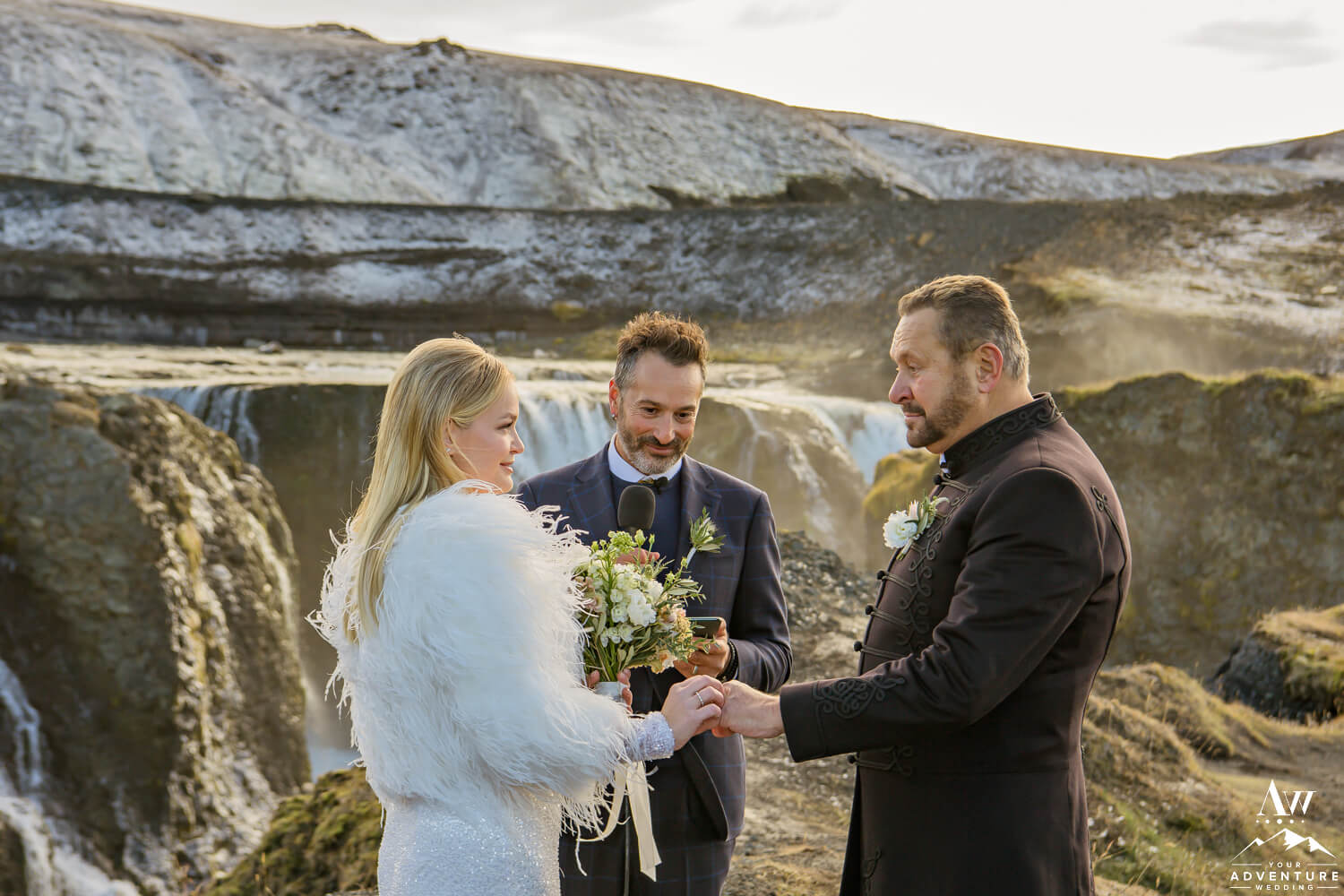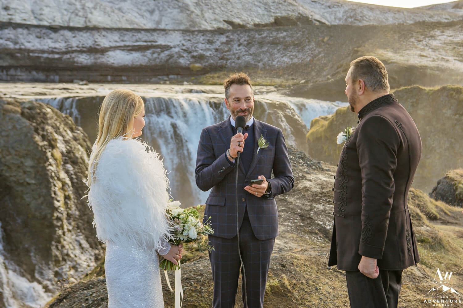 Next, their symbolic ceremony was officiated by one of their close friends. Meanwhile, the pair exchanged personal vows, rings, and started the celebration with a kiss! Following the Iceland waterfall wedding, the group posed for photos and explored the magnificence of the place!!