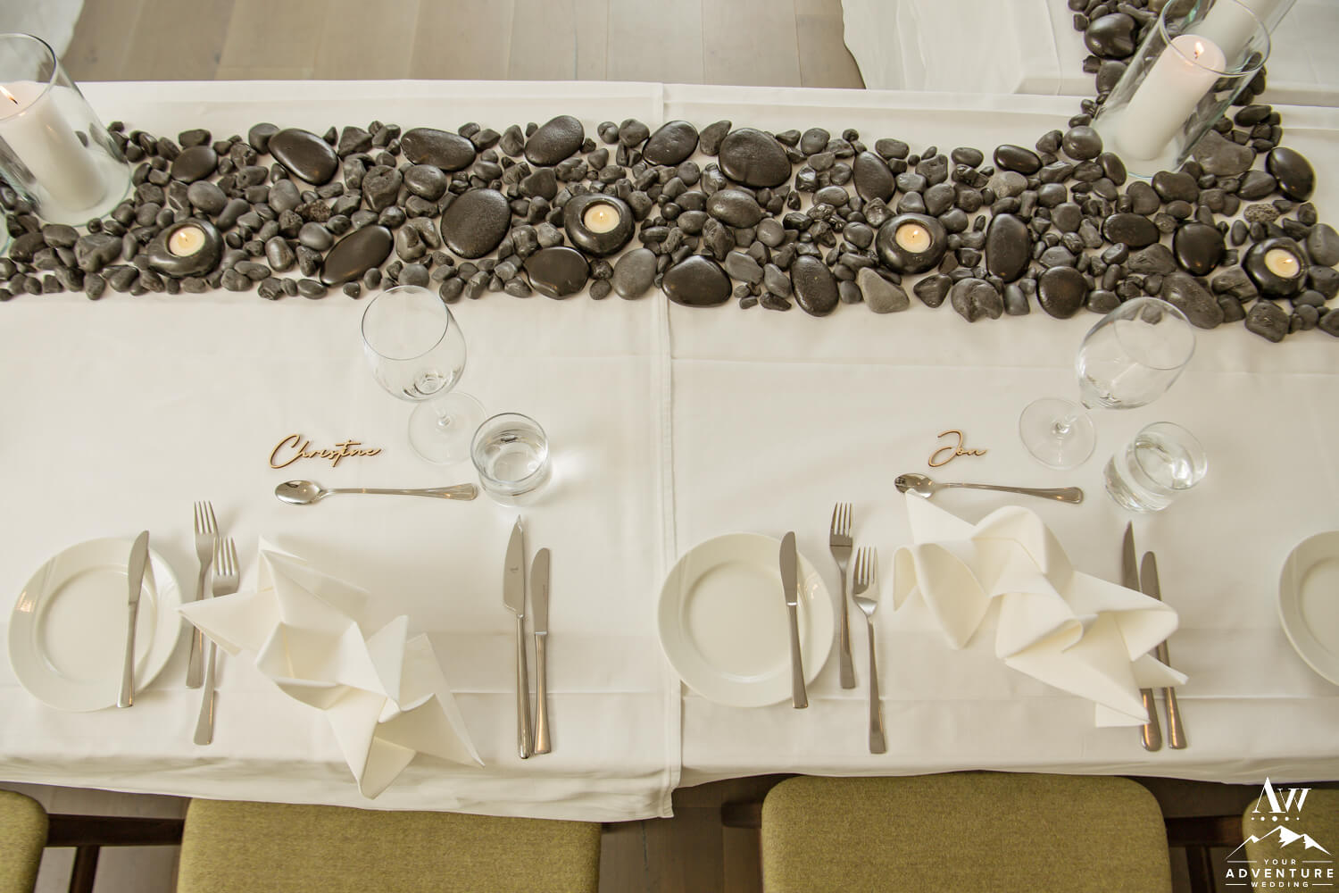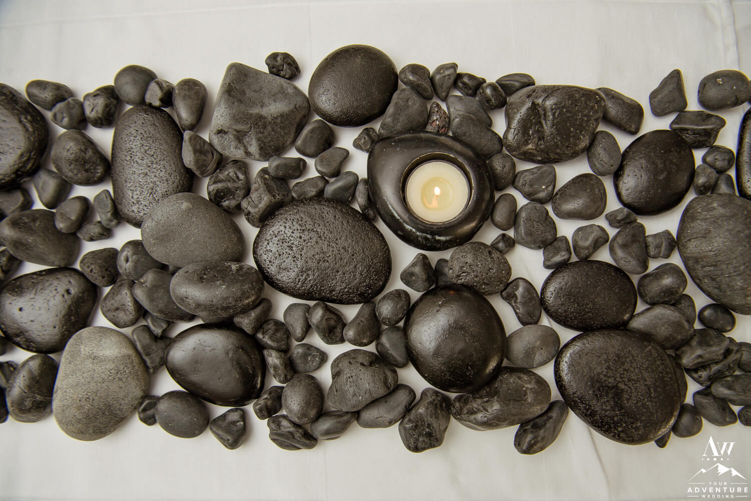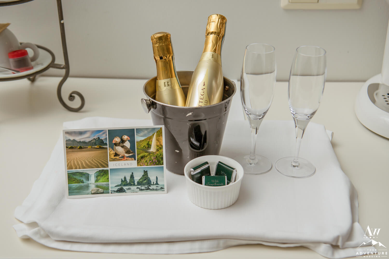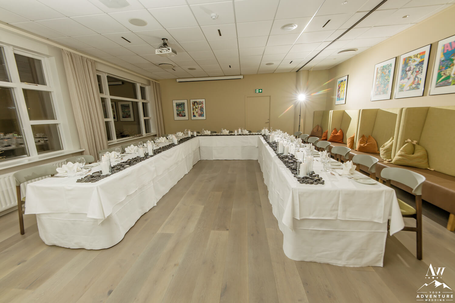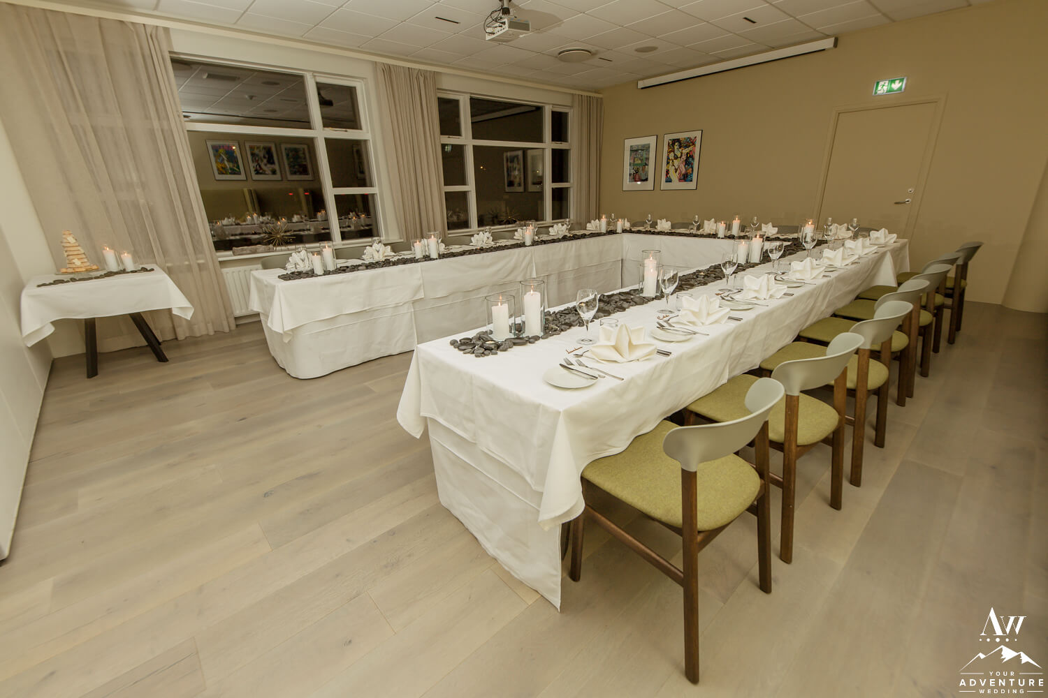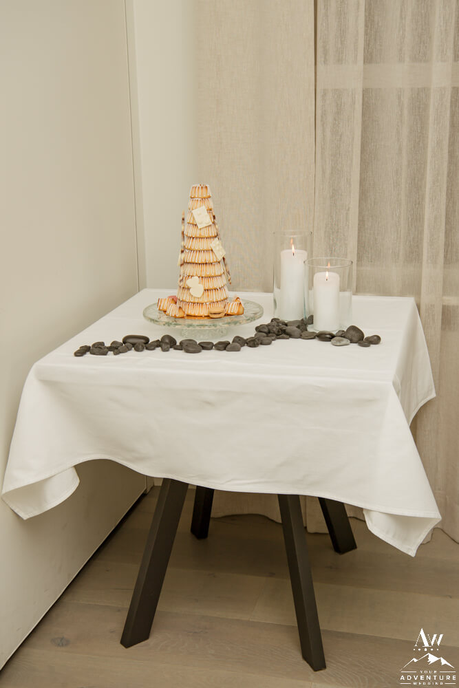 Moreover, when the October wedding adventure group returned to Hotel Klaustur, they had time to rest and refresh. When 7:30pm came, they were asked to find their seats in the private dining room at Klaustur Restaurant. First, they were greeted by our Iceland Wedding Planner team. Second, they delighted in the beautiful earthy basalt rock décor that was on the table. Third, seeing a traditional Iceland wedding cake (kransakaka) is always a fun cultural tidbit to share. Fourth, the group dined on a local menu created by the talented local Chef Einar B. Halldórsson. However, that’s not how the night ended… Please continue!