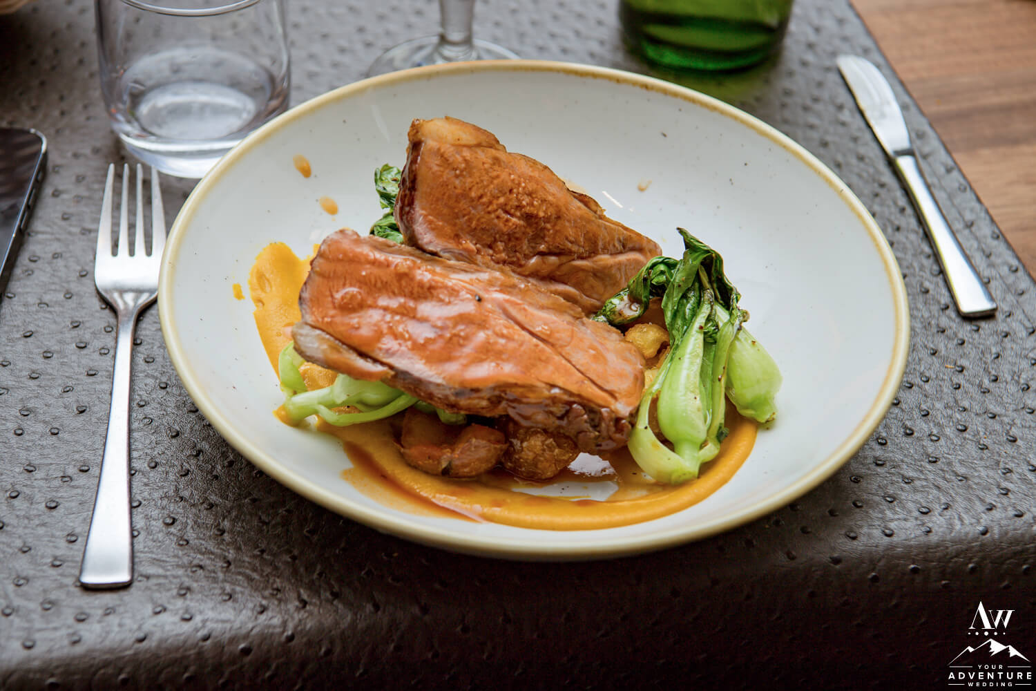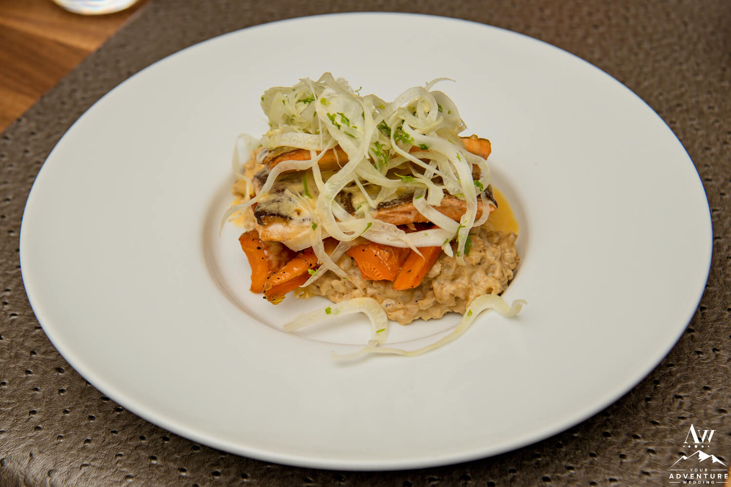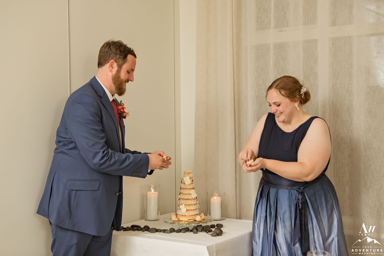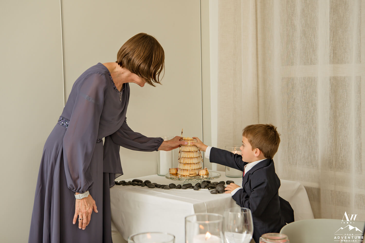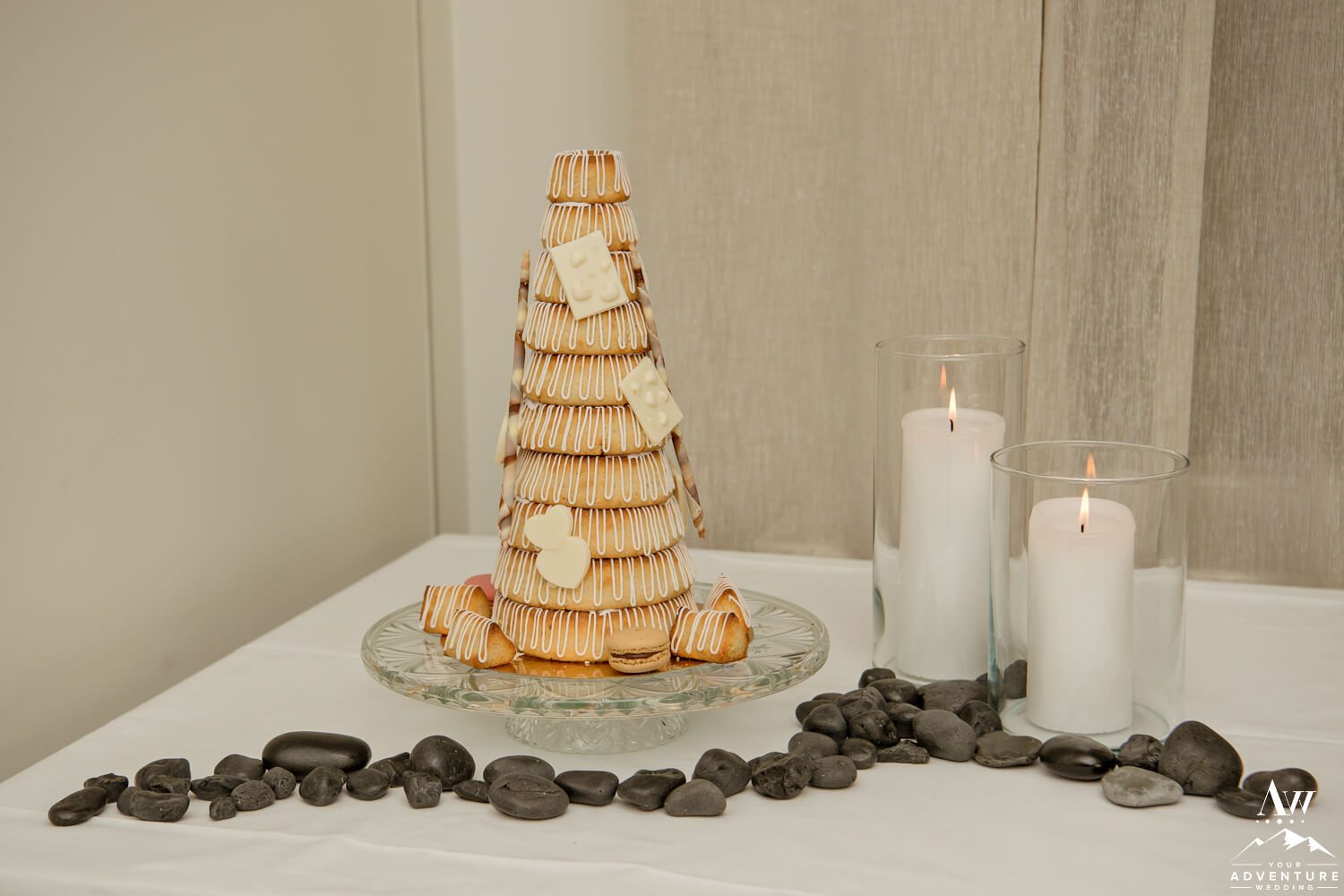 Moreover, when the October wedding adventure group returned to Hotel Klaustur, they had time to rest and refresh. When 7:30pm came, they were asked to find their seats in the private dining room at Klaustur Restaurant. First, they were greeted by our Iceland Wedding Planner team. Second, they delighted in the beautiful earthy basalt rock décor that was on the table. Third, seeing a traditional Iceland wedding cake (kransakaka) is always a fun cultural tidbit to share. Fourth, the group dined on a local menu created by the talented local Chef Einar B. Halldórsson. However, that’s not how the night ended… Please continue!