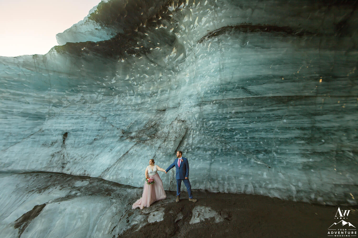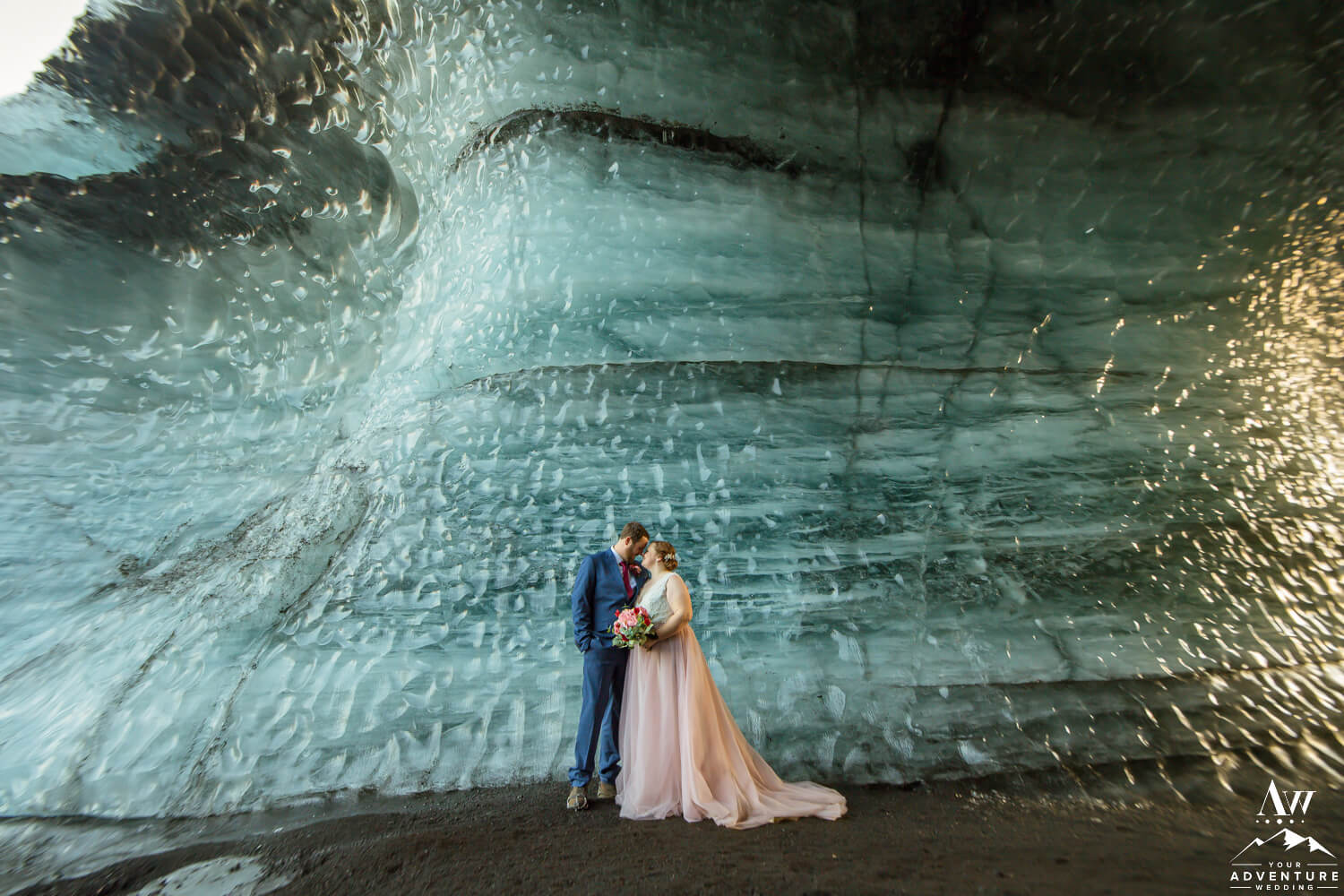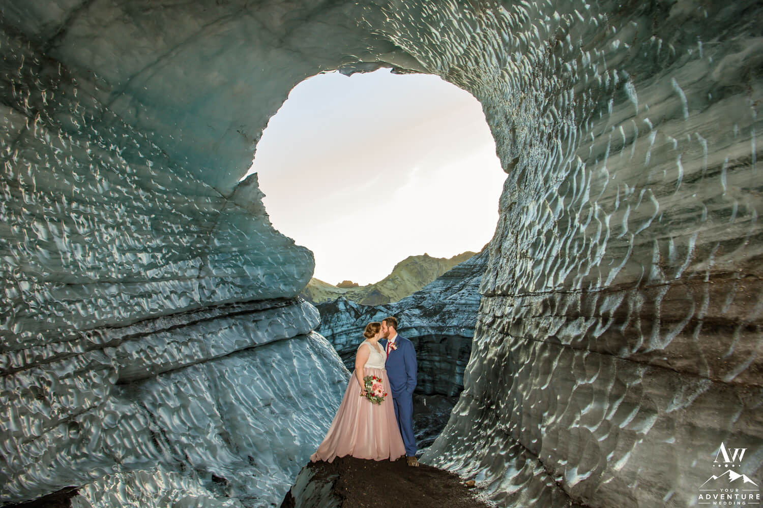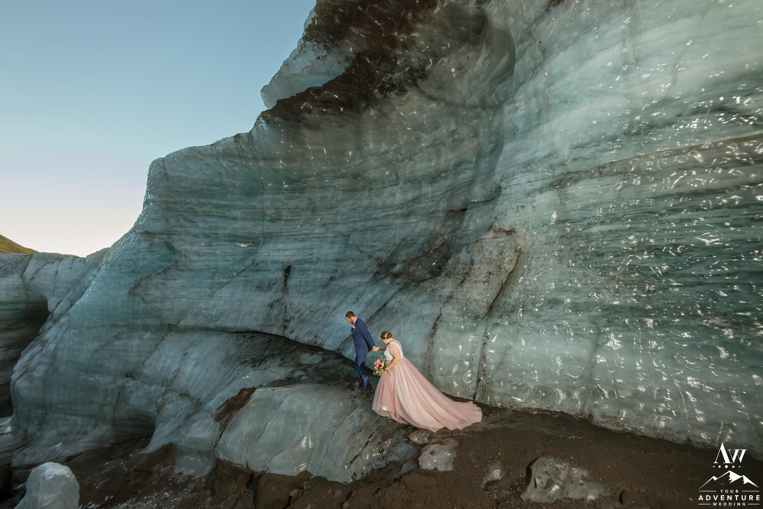The light and temperatures began dropping very quickly on the way up to Katla Glacier, which is an outlet to Mýrdalsjökull. But the groups excitement to experience the glacier kept everyone warm. The newlyweds and their October adventure wedding group geared up and hiked to the Katla ice cave that is usually very touristy during normal business hours, but today it was reserved for us! Meanwhile, the group marveled over the scenes, explored the ice cave thoroughly before hiking back out. On the way out, the newlyweds stole some kisses in front of the iconic sci-fi hit Star Wars Rogue One.