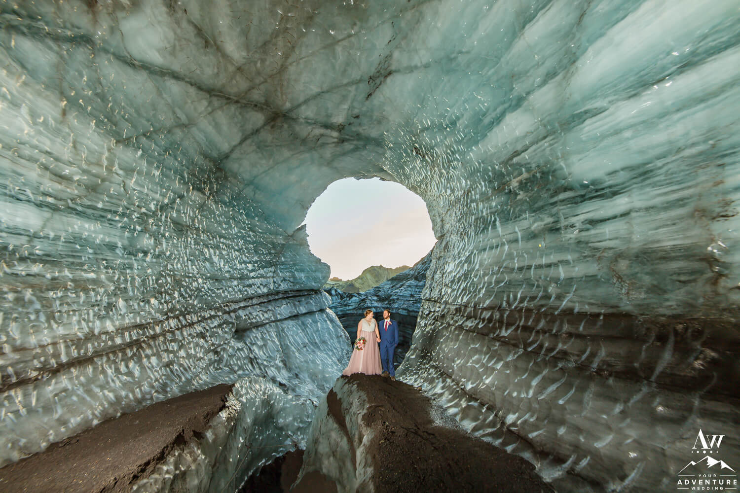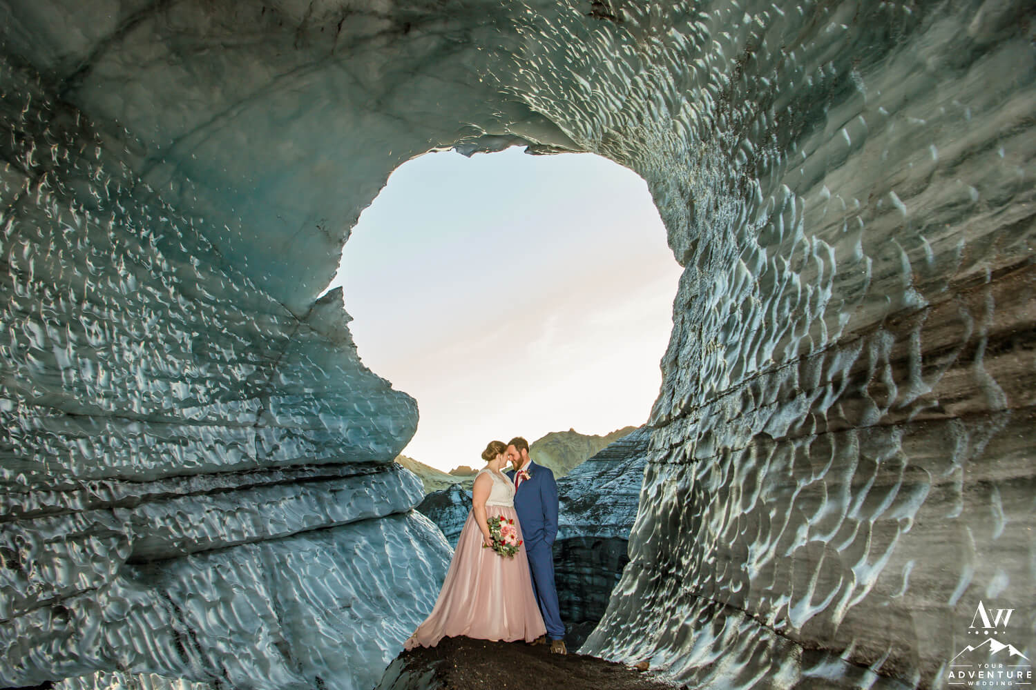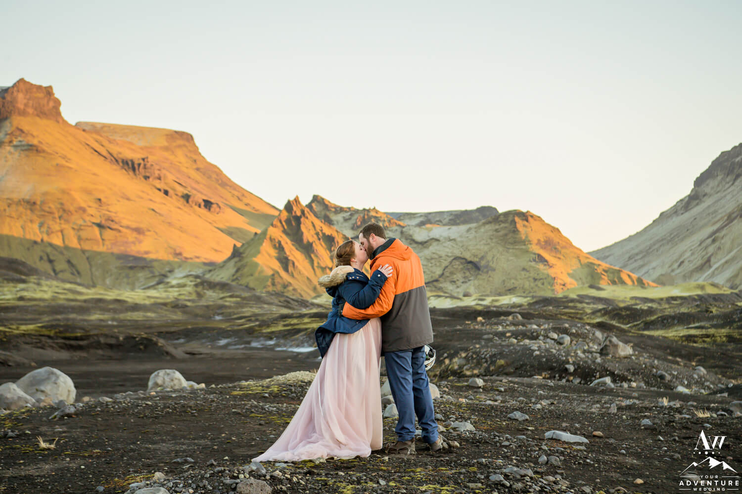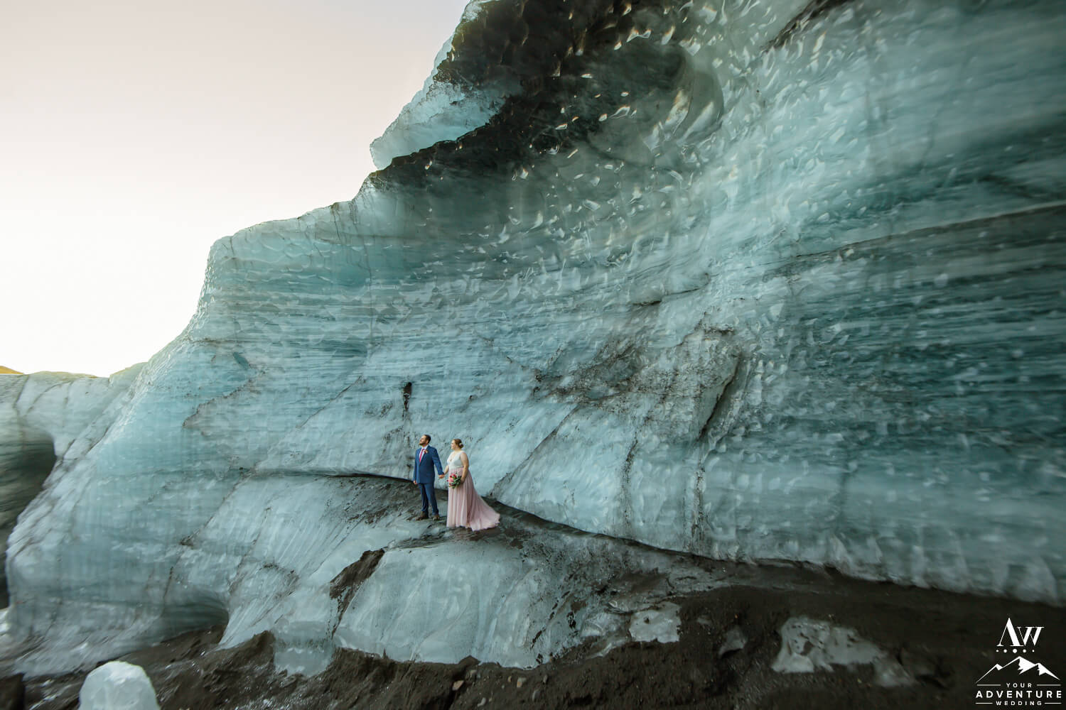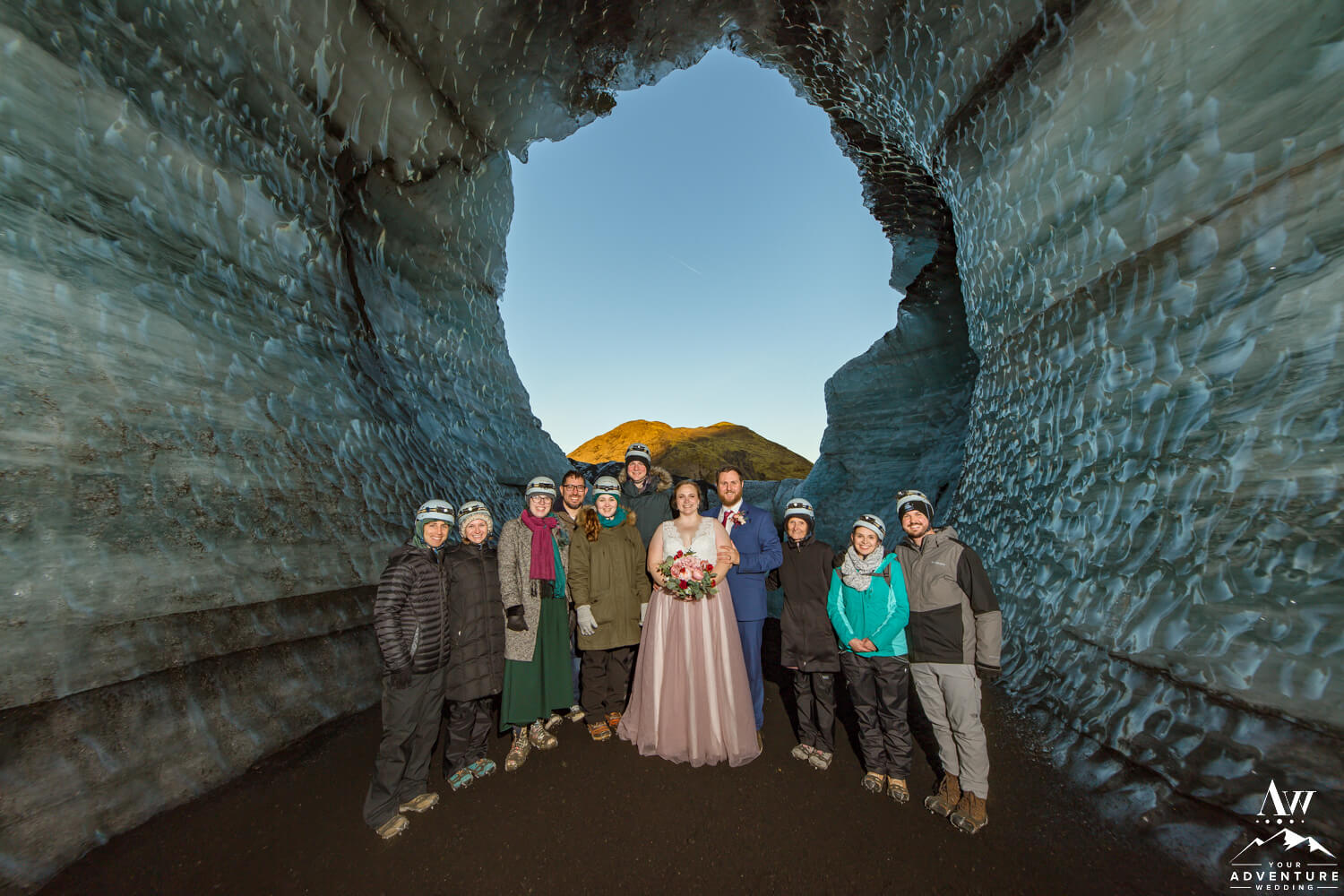 The light and temperatures began dropping very quickly on the way up to Katla Glacier, which is an outlet to Mýrdalsjökull. But the groups excitement to experience the glacier kept everyone warm. The newlyweds and their October adventure wedding group geared up and hiked to the Katla ice cave that is usually very touristy during normal business hours, but today it was reserved for us! Meanwhile, the group marveled over the scenes, explored the ice cave thoroughly before hiking back out. On the way out, the newlyweds stole some kisses in front of the iconic sci-fi hit Star Wars Rogue One.
