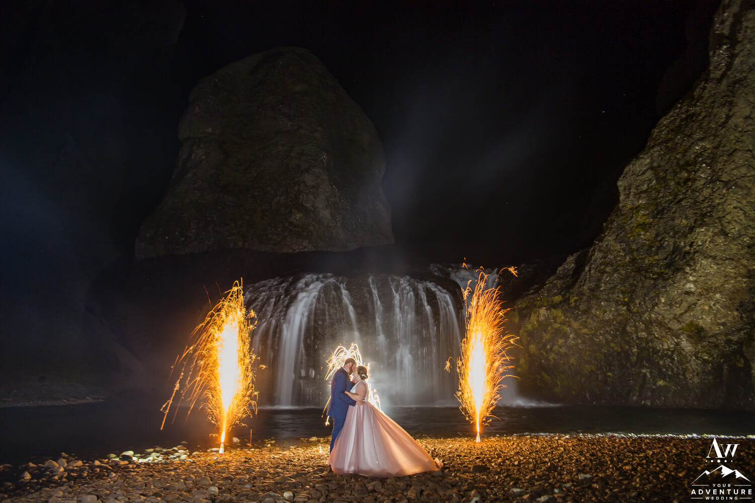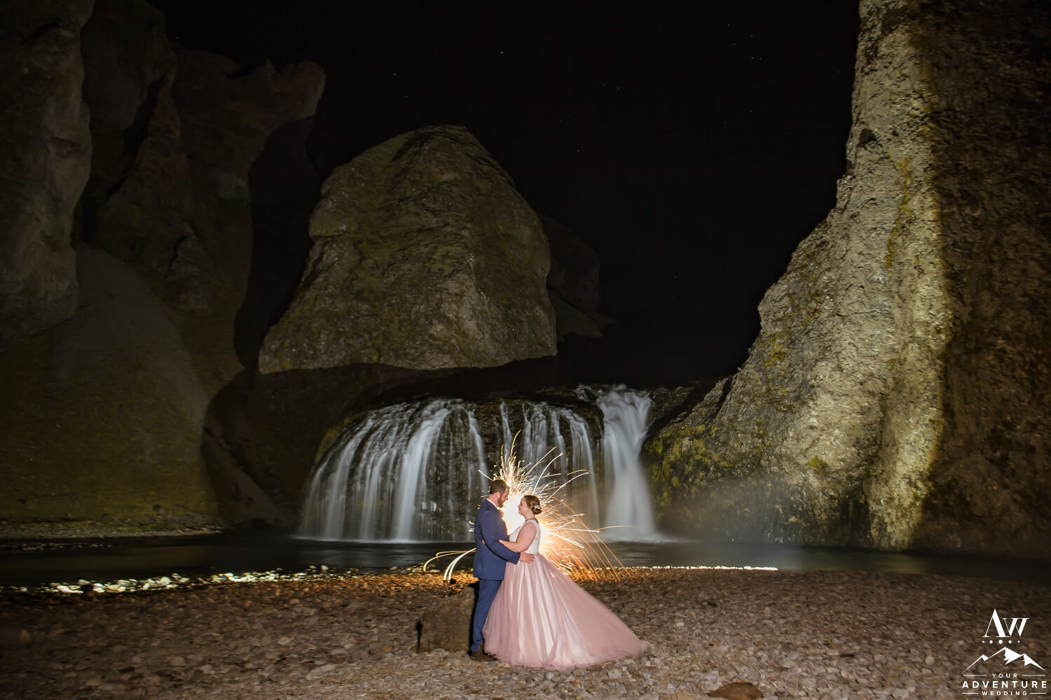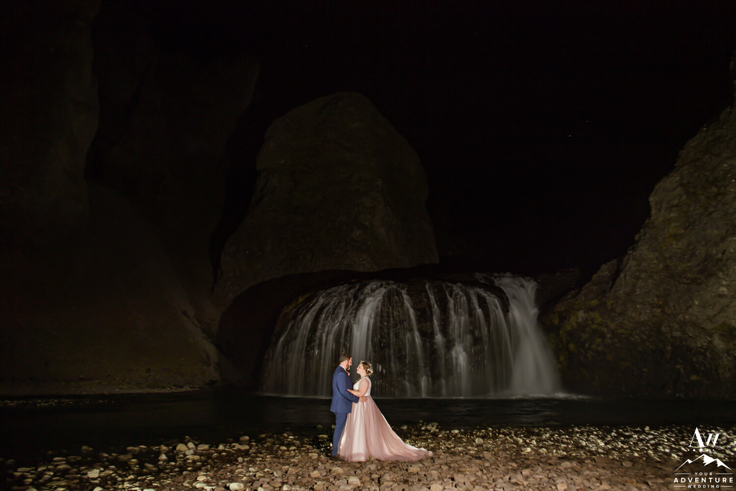 What full day October adventure wedding would be complete without head back out for the possibility of Northern Lights or ending with nighttime wedding photos?! Although there was a glimpse of Northern Lights, they didn’t stay for long and were hard to detect with the naked eye. Therefore, Jonathan and Christine were game to jump over to the nearby private property waterfall named, Stjórnarfoss (Government Waterfall) to create some nighttime magic!