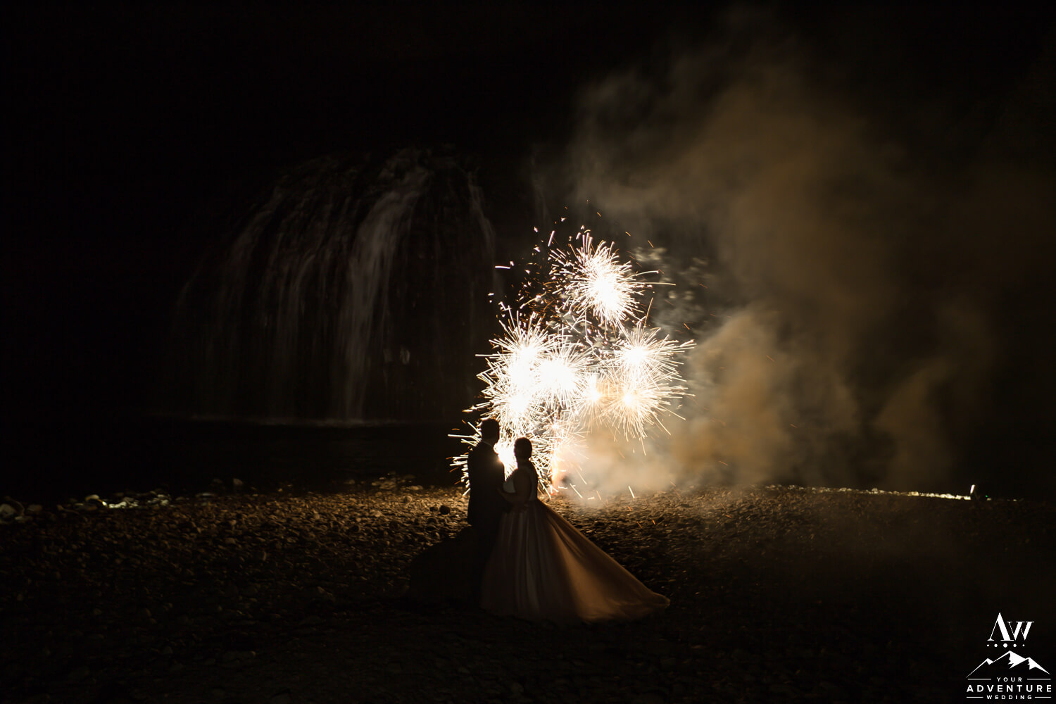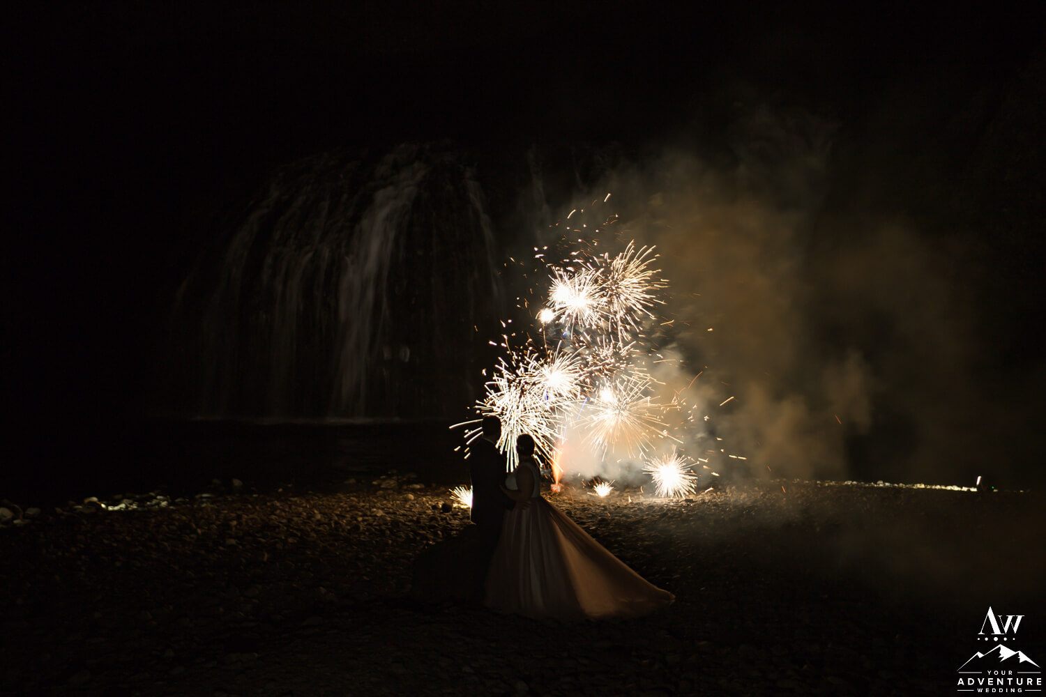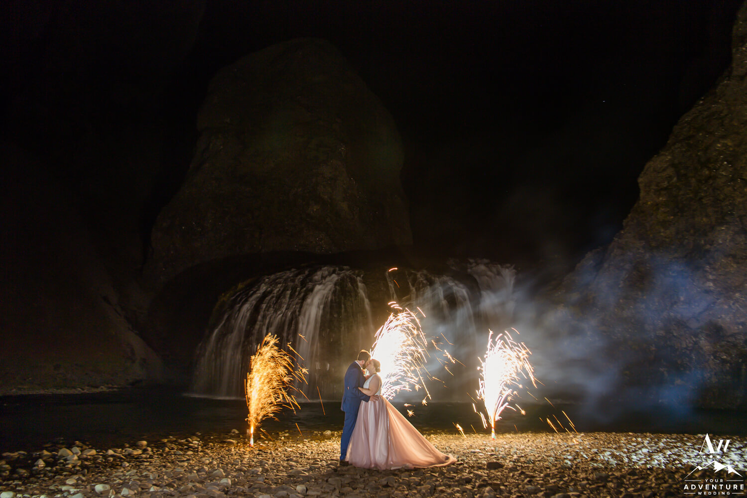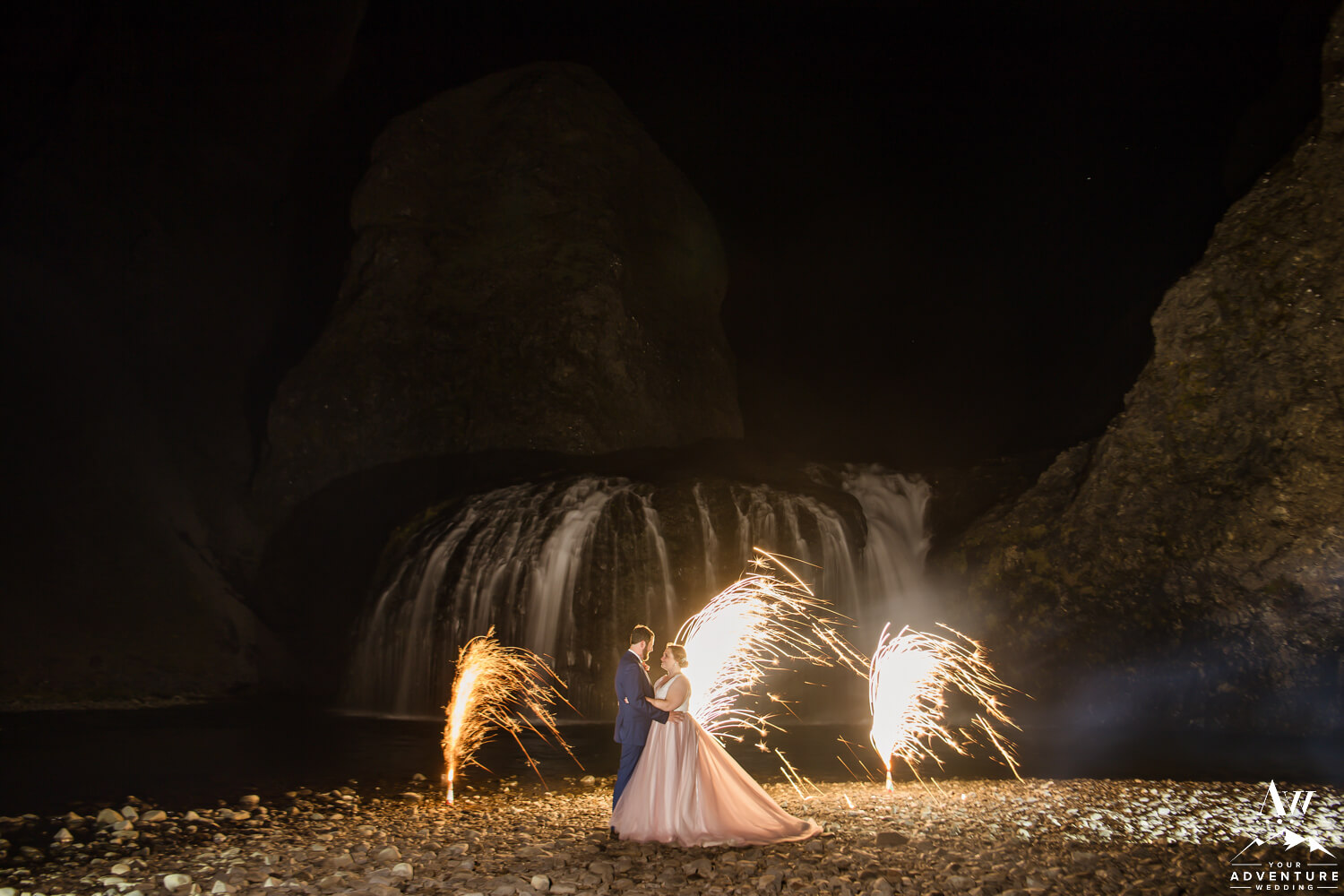 What full day October adventure wedding would be complete without head back out for the possibility of Northern Lights or ending with nighttime wedding photos?! Although there was a glimpse of Northern Lights, they didn’t stay for long and were hard to detect with the naked eye. Therefore, Jonathan and Christine were game to jump over to the nearby private property waterfall named, Stjórnarfoss (Government Waterfall) to create some nighttime magic!