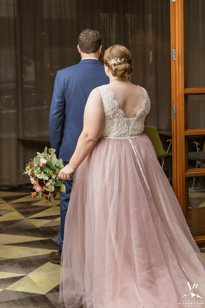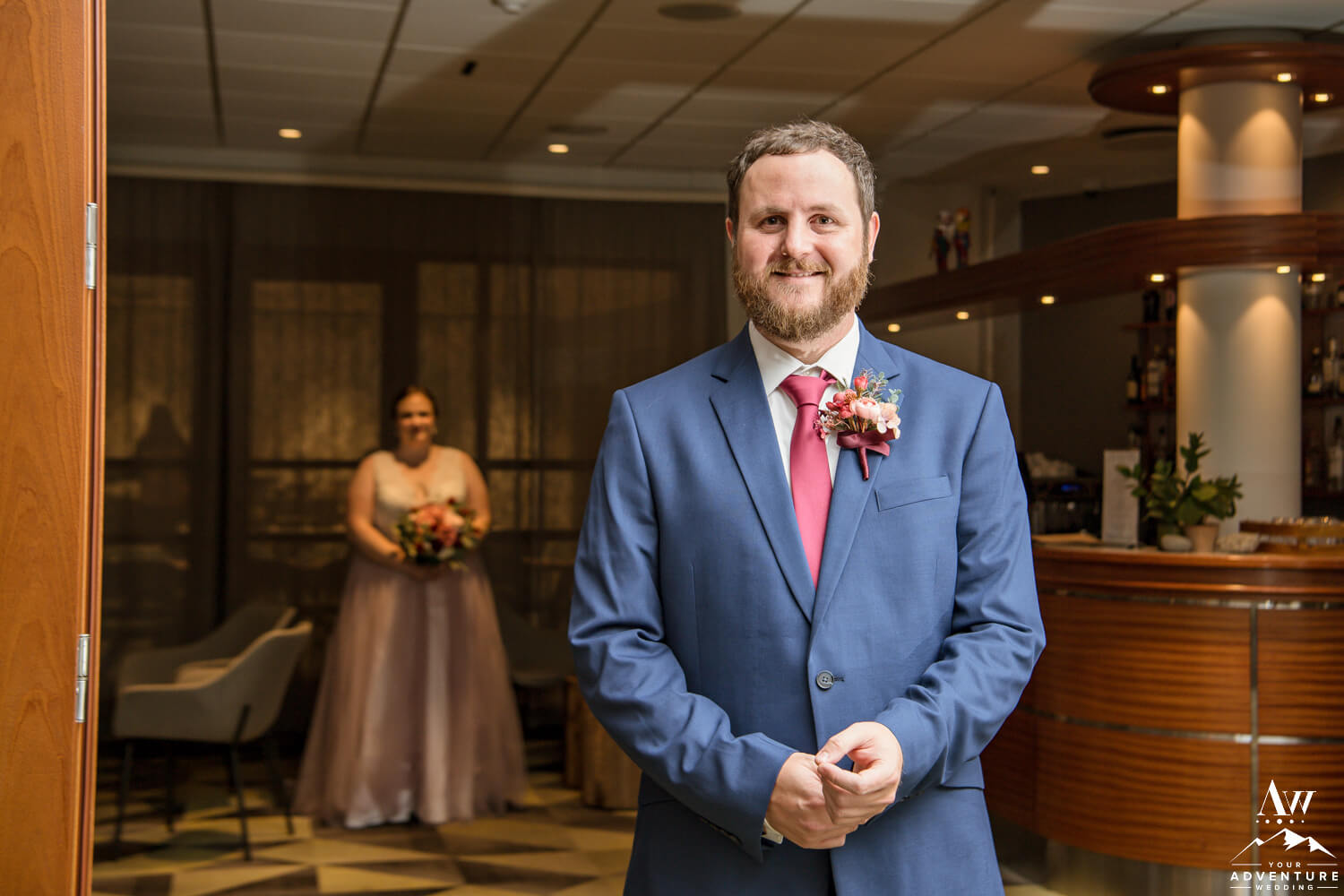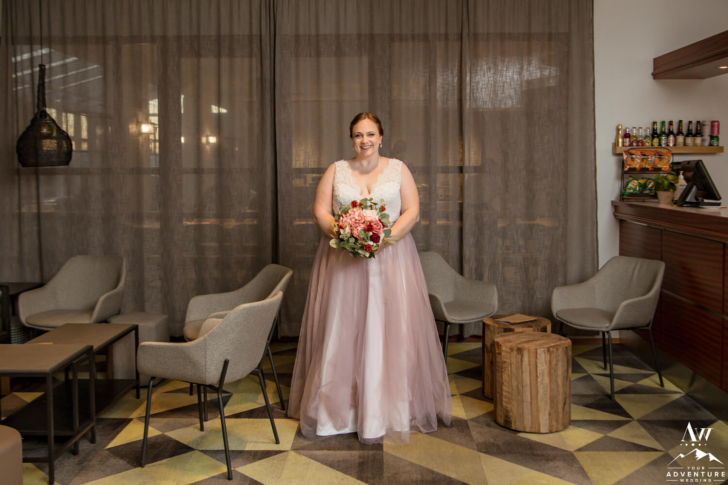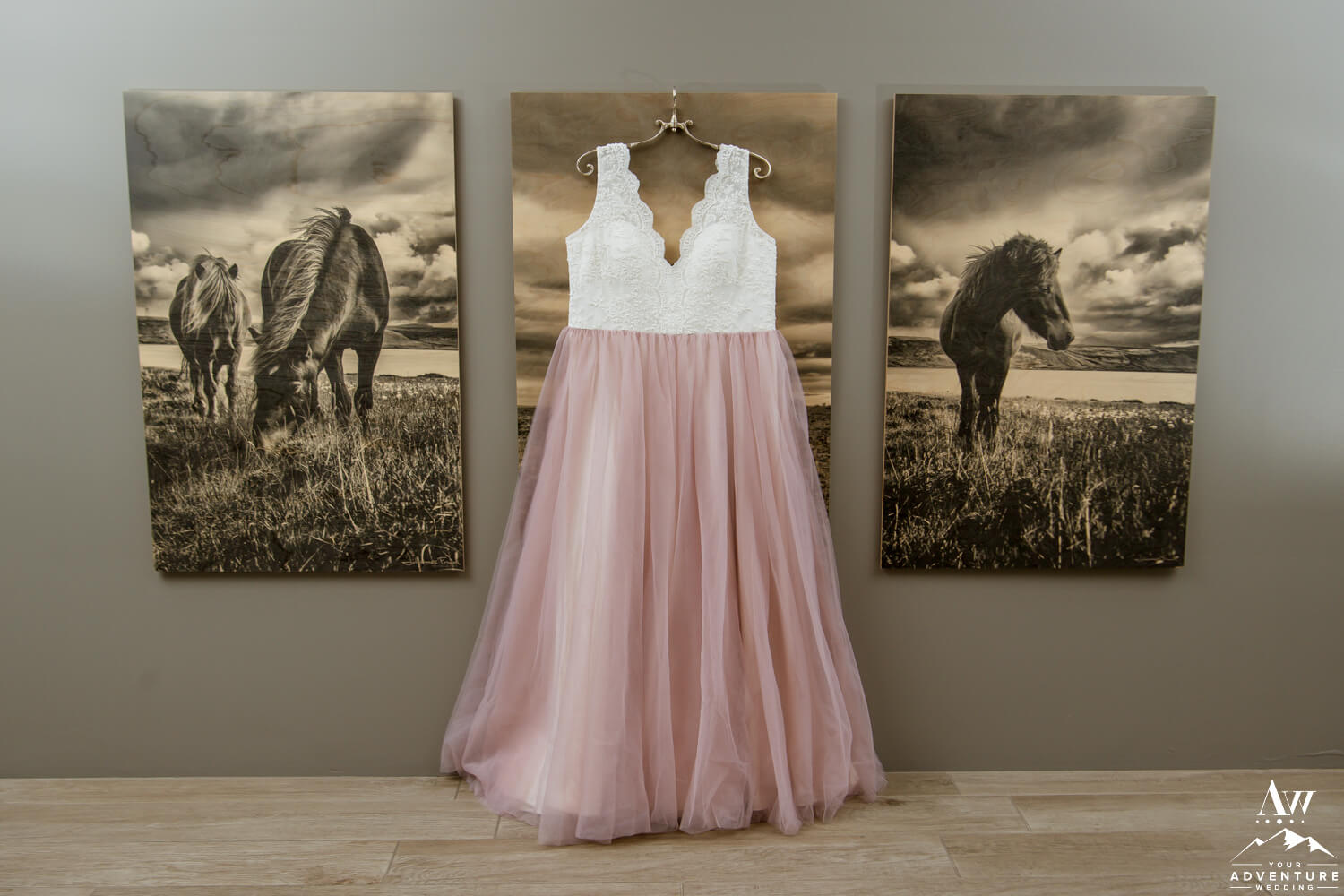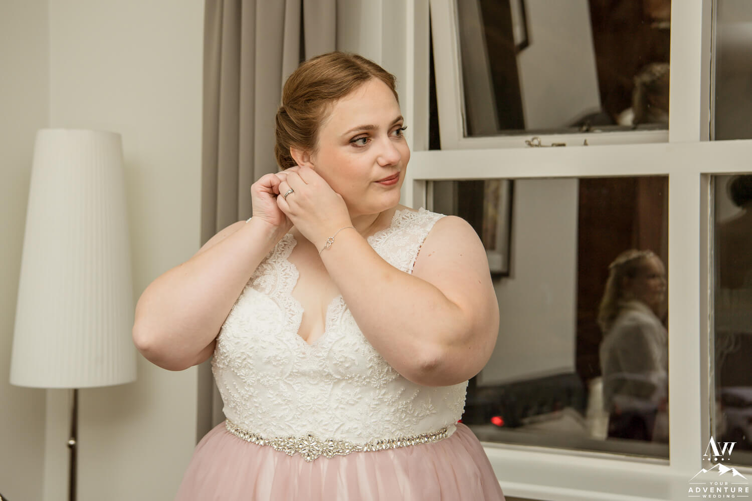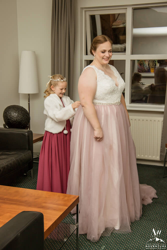 The village of Kirkjubæjarklaustur is a tiny town heading towards Southeast Iceland. In fact, it’s population is barely over 500 people. But it is a perfect place to be based in the south if you’re exploring the highlands of Iceland. Hotel Klaustur is the wedding base for Jonathan and Christine’s October adventure wedding. Well before sunrise, our hair and makeup artists and Iceland wedding photographer got to work. To illustrate, below you’ll see how fabulous Christine’s pink Iceland wedding dress is along with Jonathan’s dapper groom details. Additionally, right before the group loaded into the super jeep the soon-to-be newlyweds have a quick first look!