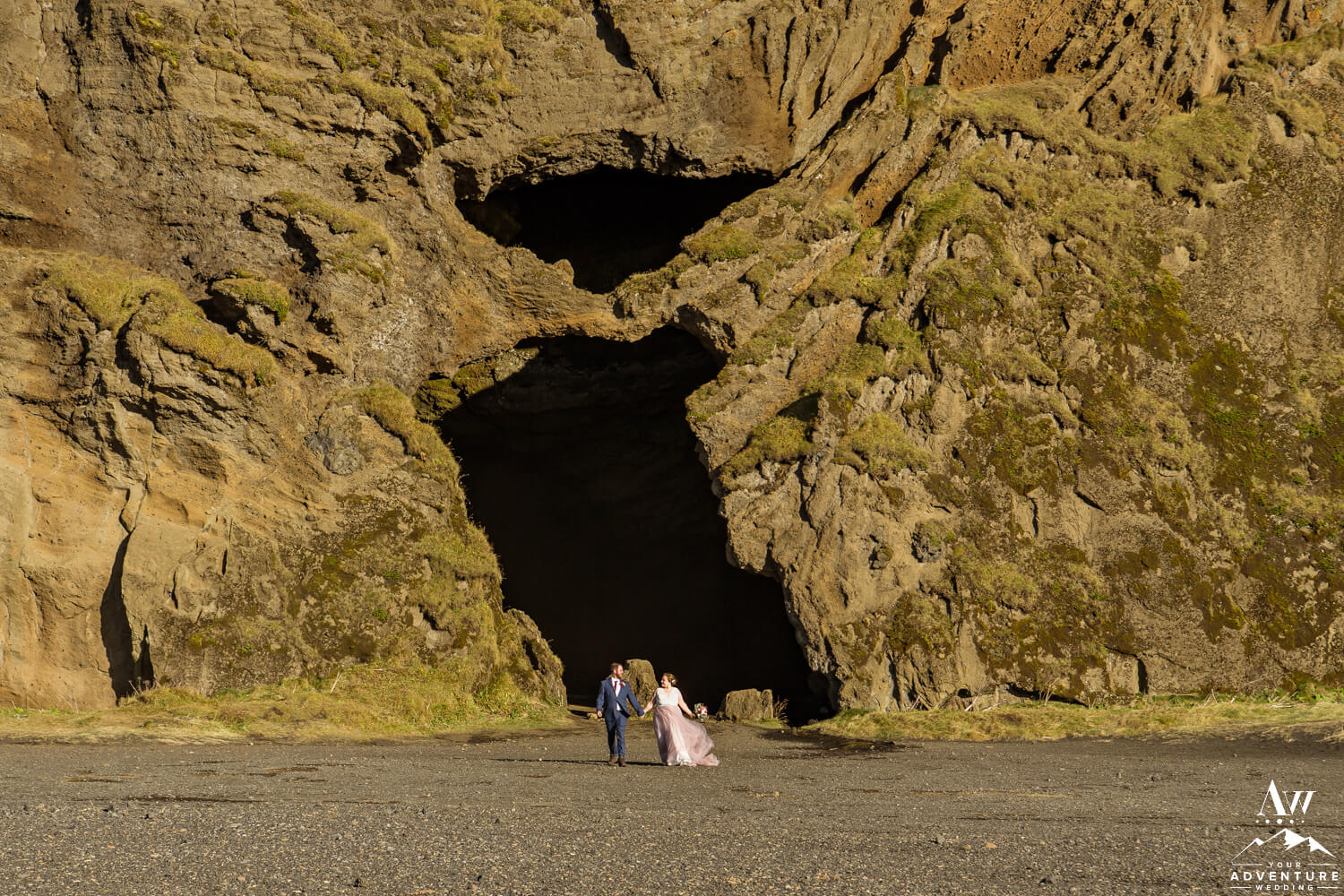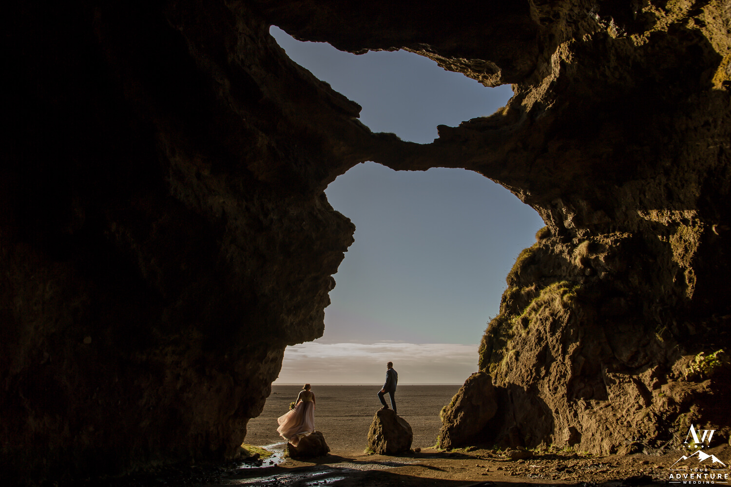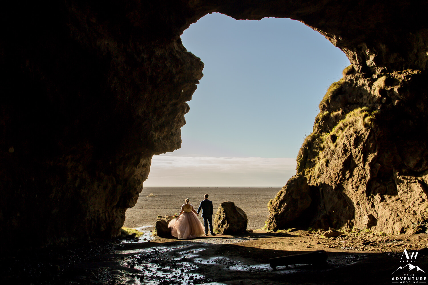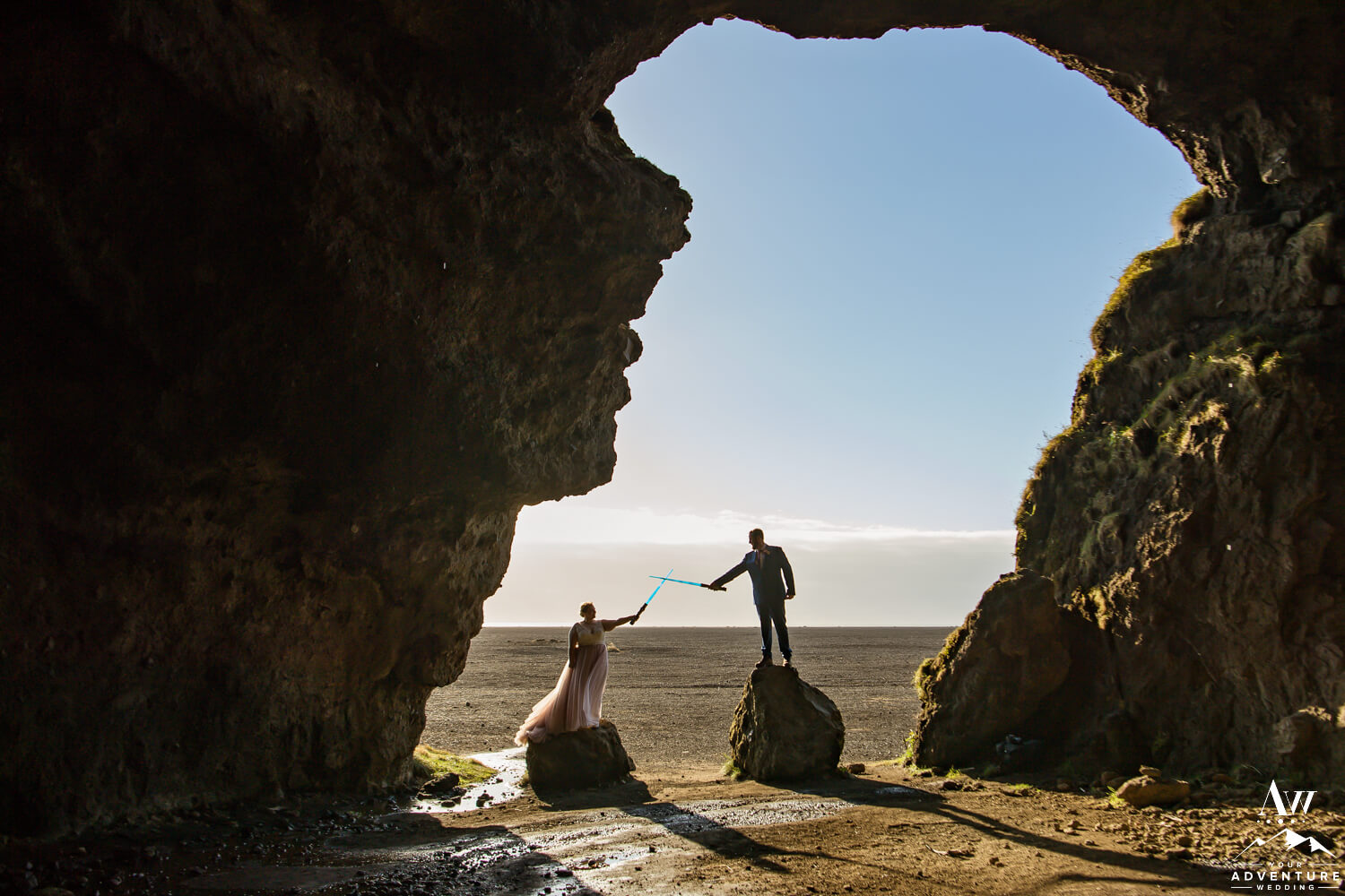 Meanwhile the October adventure wedding itinerary brought us next to the famed “Yoda Cave” (aka Gígjagjá or Hjörleifshöfði). Why? Well for a Viking style toast, Icelandic hot dog BBQ, discovery of the cave inside and out! The newlyweds and the kids may or may not have had a light saber fight within! After all we are at times, all kids at heart!