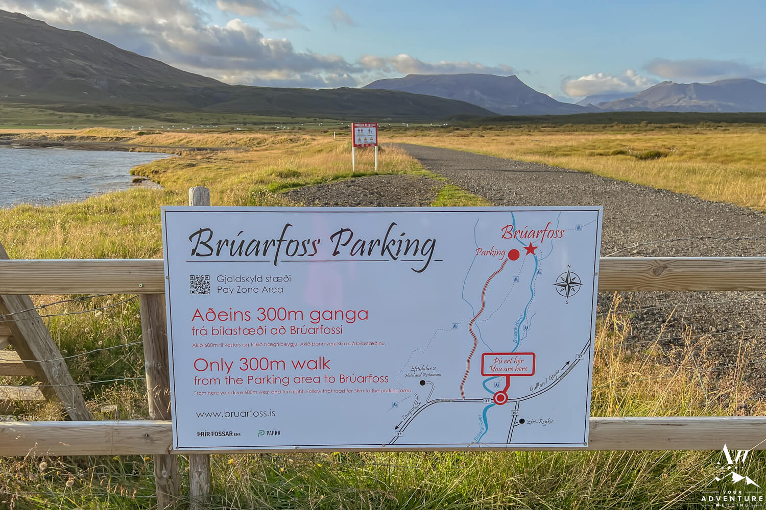 - Sign showing you where the no hike parking lot is for Brúarfoss Waterfall.