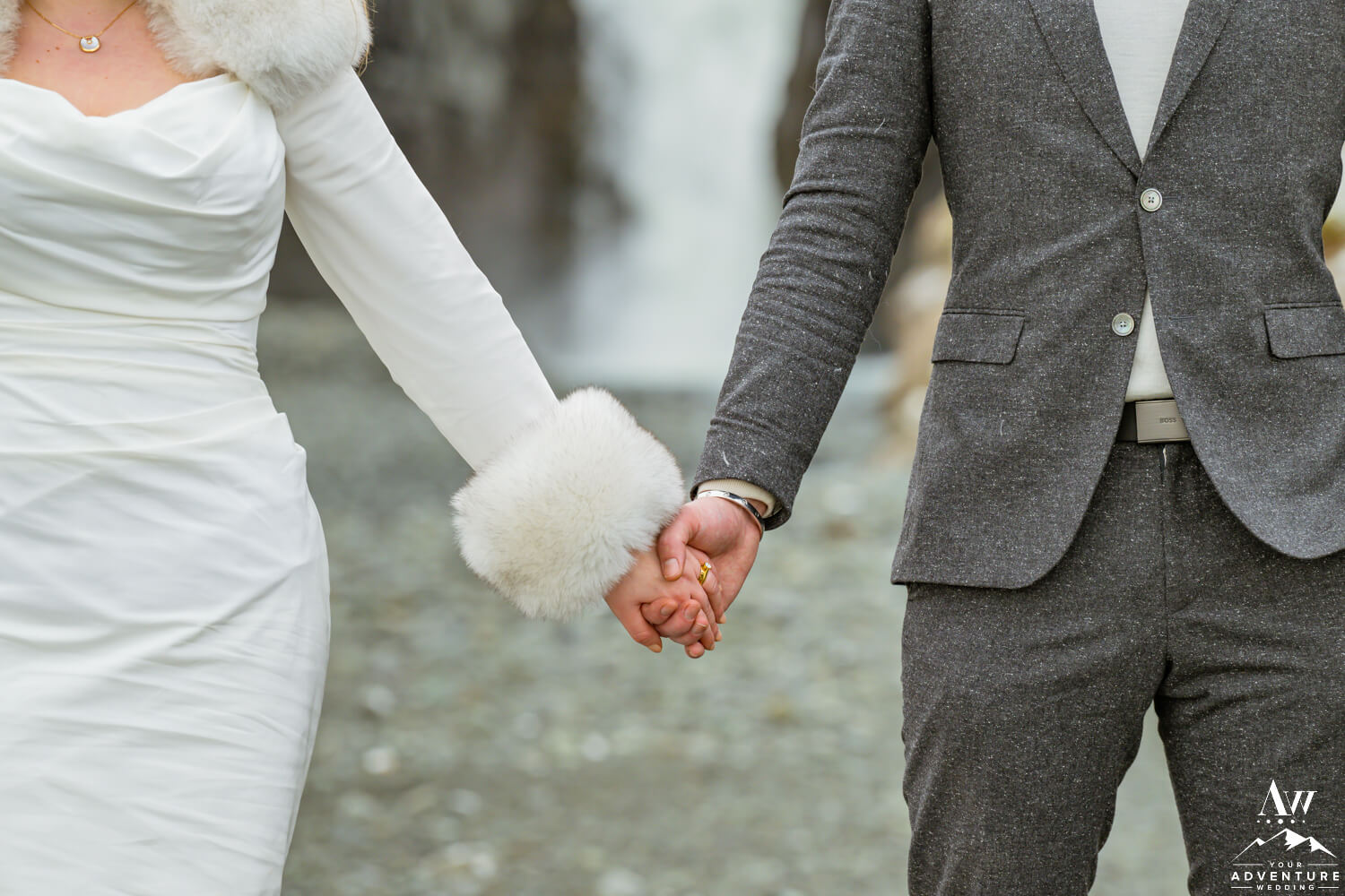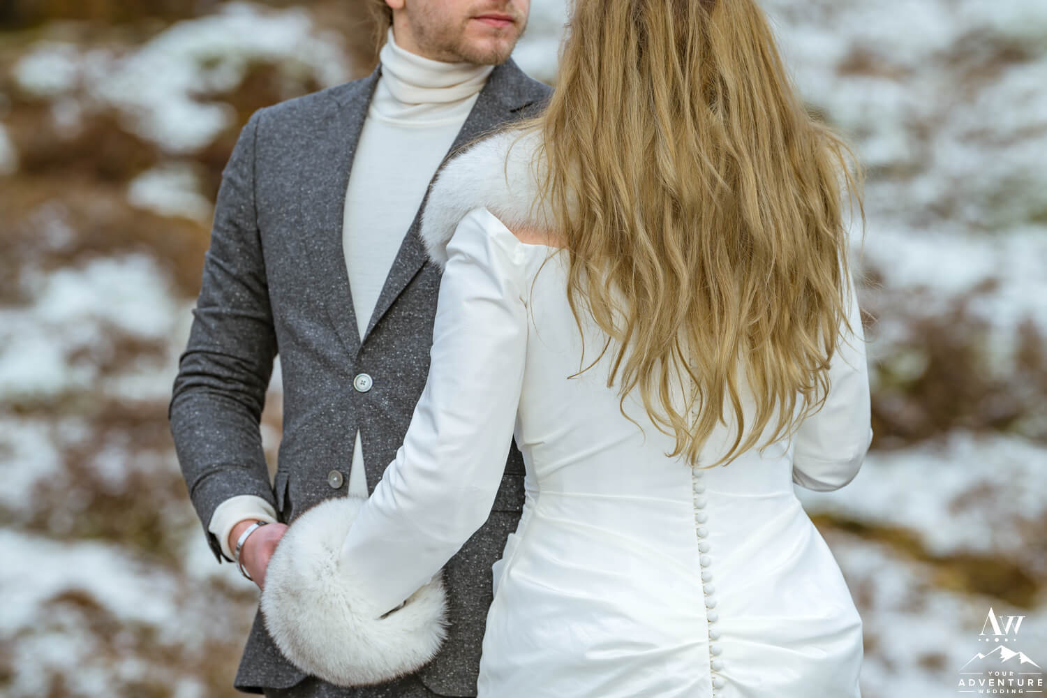 The morning of February 15th 2023, began at our favorite Southeastern hotel, Fosshotel Glacier Lagoon in the Executive Suite (hello private hot tub!)!  Eva and Peter decided to get ready together privately.  But our Iceland elopement photographer went to work documenting all of the beautiful details.  For instance, Eva’s custom dress (designed by Angelina Collarusso), both had jewelry from Cartier, and of course Peter’s handsome wool suit!  Just before 8am the soon to be newlyweds loaded into the super keep to embark on their Vatnajökull elopement adventure!