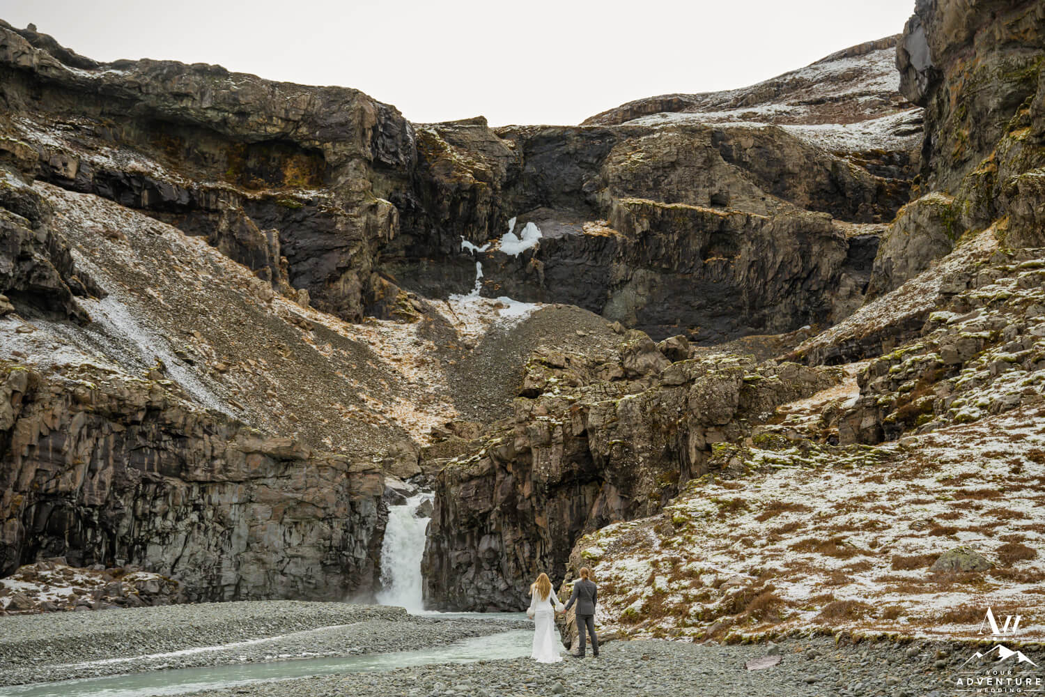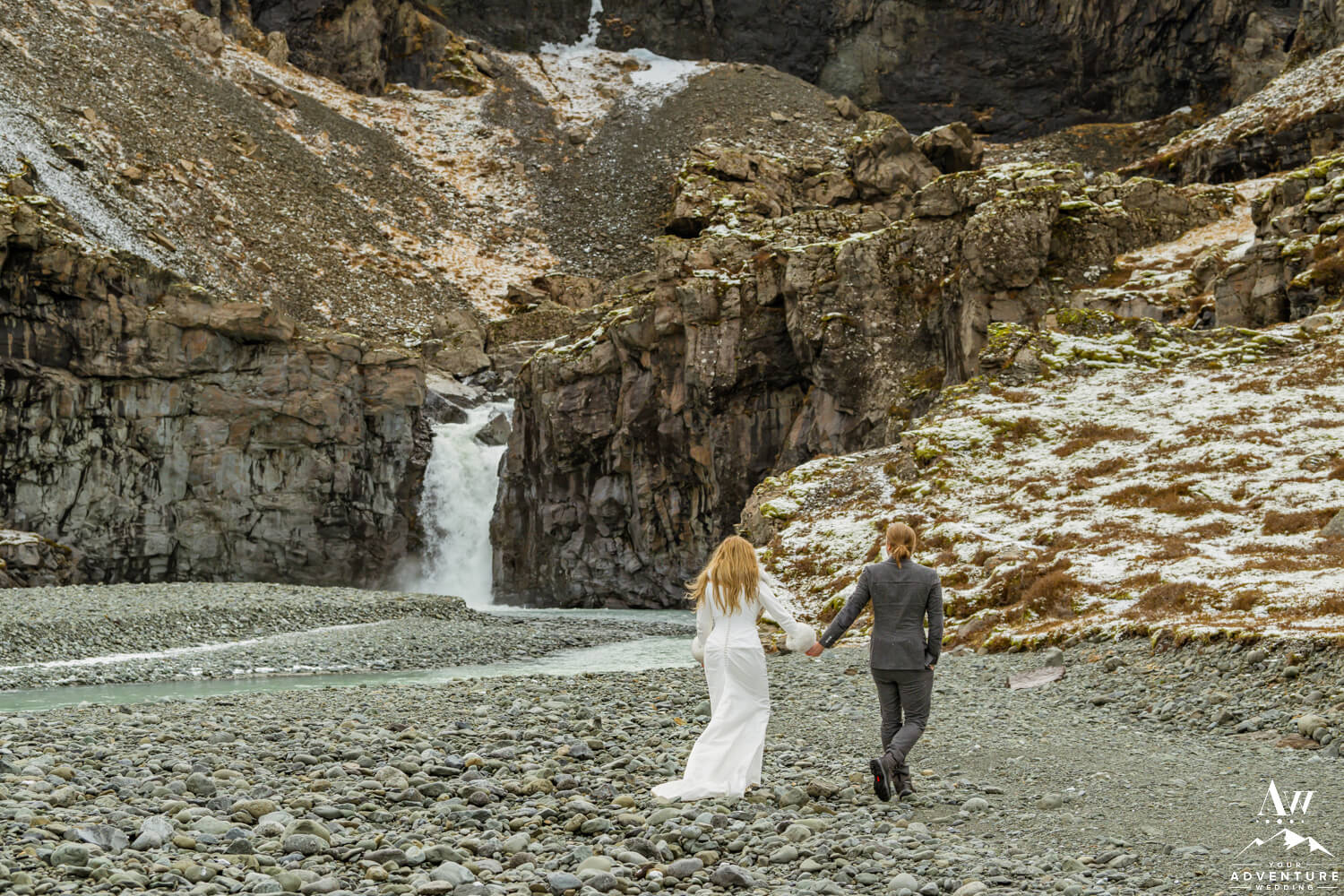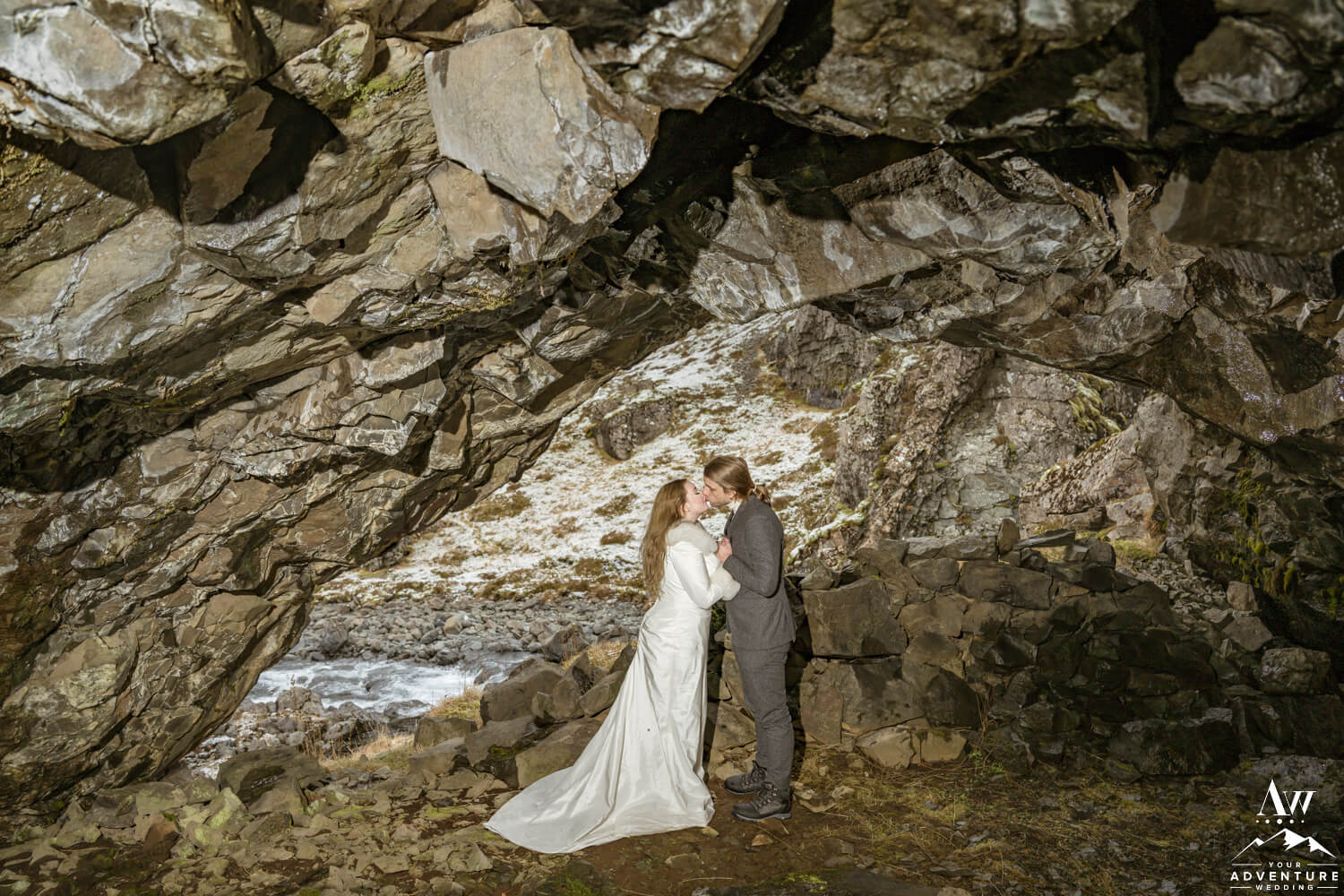 Additionally, there is not a huge list of Iceland wedding locations that bewilder us each time we visit.  However, this crazy blue narrow canyon and sheep cave surprises every single time.  Whether it be the water levels, the sheep, the colors, the history, the season, etc.  It’s a really enchanting place!  Plus it’s  perfectly paired place within a Vatnajökull elopement itinerary.  Our daring newlyweds even had the opportunity to give waders a go for further exploration!