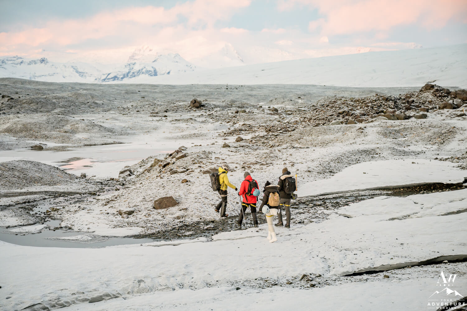 After about an hour or so drive, they arrived to the glacier outlet named, Breiðamerkurjökull to begin their hiking elopement.  It was really freaking magical to watch the dawn turn into a glorious sunrise!  Hiking slightly more than 1 hour, brought them to a stunning ice moulin.  Truly a perfect setting for their Vatnajökull elopement ceremony!  Eva and Peter’s private and intimate blue ice ceremony was led by our favorite Pastor Halli.