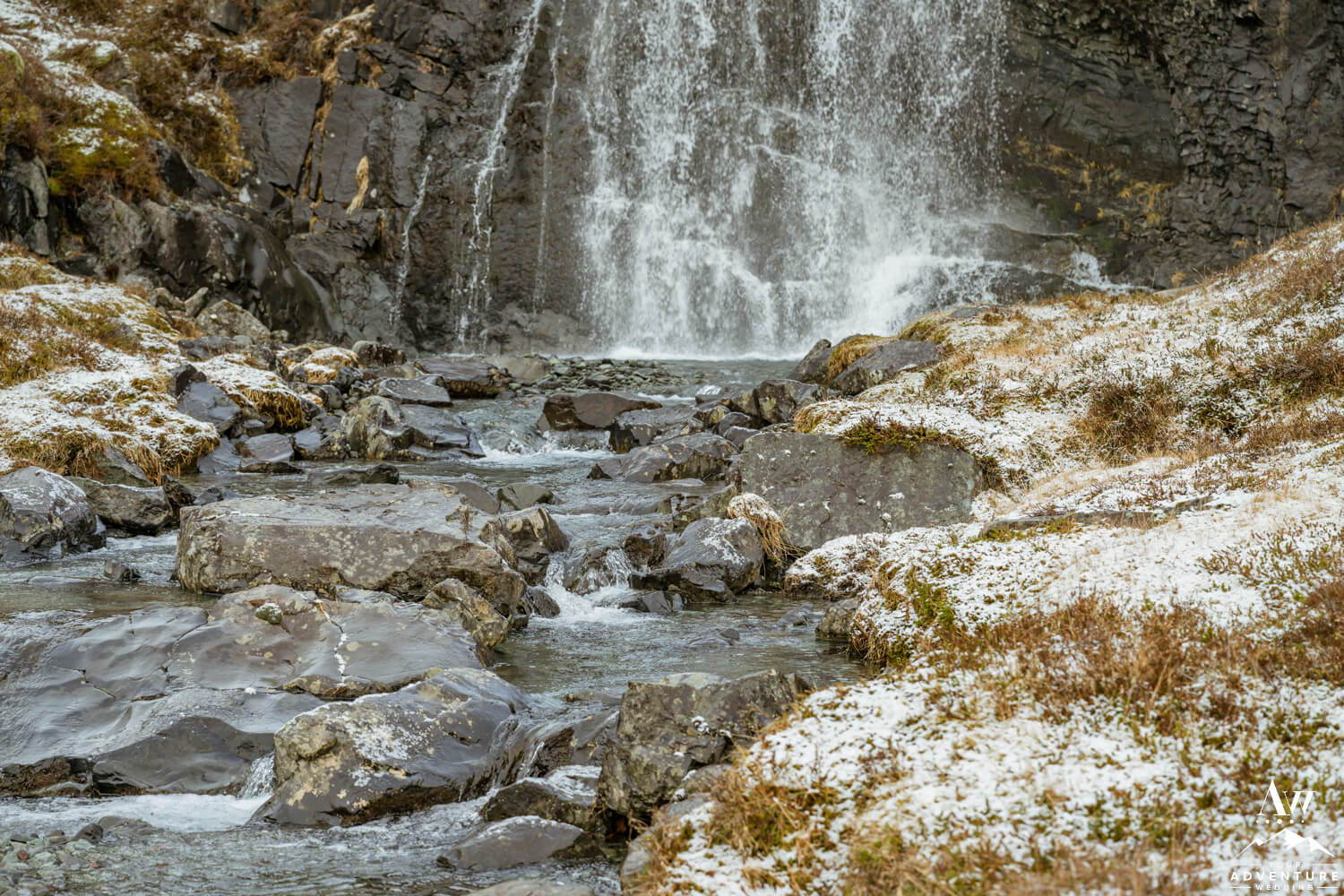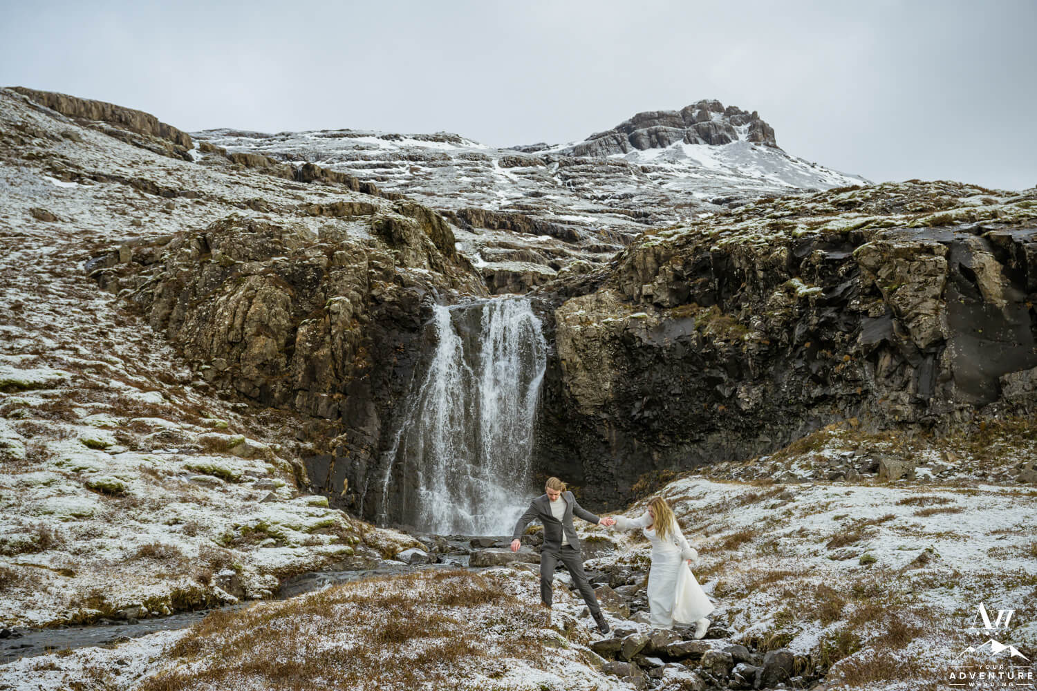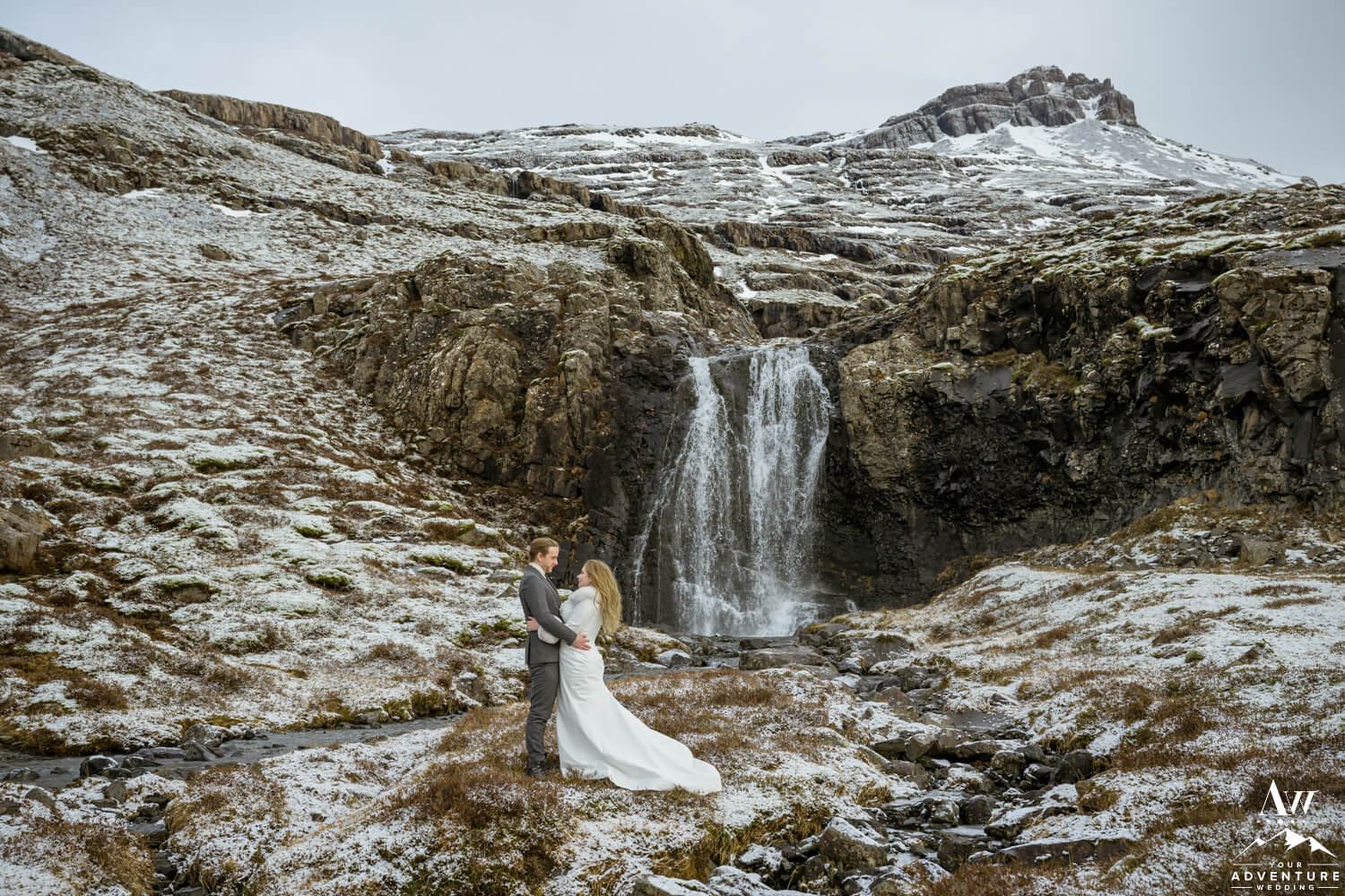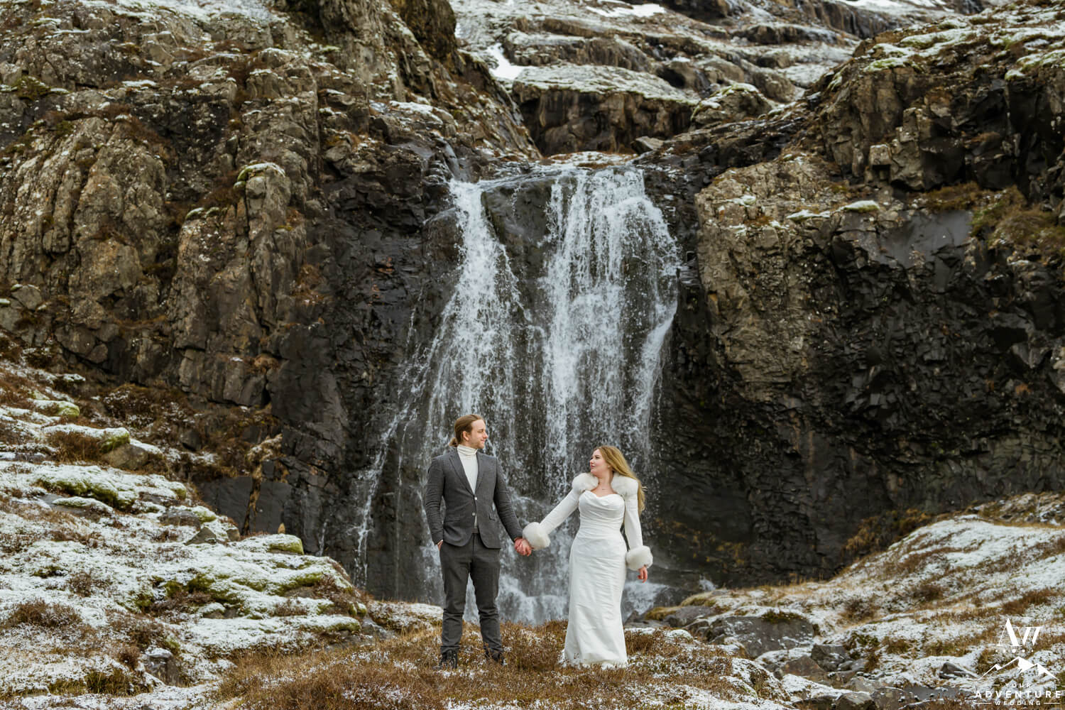 A small snowy waterfall was also on their Vatnajökull elopement schedule.  In fact, it even drew a 5 senses experience!  For example, the air smelled crisp and clean, the crunchy snow was heard on the hike, everyone was surprised to see that it wasn’t frozen, the spring fed water tasted incredible cold and fresh!  Peter and Eva looked like models in front of this amazing place!