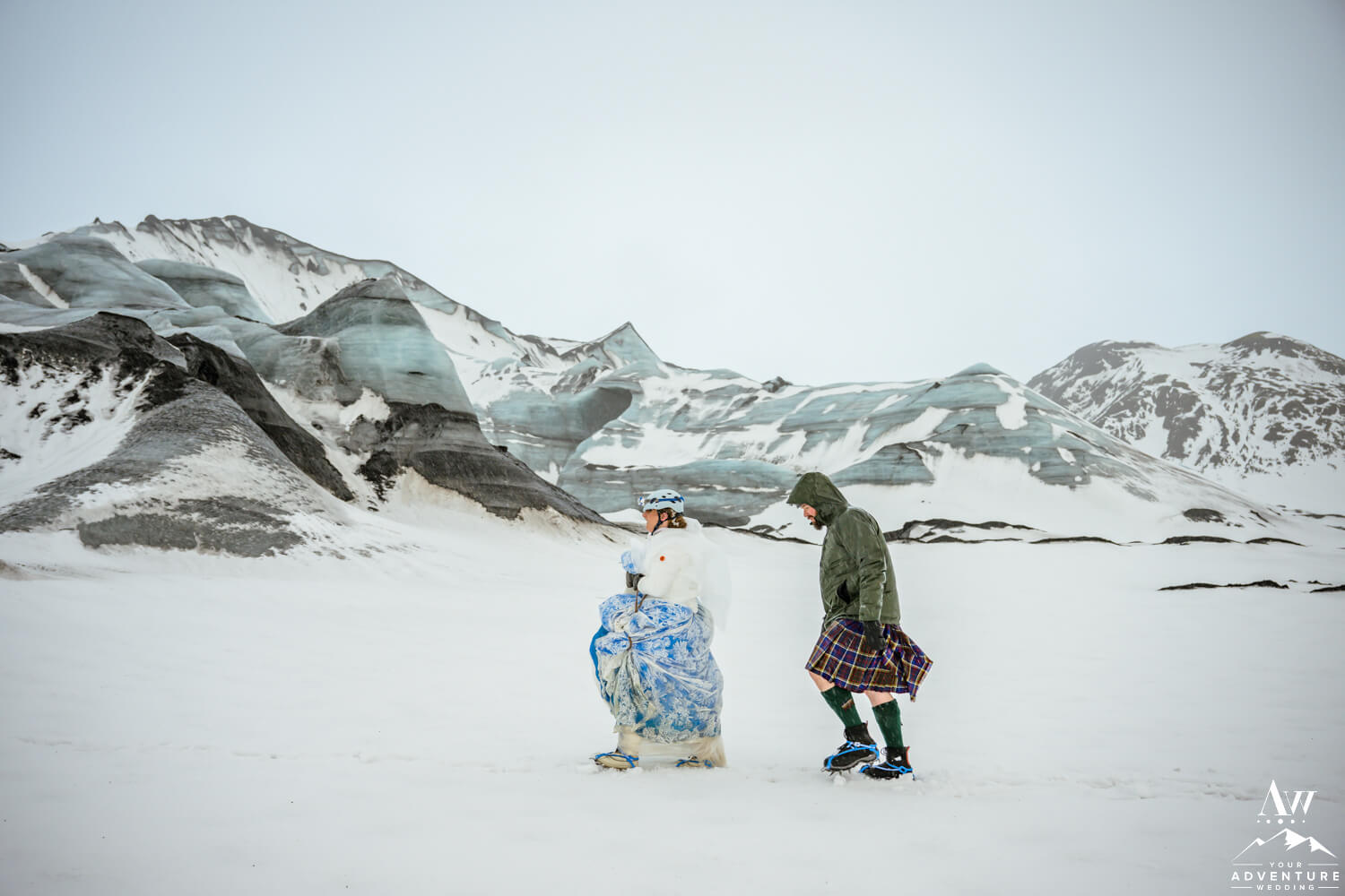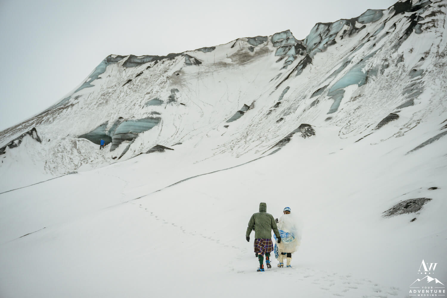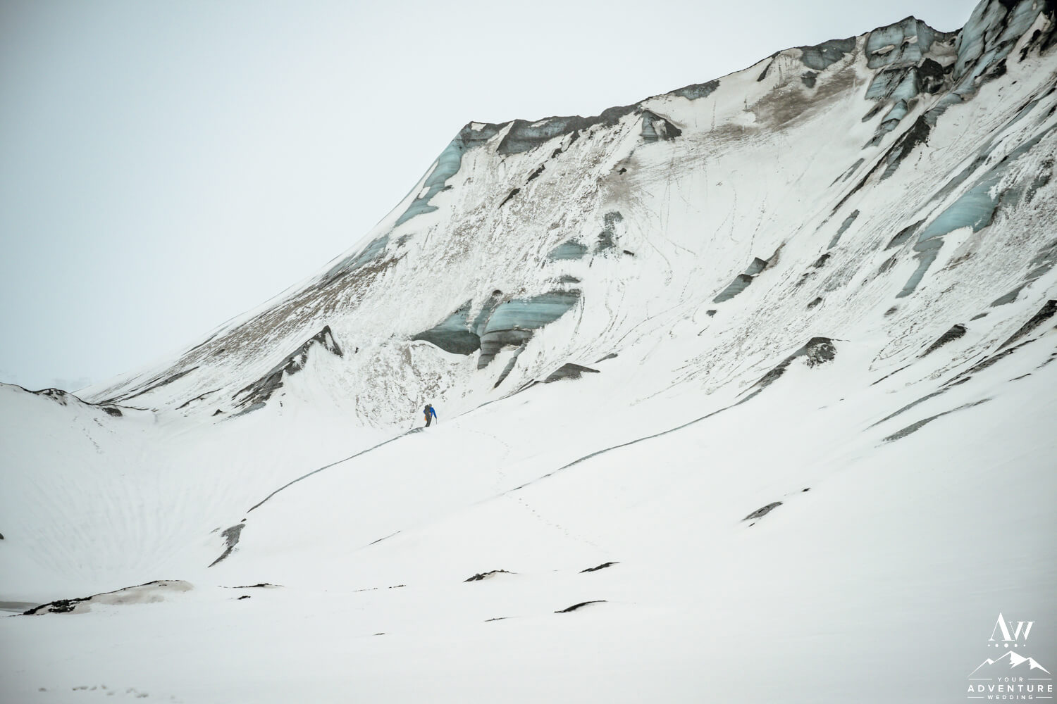 Earlier we alluded to how the weather can be pretty extreme in February in Iceland. That evening, they were calling for the weather to change and become pretty windy and gnarly. Since the prospect for Northern Lights were null, Alfred and Elizabeth were on board to move up their nighttime immersive wedding experience to be at dusk. Therefore, the hike continues over to the touristy Katla Ice Cave…