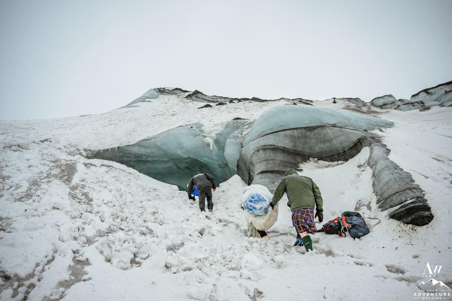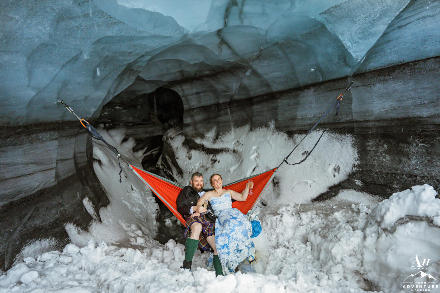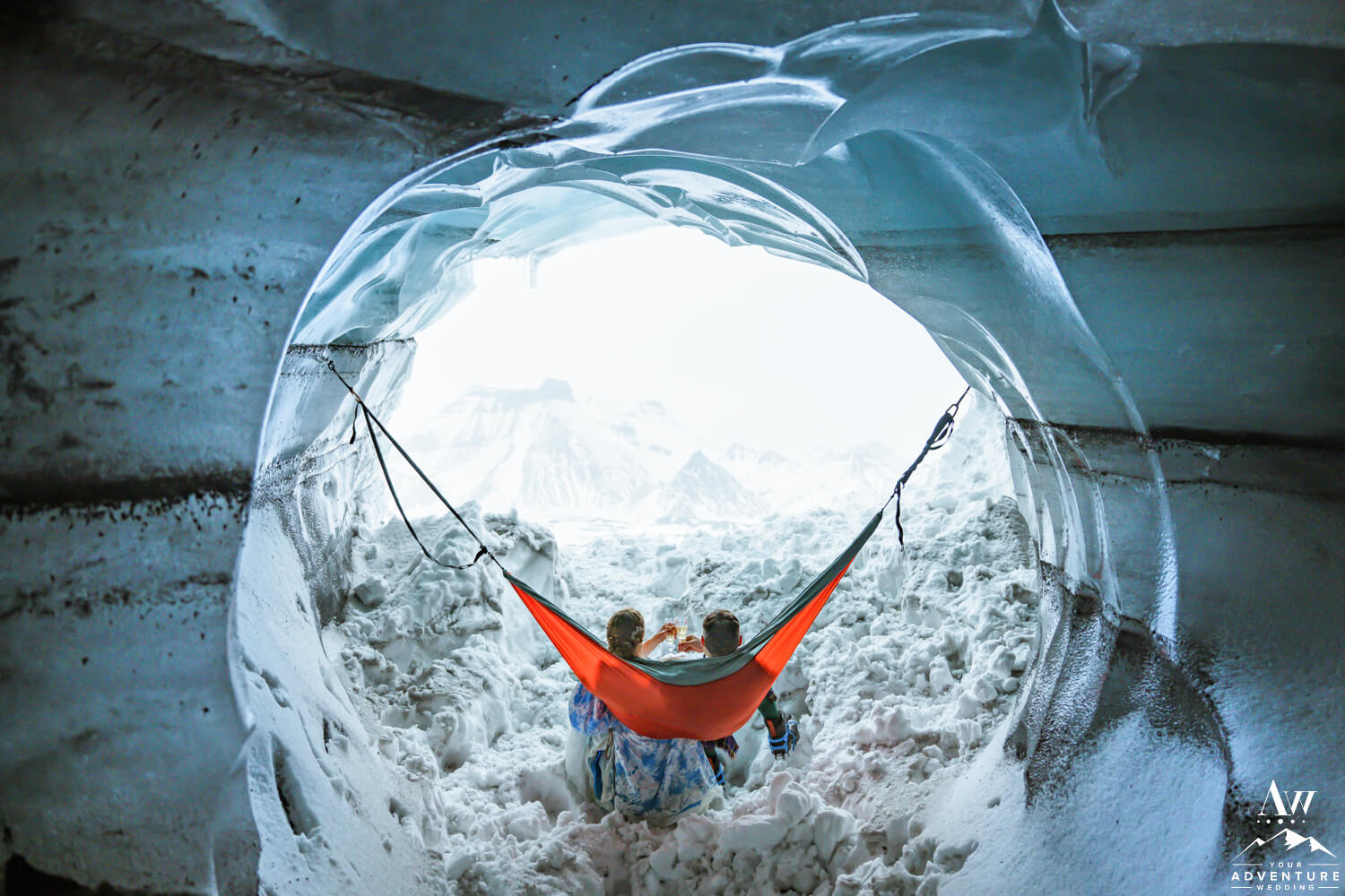 Okay, so if you know our Iceland Wedding Planner team, you know we crave a good challenge and love pushing the limits on what hasn’t been done before. Especially in ice caves! For instance, you might remember the floral swing we put up in an ice cave? Therefore, when Elizabeth and Alfred told us they were “up for anything” we obliged and put up a hammock inside an ice cave! To somehow make it even better, we surprised them with a glass of champagne. Because the heck not?! After all, a milestone like this should be freaking celebrated!